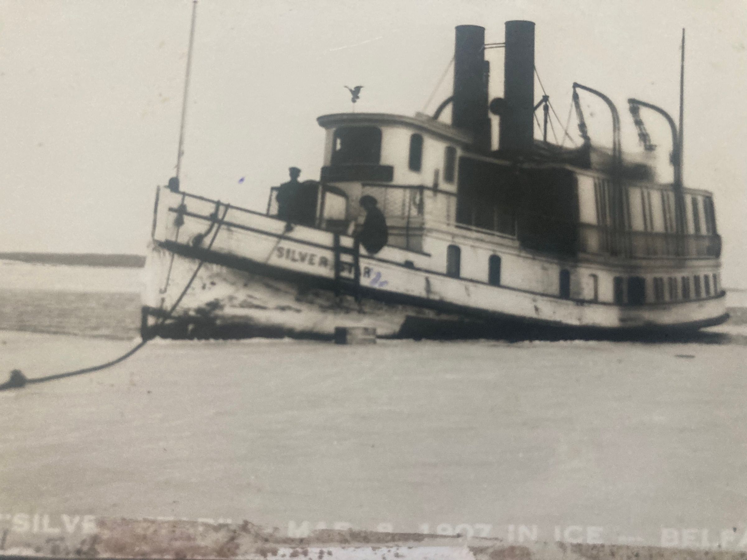 "Goldenrod" and "Silver Star" caught in the ice, Belfast, March 8, 1904 [Harry P. Pendleton took tickets; Captain S__idge?]