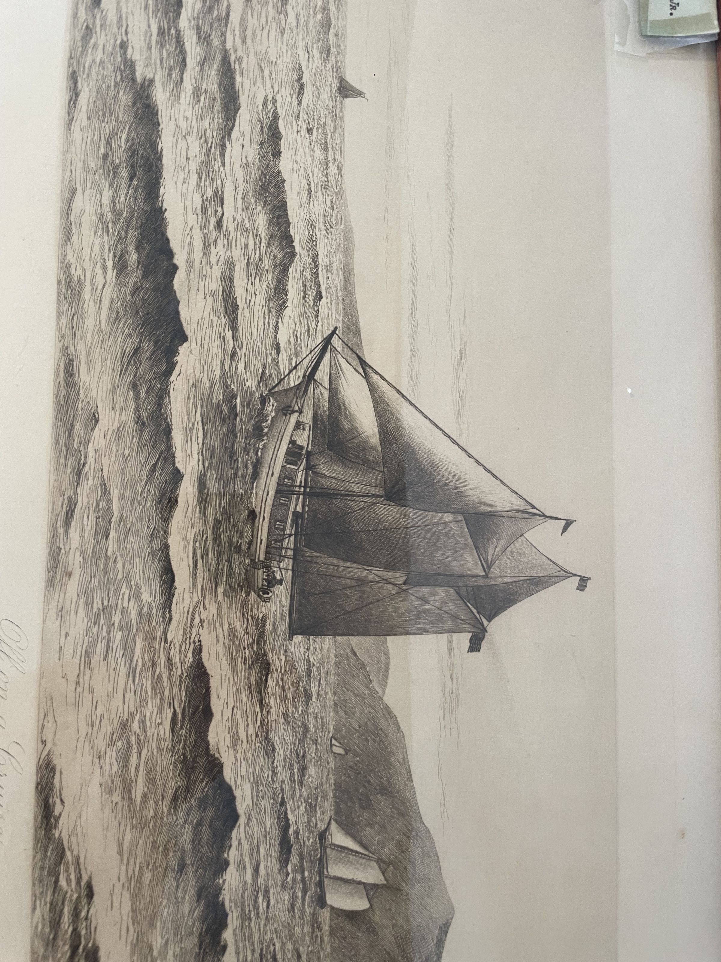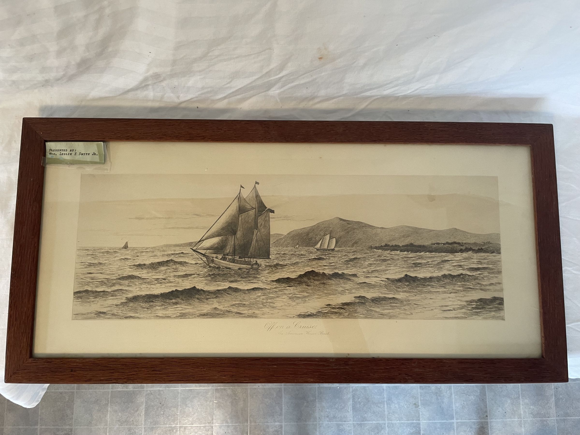 A framed Lithograph of a sail boat cruising through the water, there are three other boats sailing in the distance.