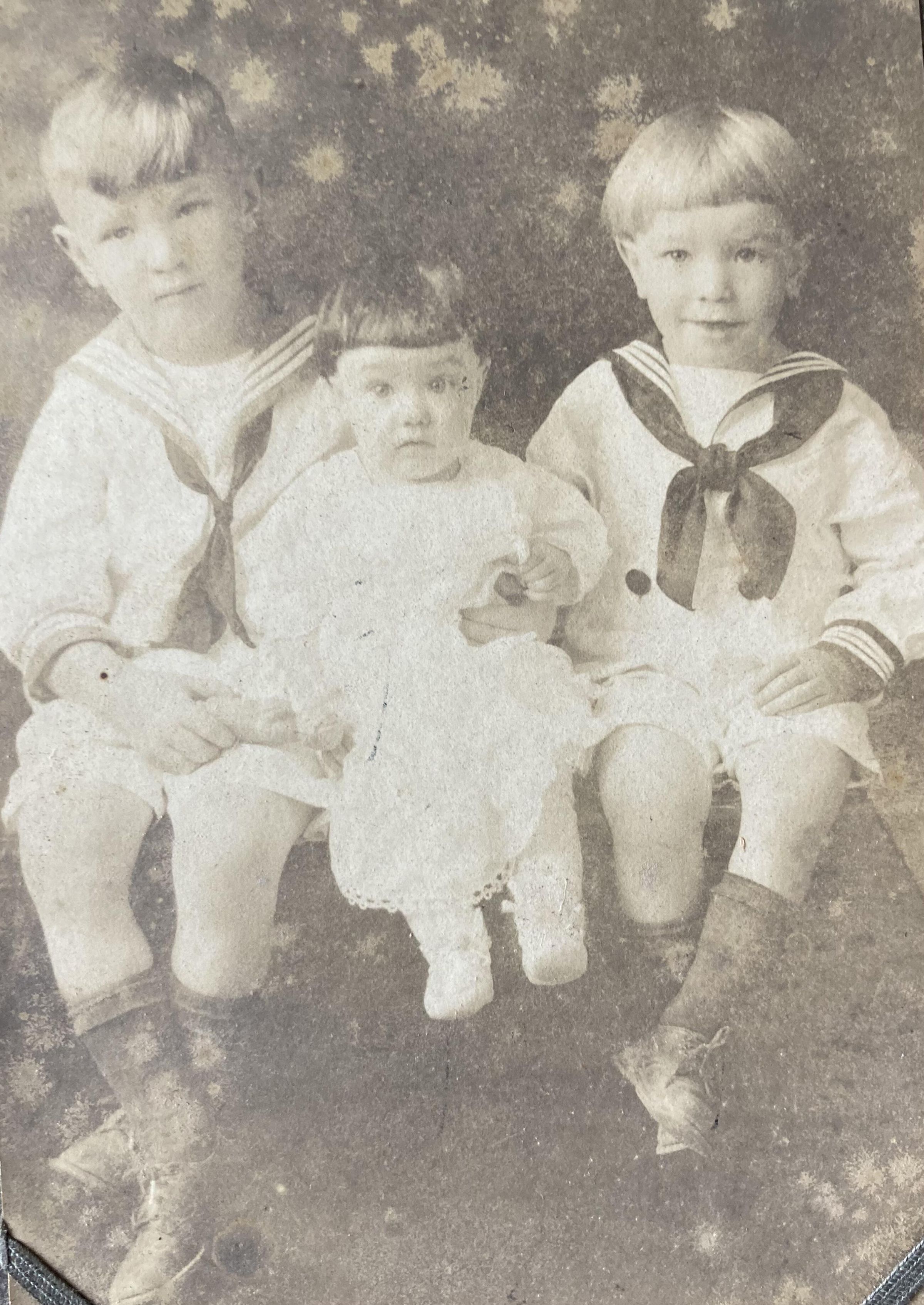 Studio portrait of three children, two boys in sailor suits and their baby sister. Connection to Islesboro not clear, but part of the Marcellus Williams bequest. Photograph somewhat damaged by mold. Sitters are identified on verso of the cardboard frame.
