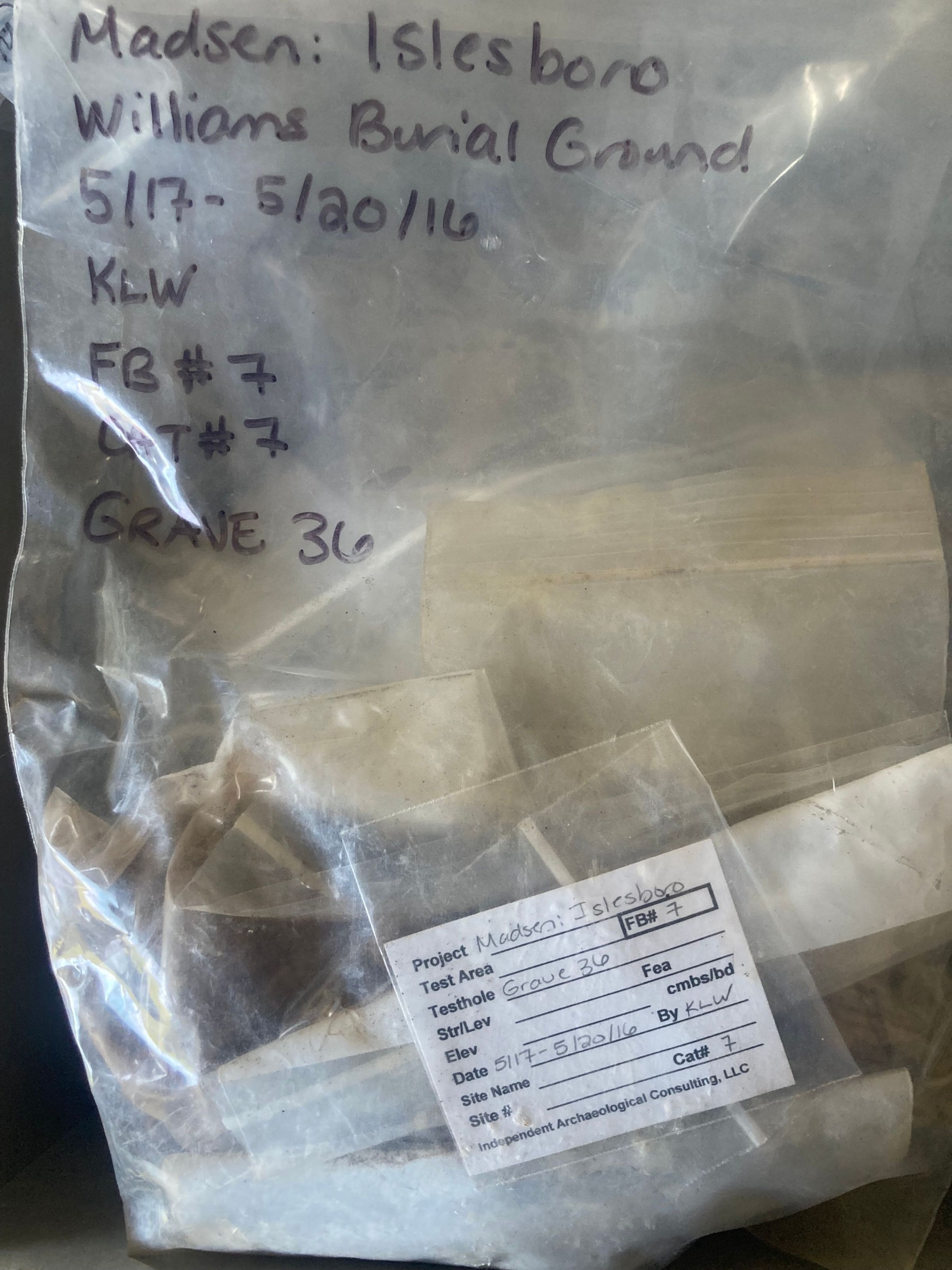 Artifacts from the Shubael Williams burying ground excavated by Independent Archaeological Consultants (IAC) on property currently owned by the Selendy family. The material includes nails, buttons, hinges, cloth, stone fragments. The artifacts were excavated in 2016 to identify the location of an unmarked burial ground at Crow Cove. The report on the survey is cataloged as 2025.003.001 and includes a CD and printed inventory.