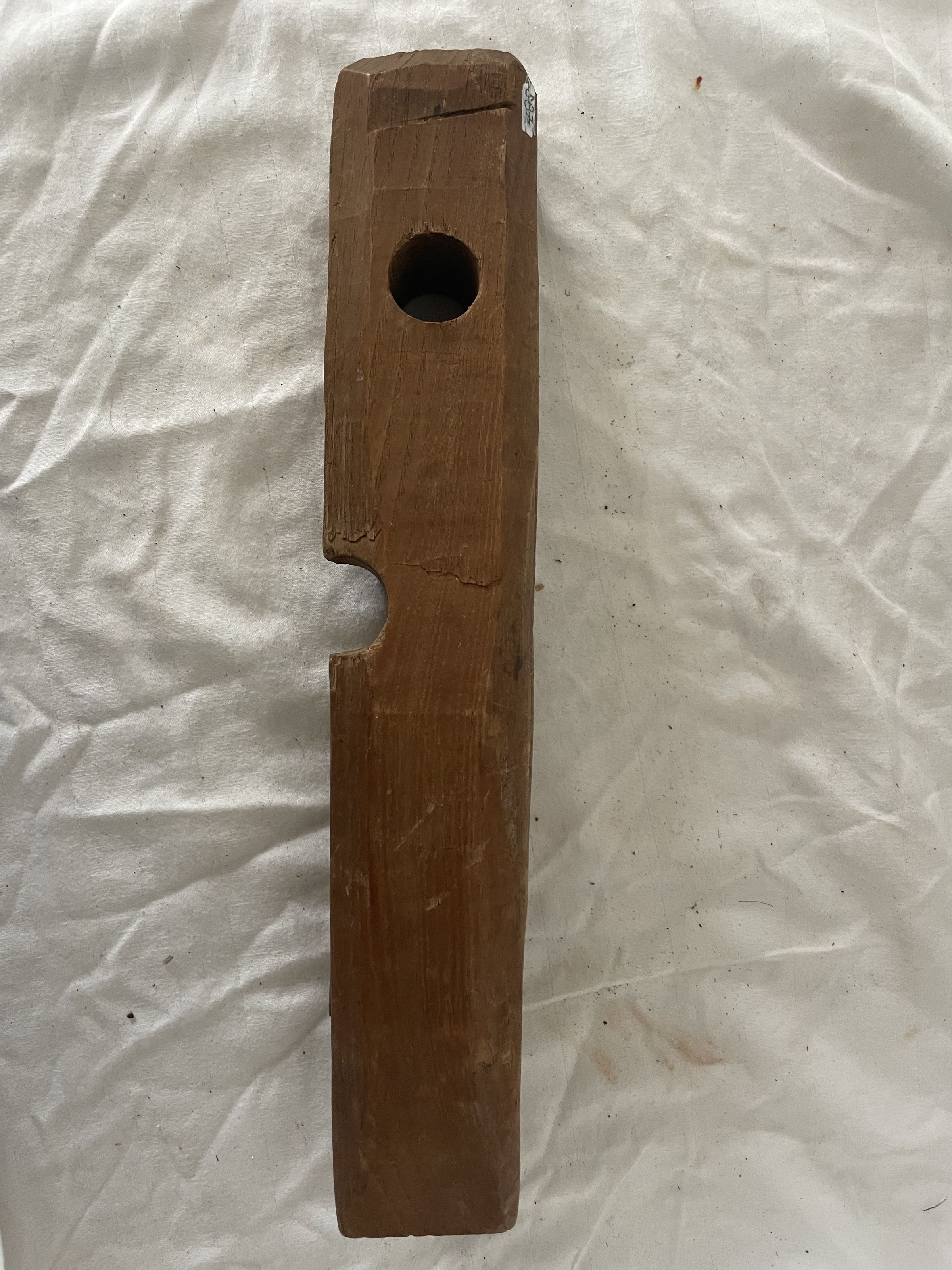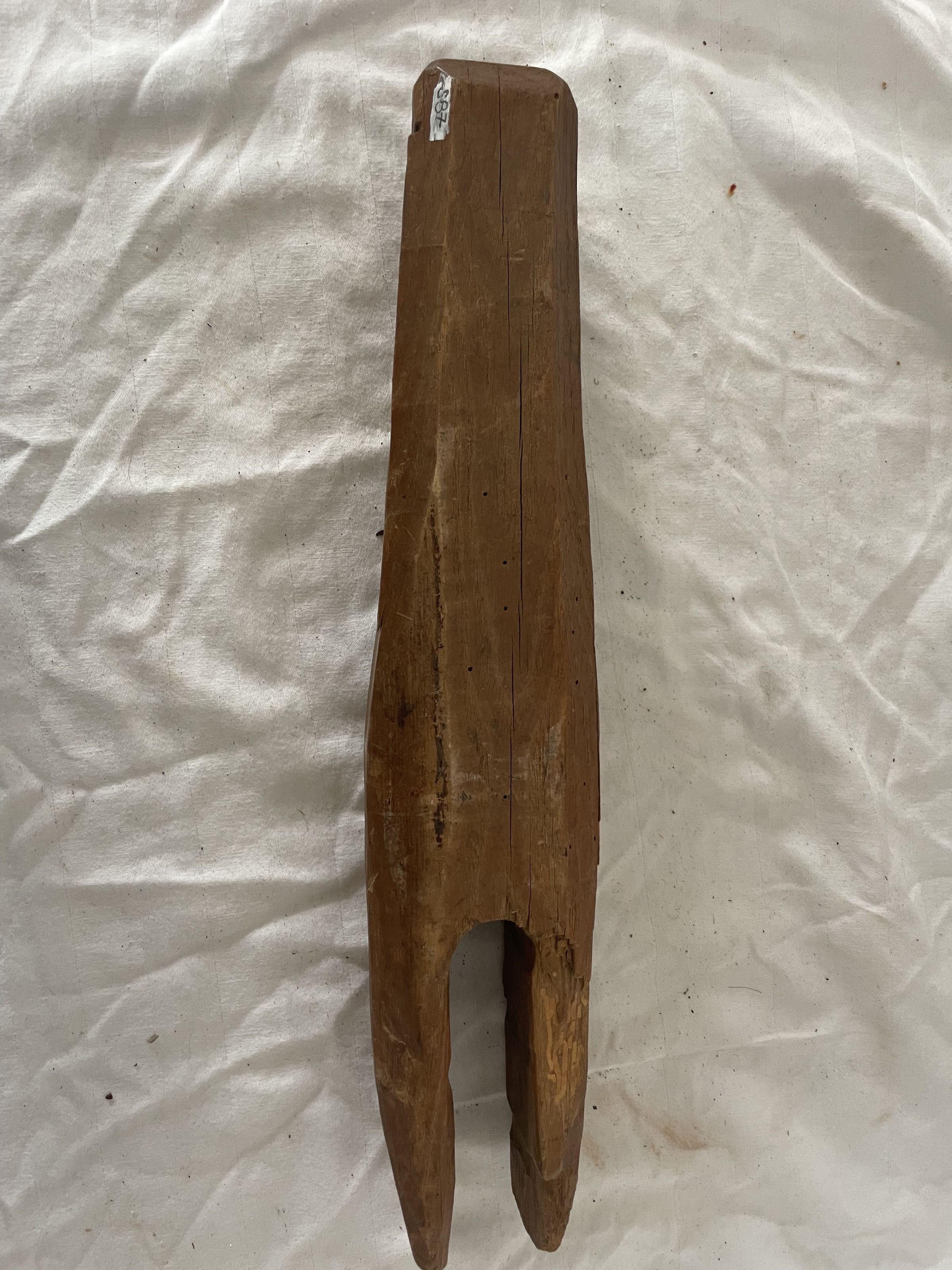 A carved and oiled piece of wood with a central hole cut through the top, a carved out semi circle in the middle, and two carved out legs. It could potentially be a wooden level, but the use is unknown.