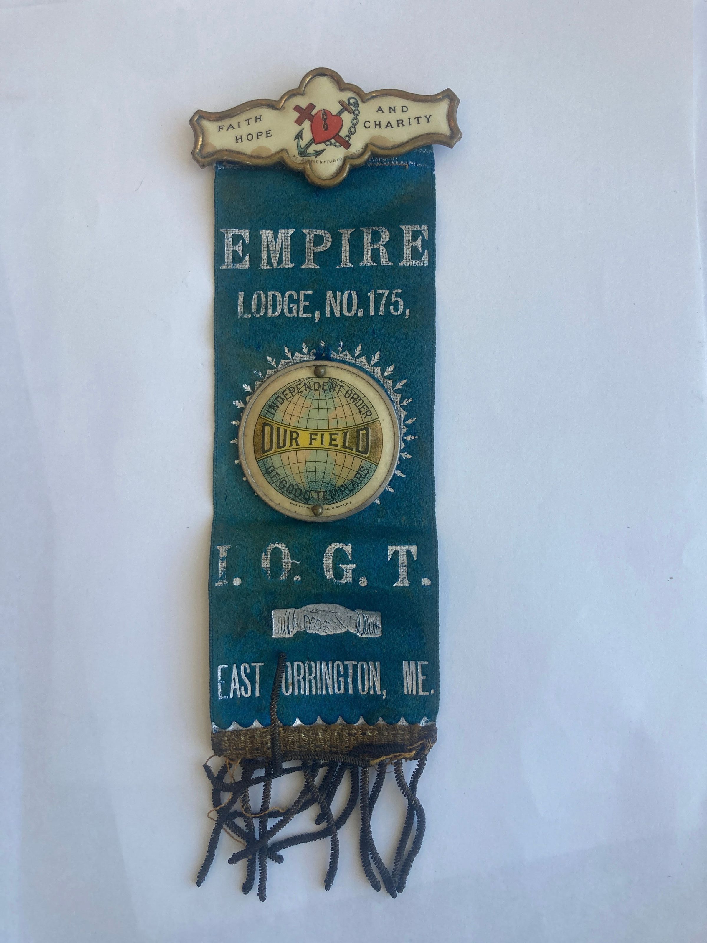 Green ribbon for Empire Lodge No. 175, Independent Order of Good Templars, East Orrington, Me. Pin at the top with the words Faith, Hope, and Charity on flanking a symbol made of of a cross, heart, and anchor with chain.