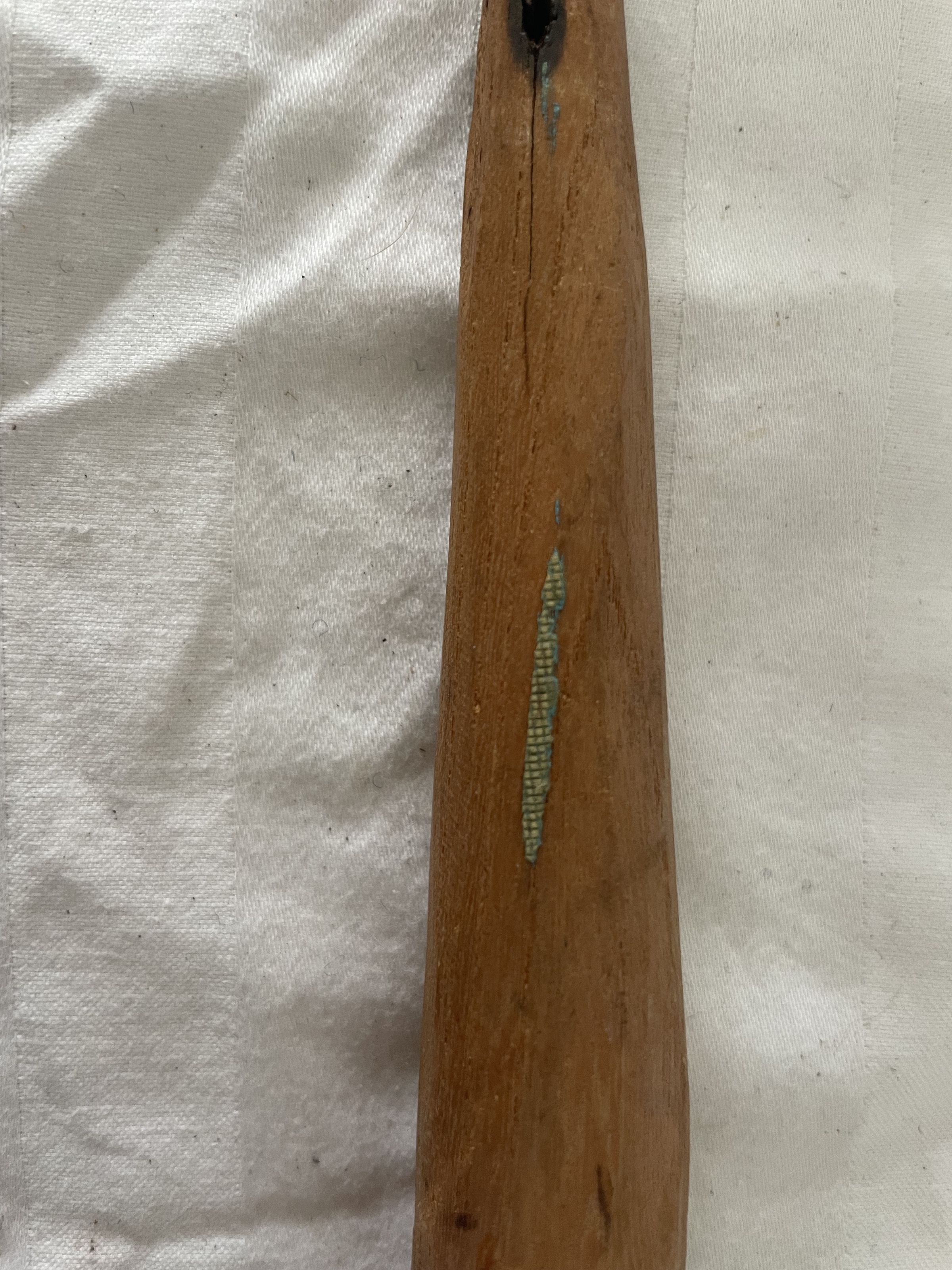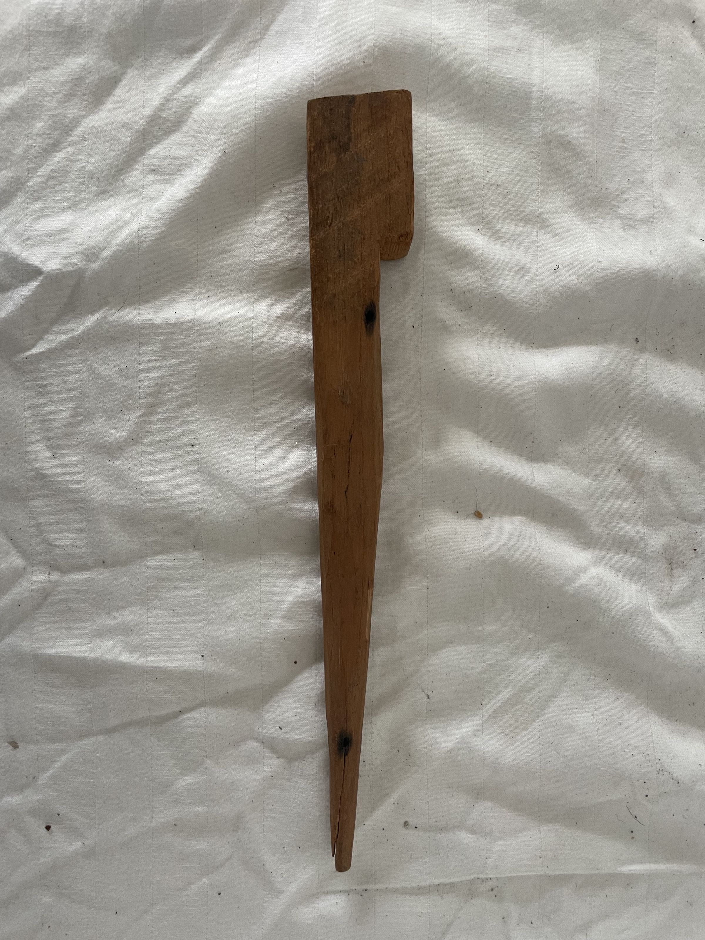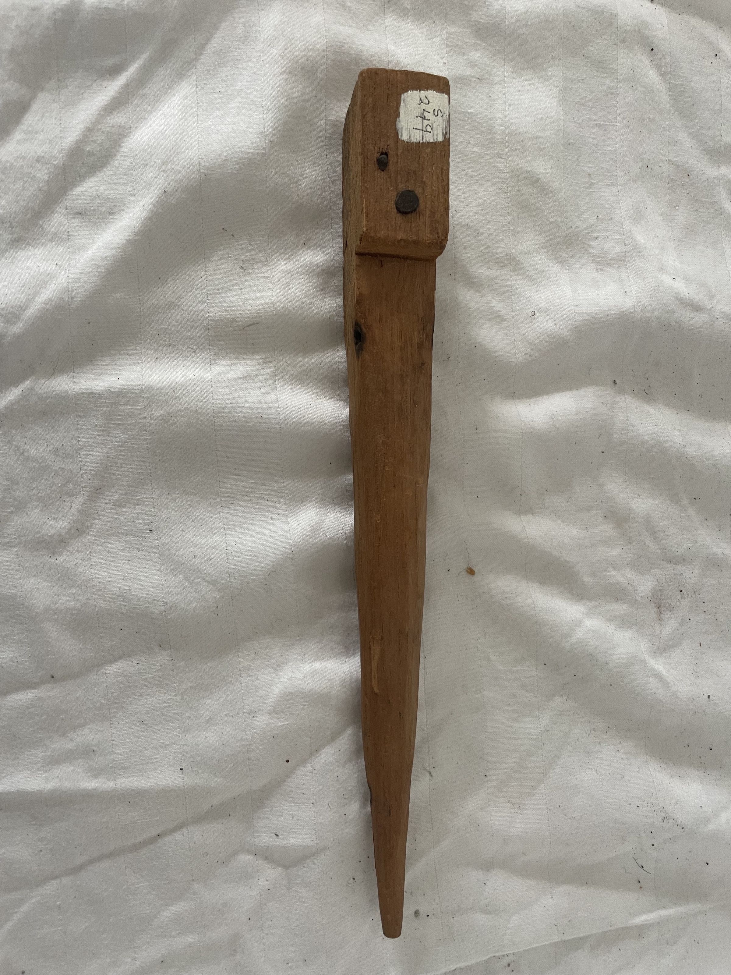 A wooden spike with a square edge that tapers into a blunt, cylindrical spike shape. The wood has several wooden holes
