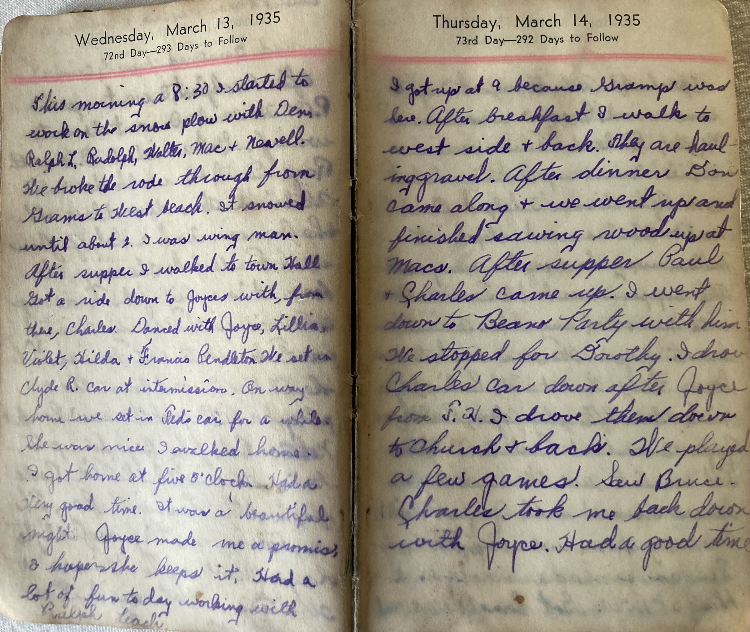 Henry Colcord of Islesboro (b.circa 1915?) kept this diary conscientiously for the entire year. The first entry begins, "This new year came in with a party at my house." The diary describes the tenor of Henry's days, the people he saw, the work he did, the gatherings he attended. Accounting pages for each month at the end of the diary.
