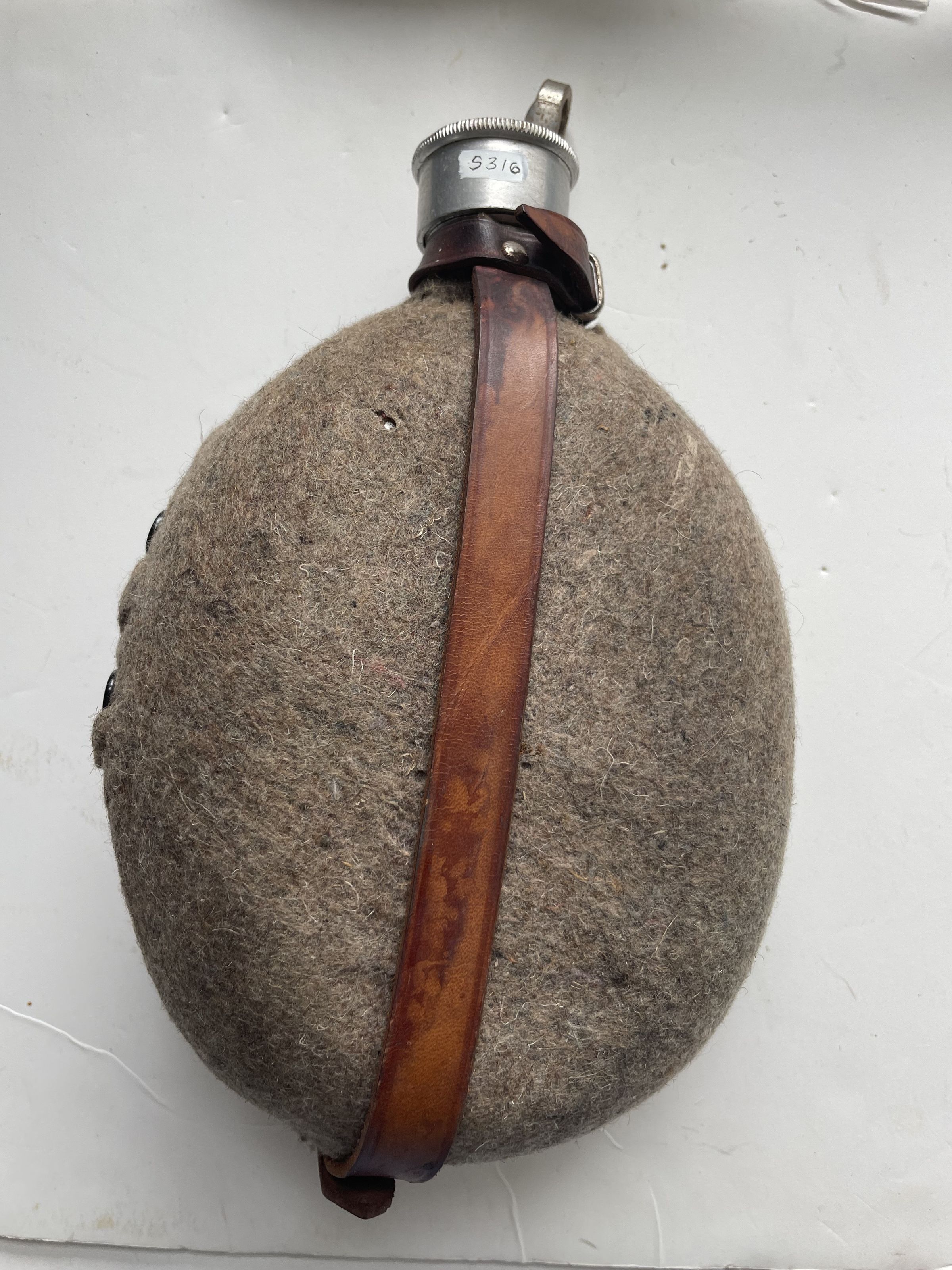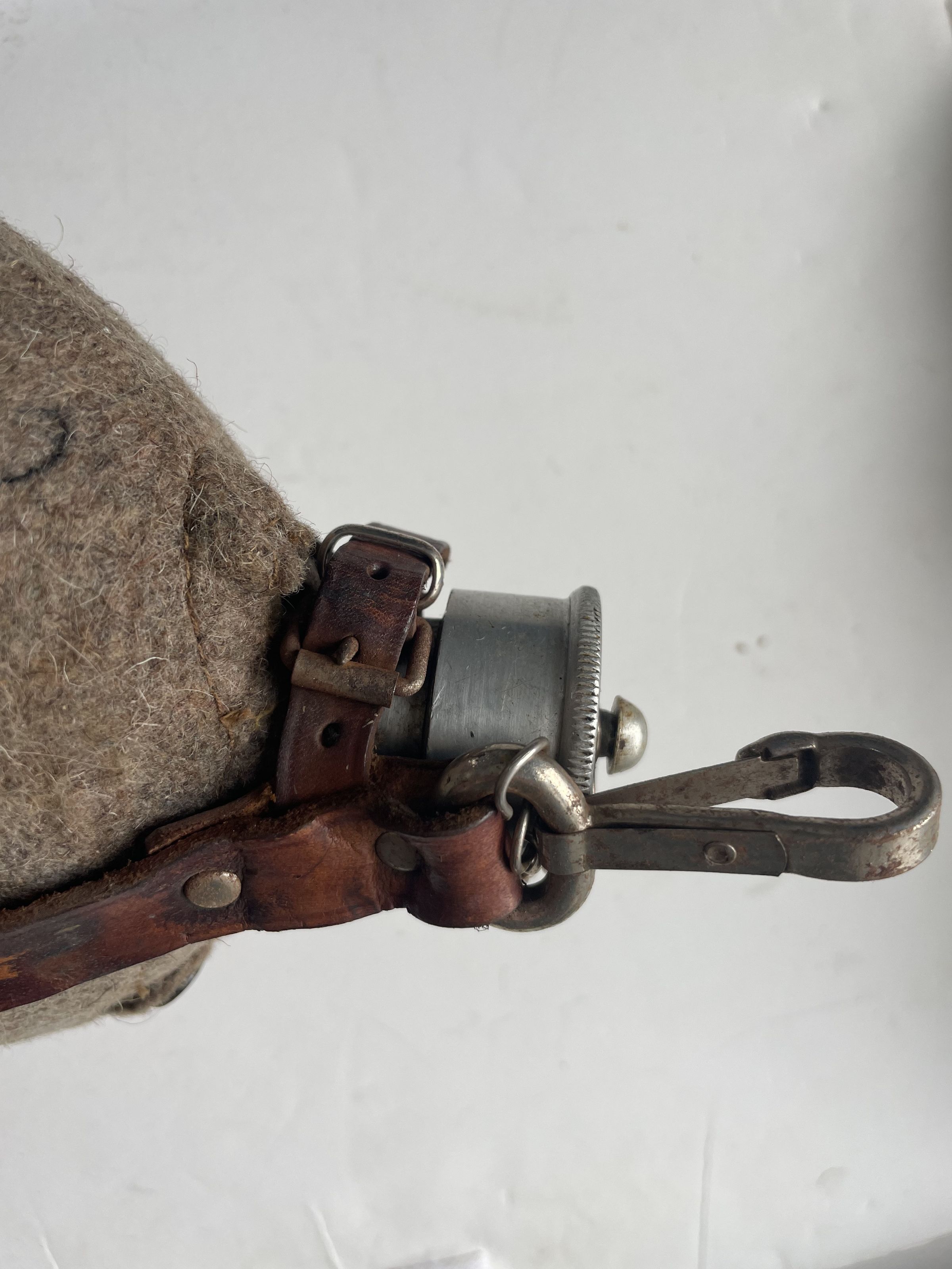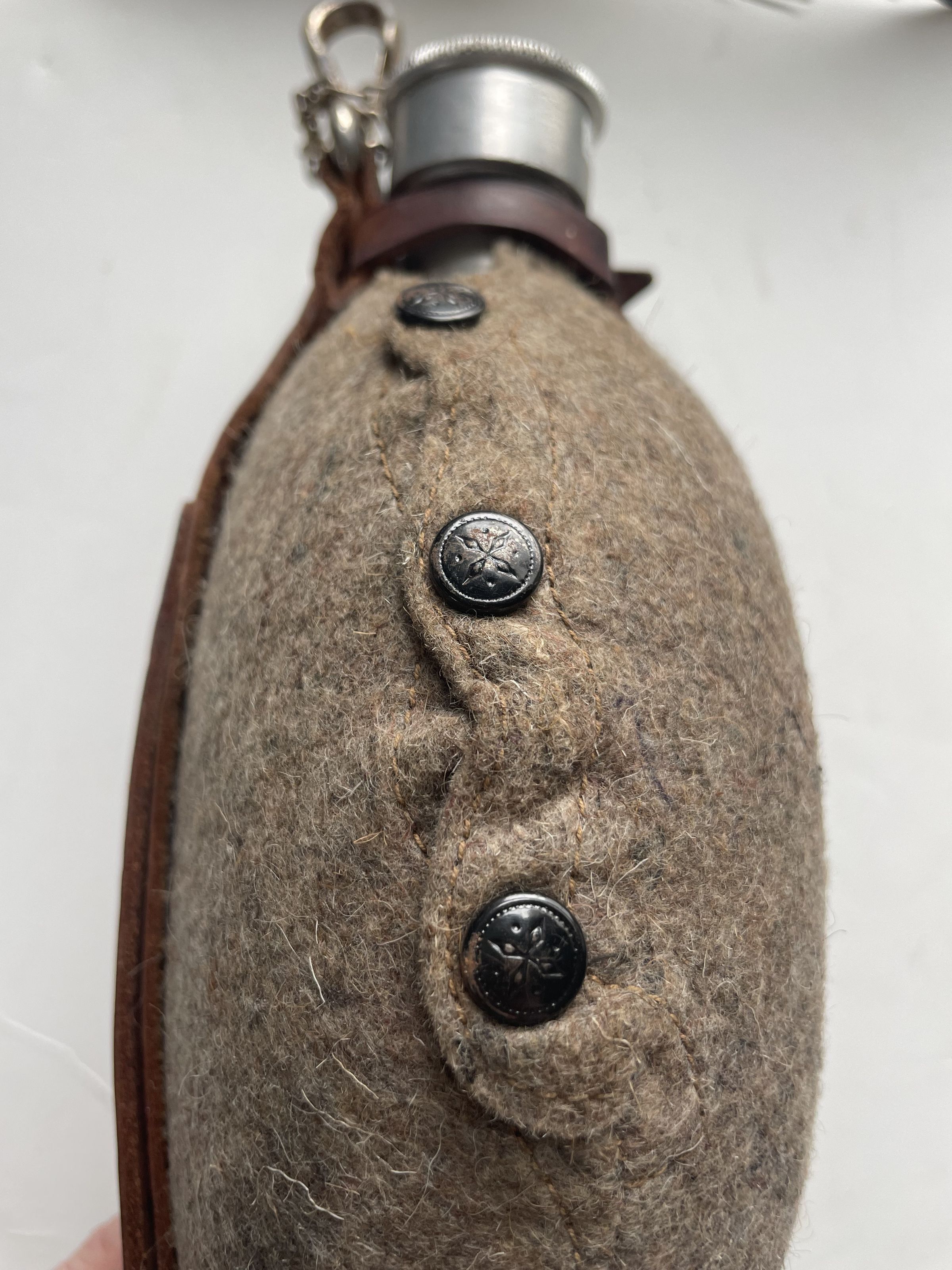 A rounded tin canteen, complete with cap. The canteen is covered by a felt pouch and a leather strap for carrying. The canteen is in pristine condition. The pouch snaps feature a compass design, one of the snaps is missing around the neck of the canteen