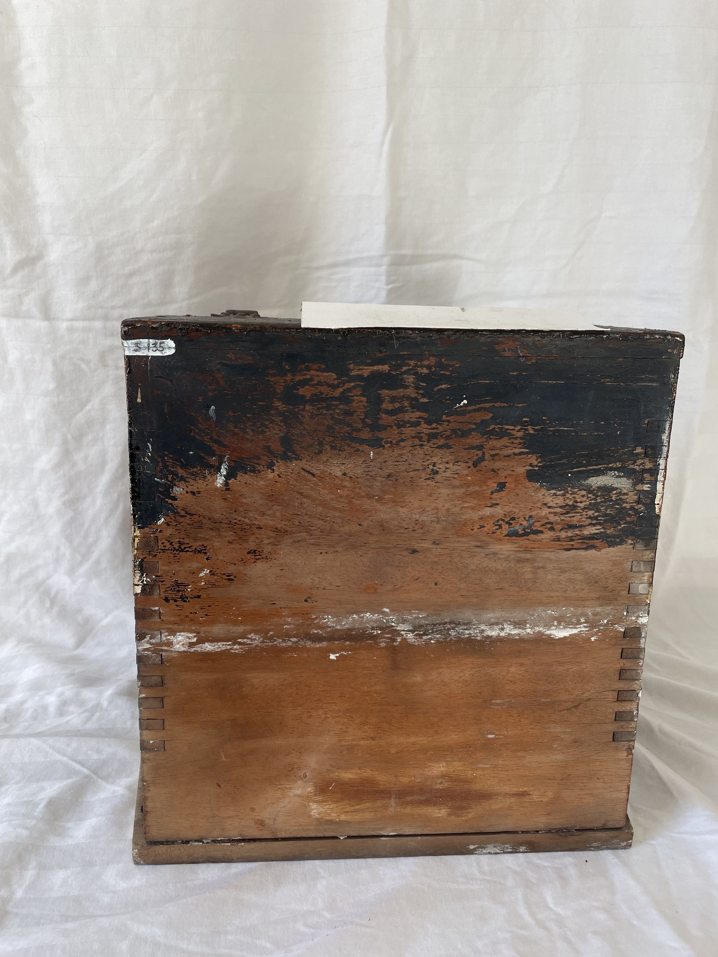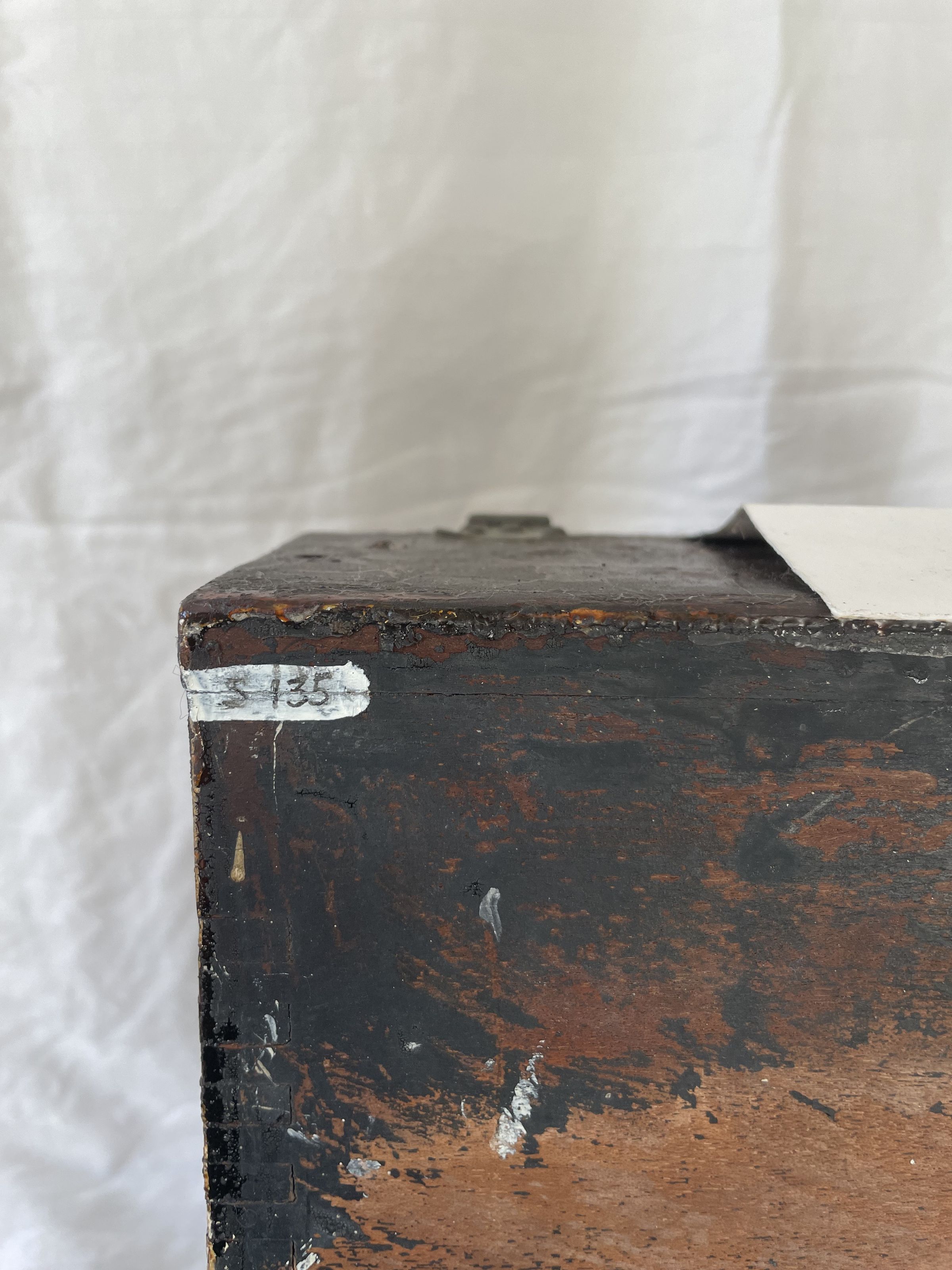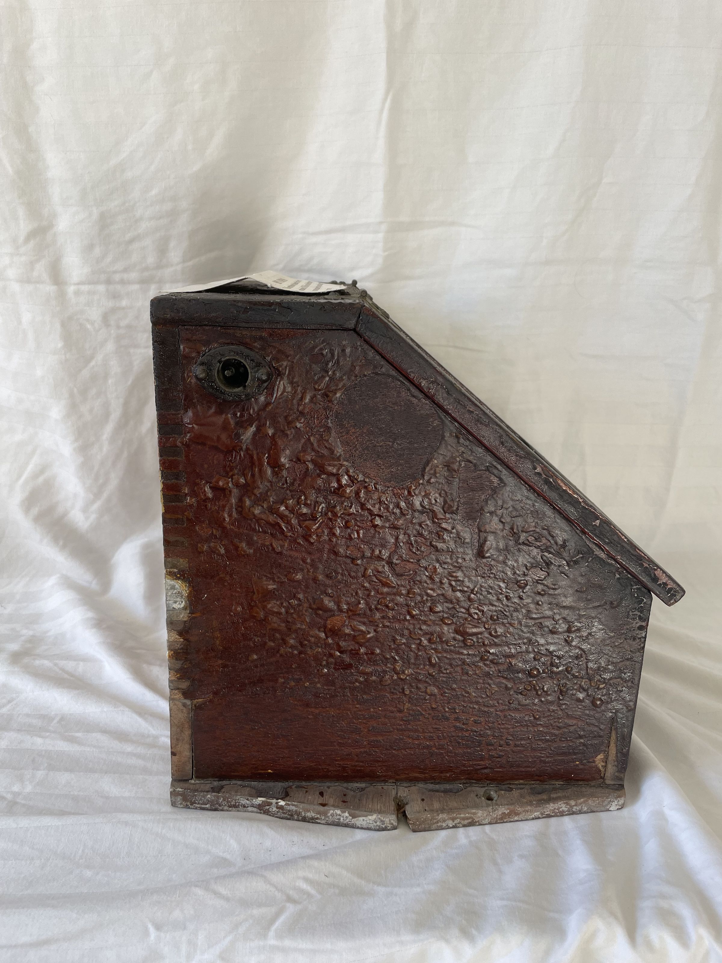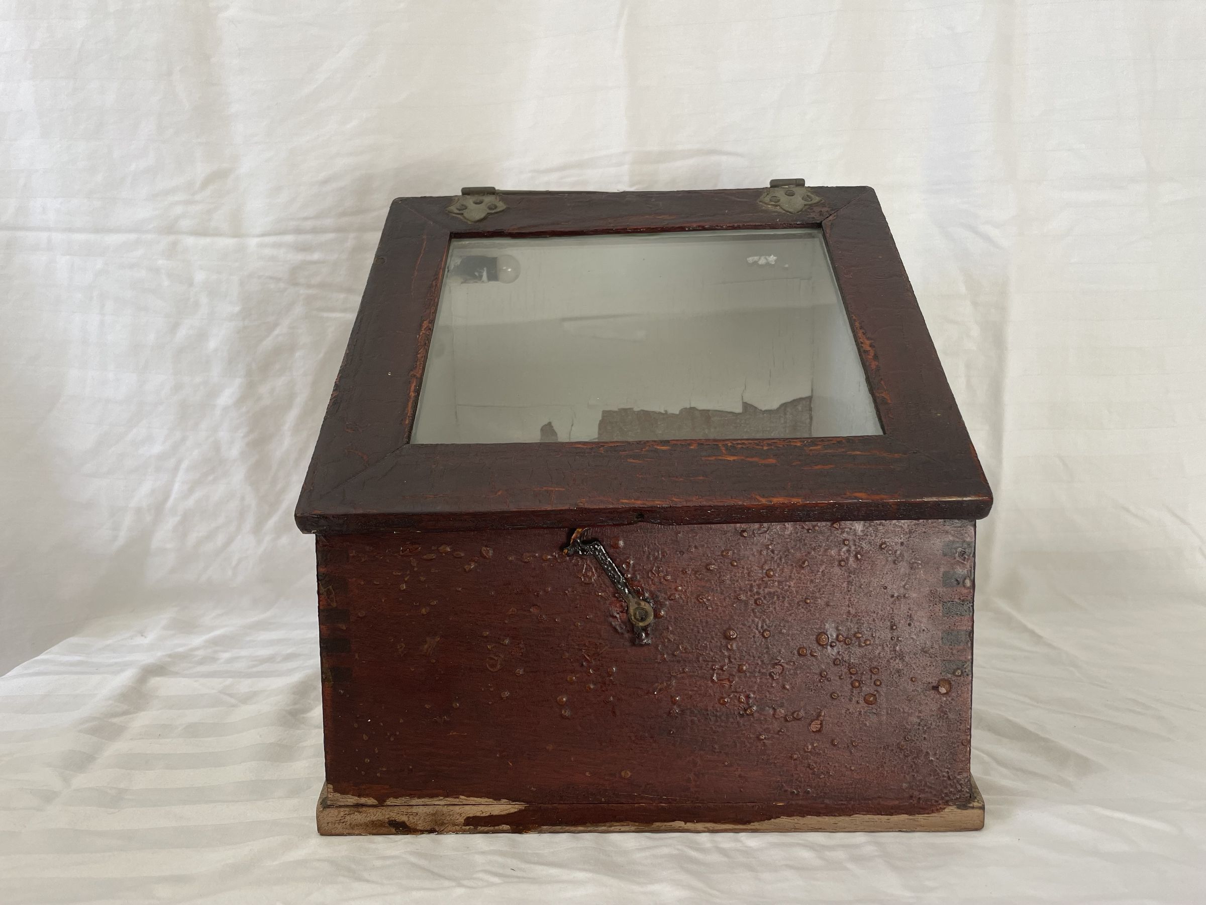 Wooden box with slanted top window, enclosing a large navigational compass. Dark oainted wood with metal 3 point hinges. Compass reads: "Ritchie Pembroke Mass. Made in U.S.A.
