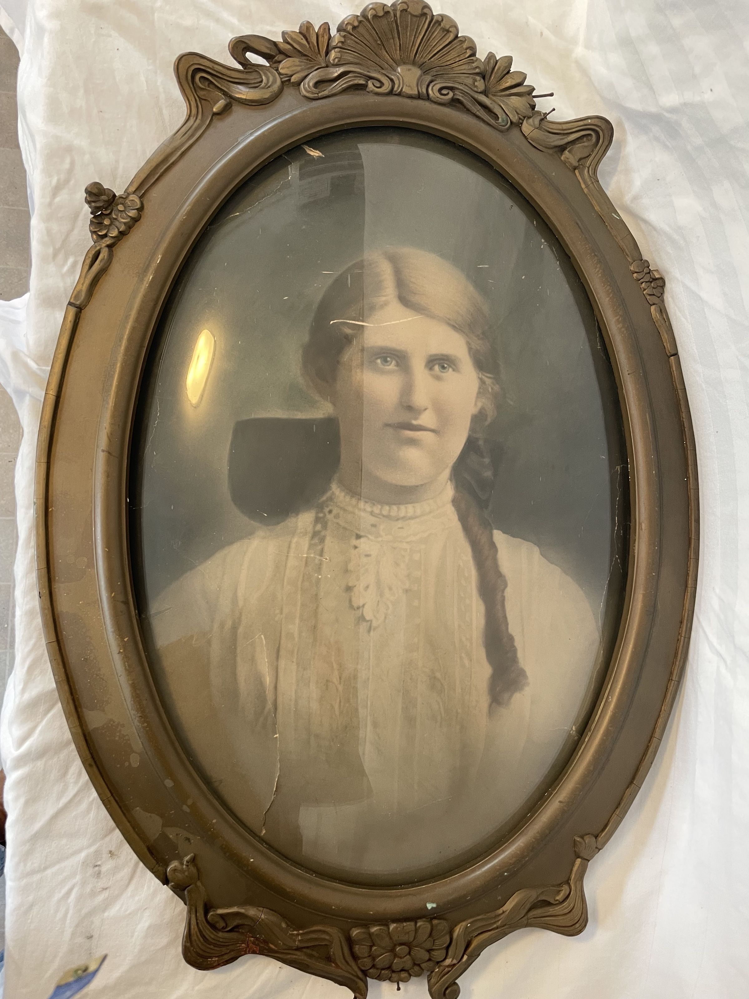 A oval framed portrait of a woman. The image is taken from the bust up and the woman is looking directly at the camera/artist. She is wearing a white lingerie dress.