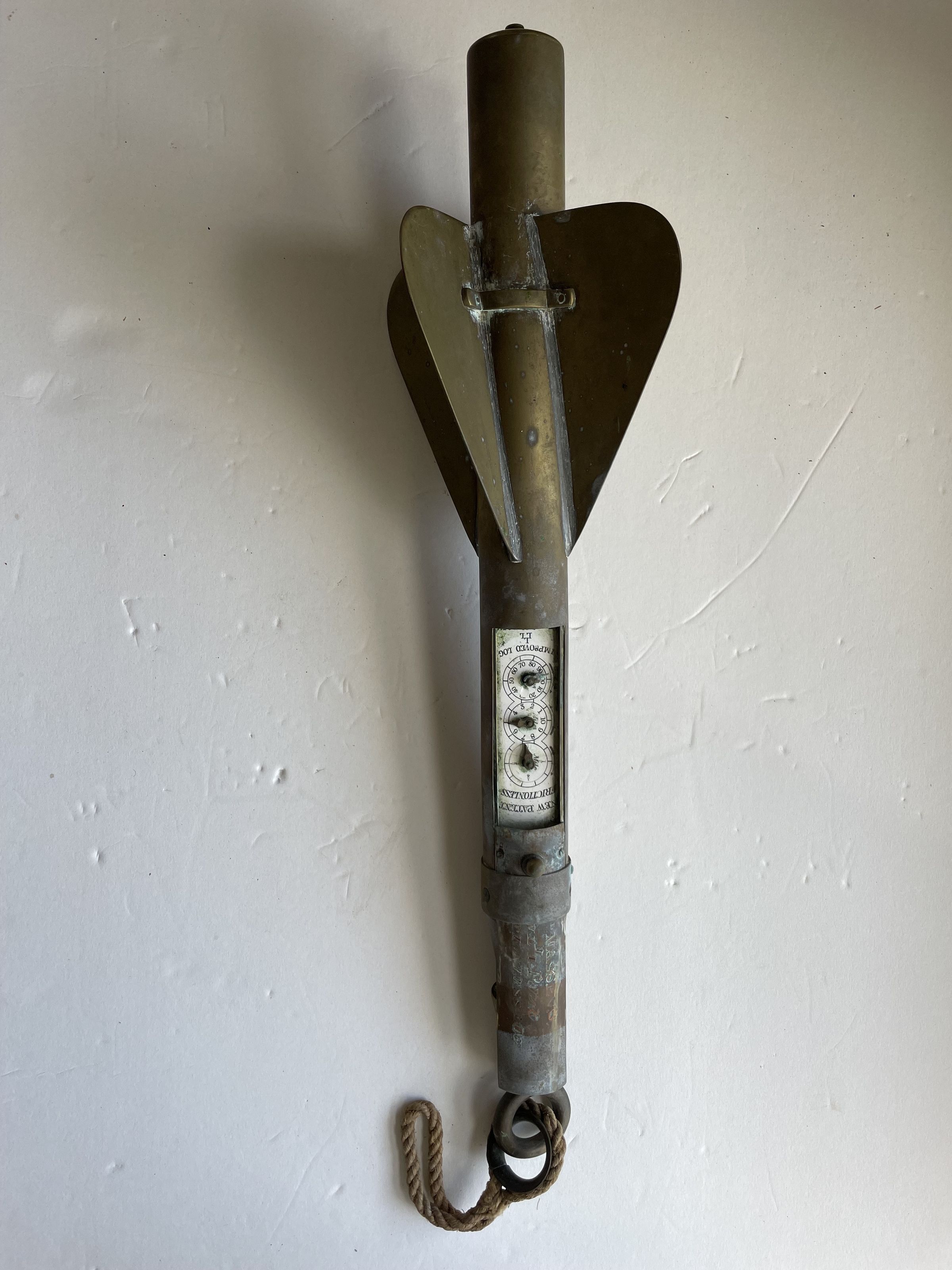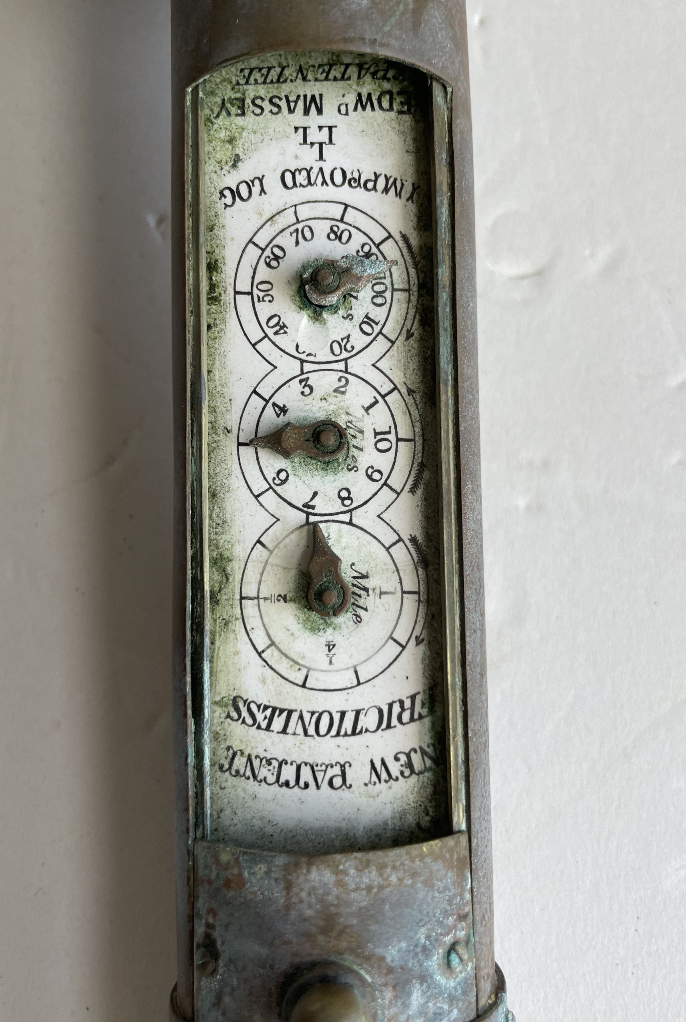New, Frictionless improved log. This is a brass log with a cylindrical body and four fins at the end. The log contains a rectangular compartment with sliding brass door, reveals log dials in .10's, 1's, and 100's.