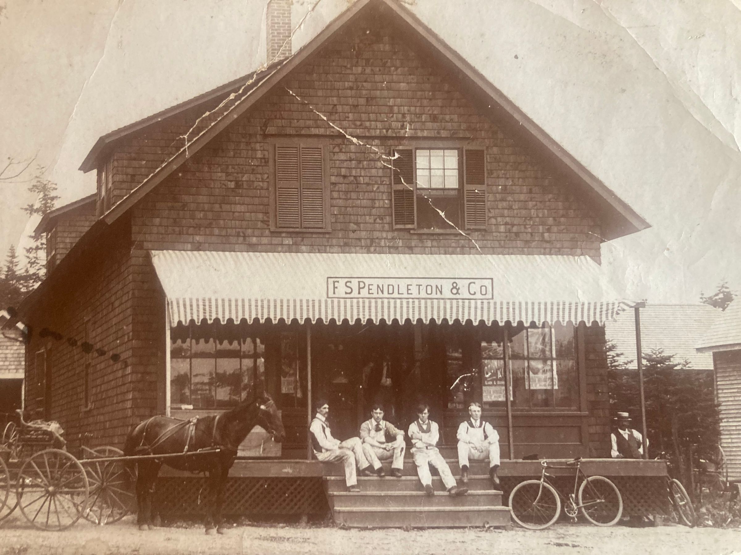 Picture of the Pendleton Store, four men sitting on the front steps, another leaning against the porch. Horse and buggy and a bicycle in front. [Circa 1900?]