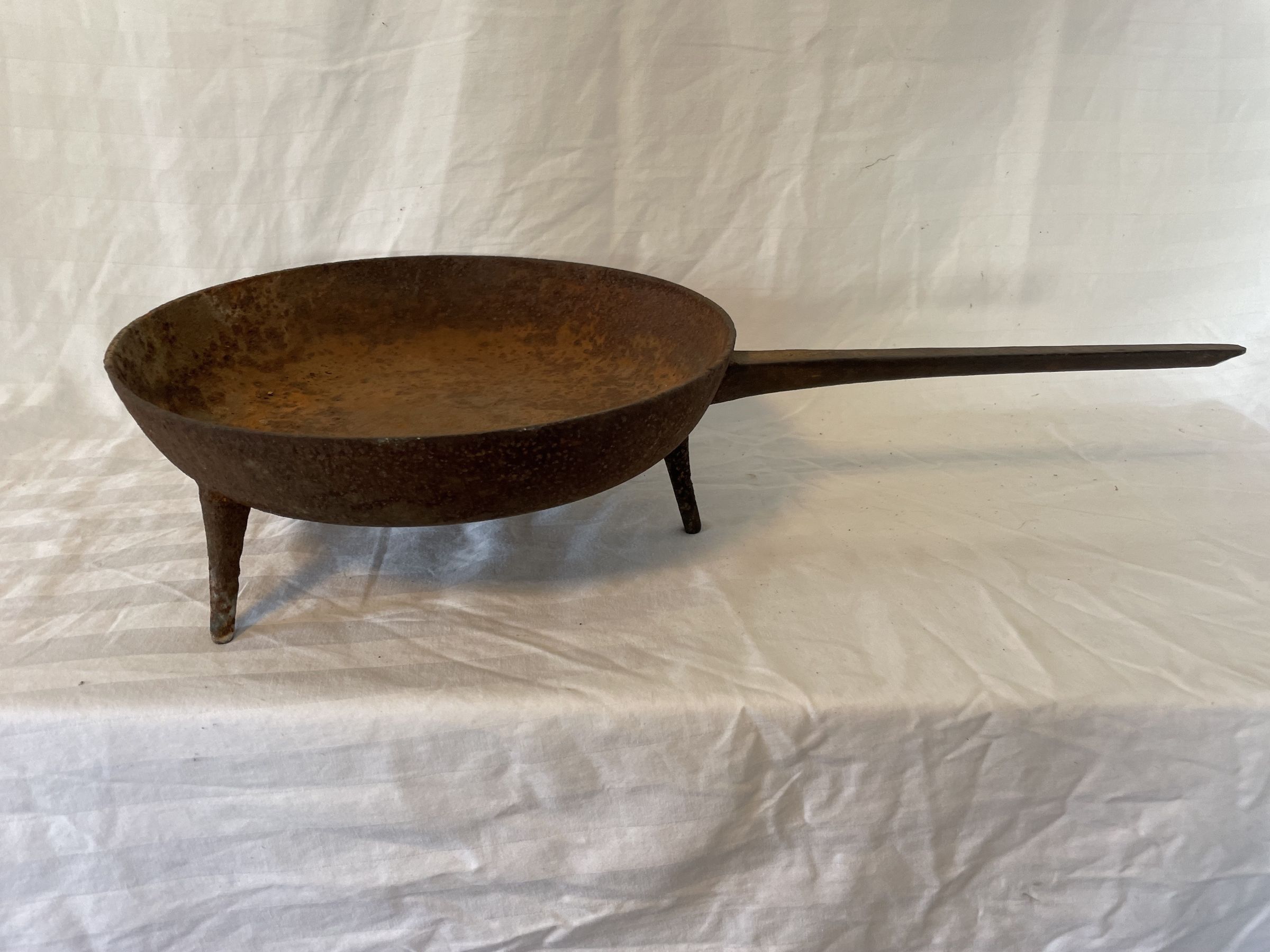 Three legged cast iron pan with long handle. The pan is shallow. Rusted