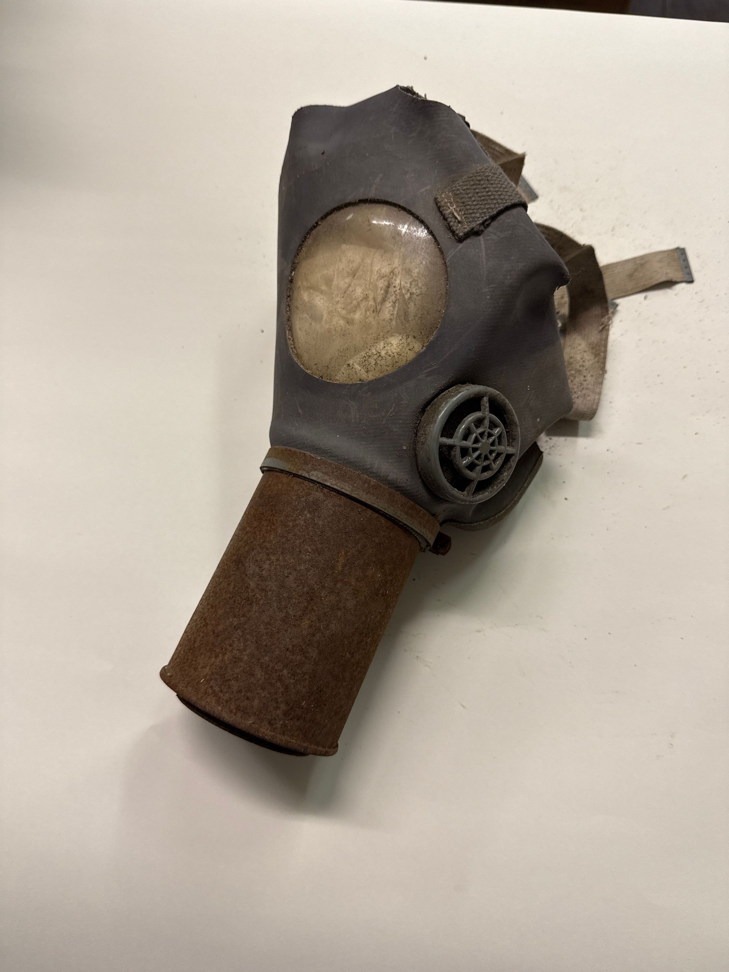 World War I gas mask, metal filtration cannister fixed to a gray rubberized fabric mask with straps. 3"d clear plastic covering for the eyes. Instructions for use printed on the canister and "Property of The U S Government"