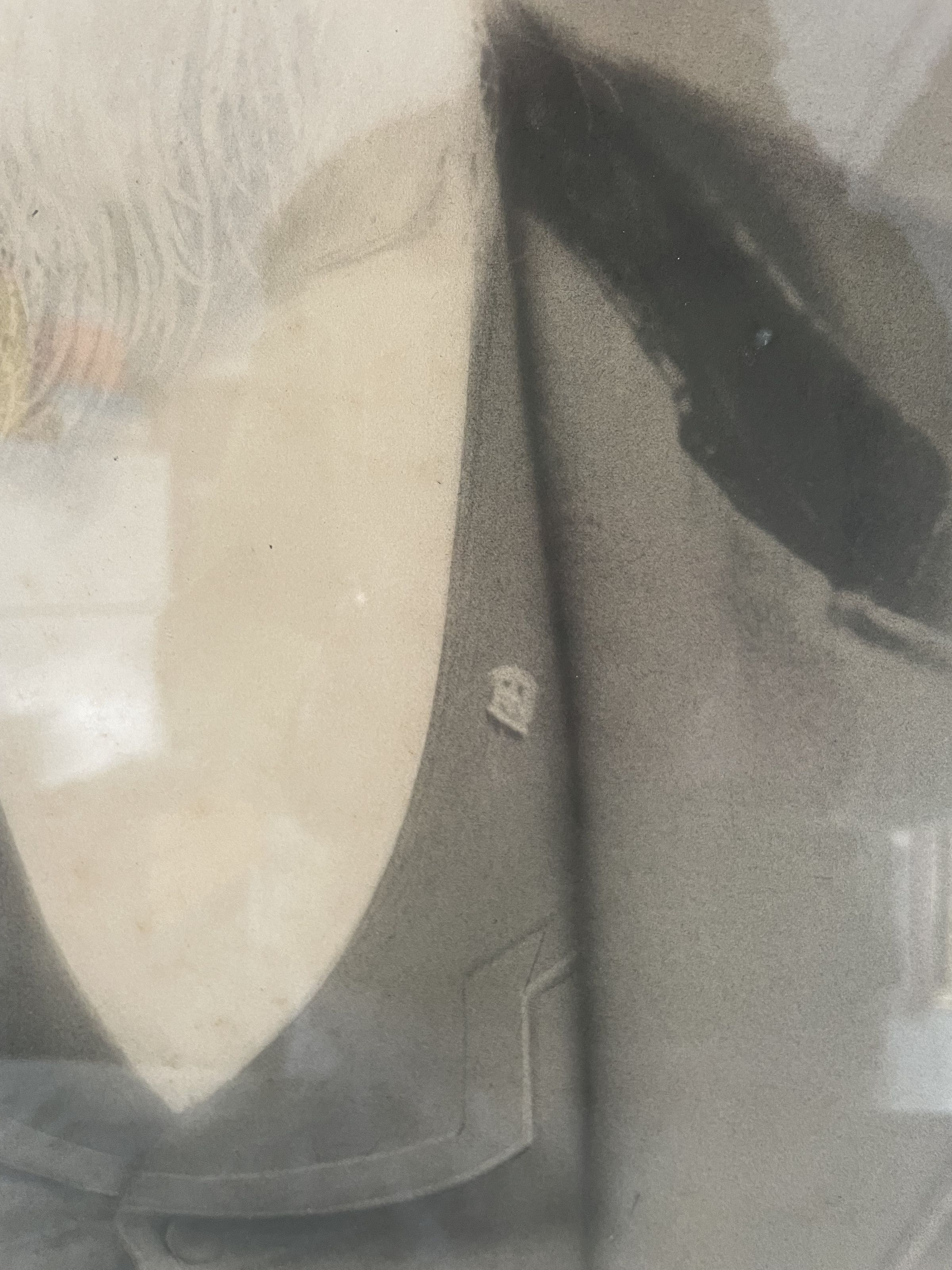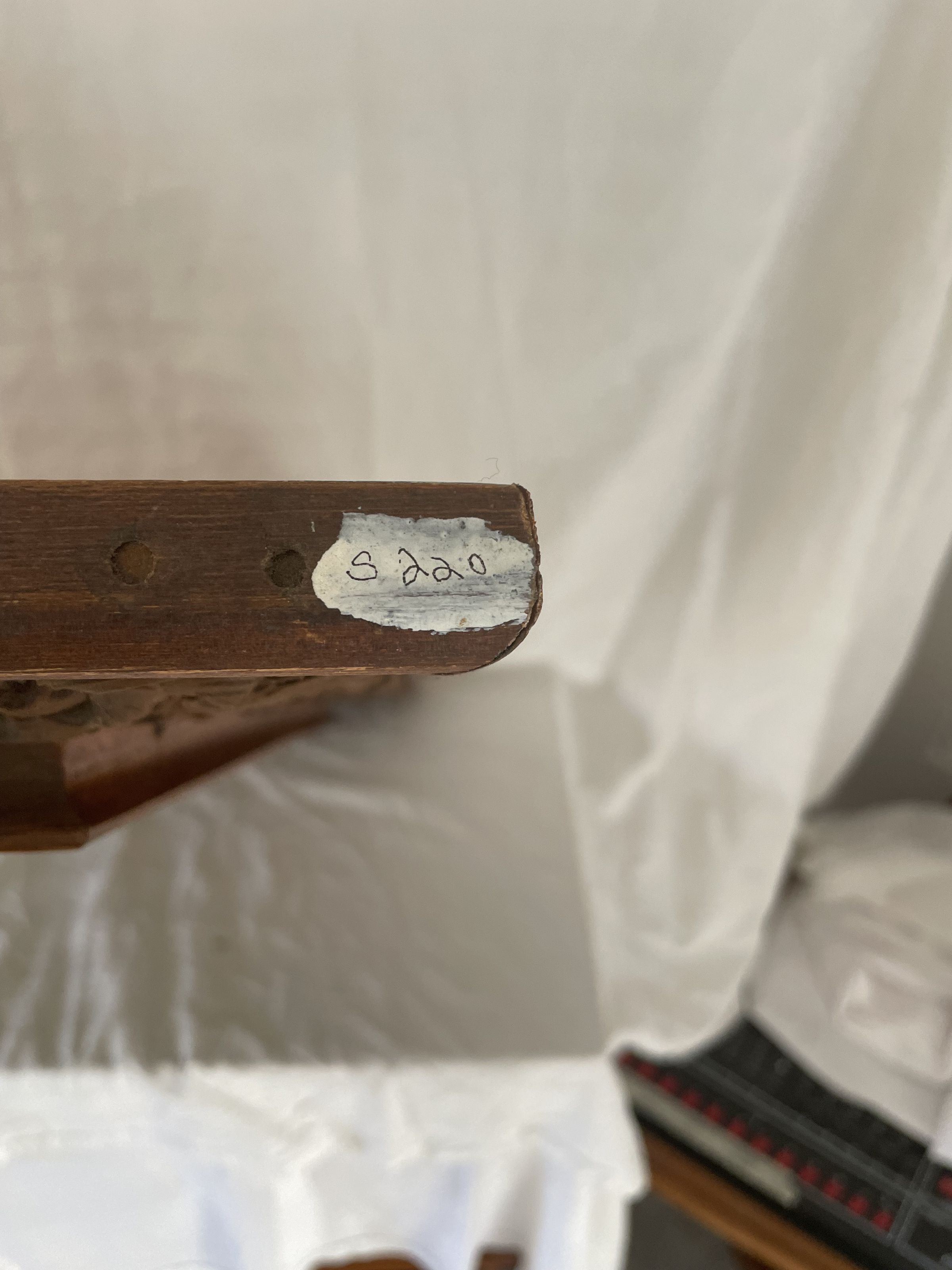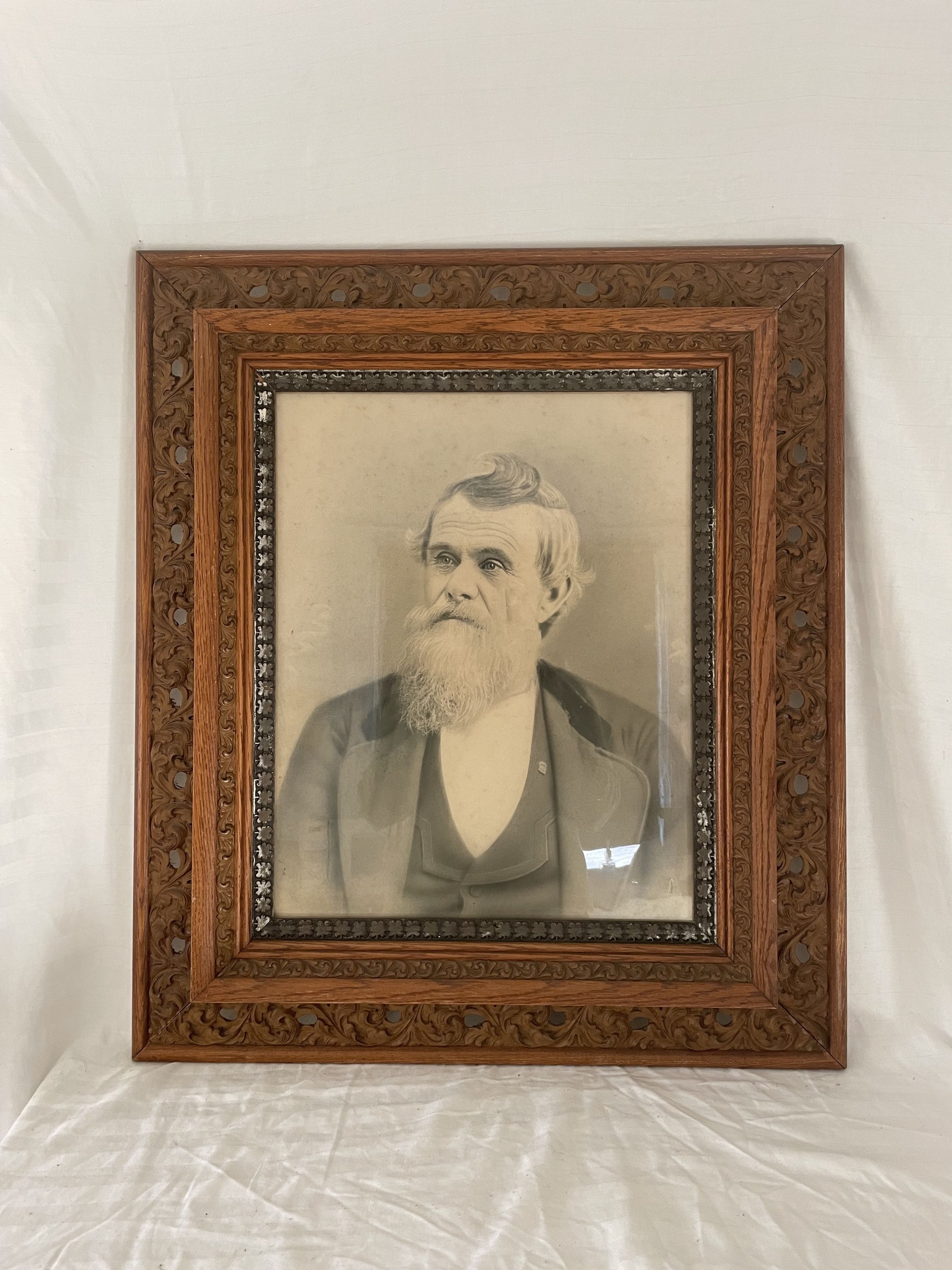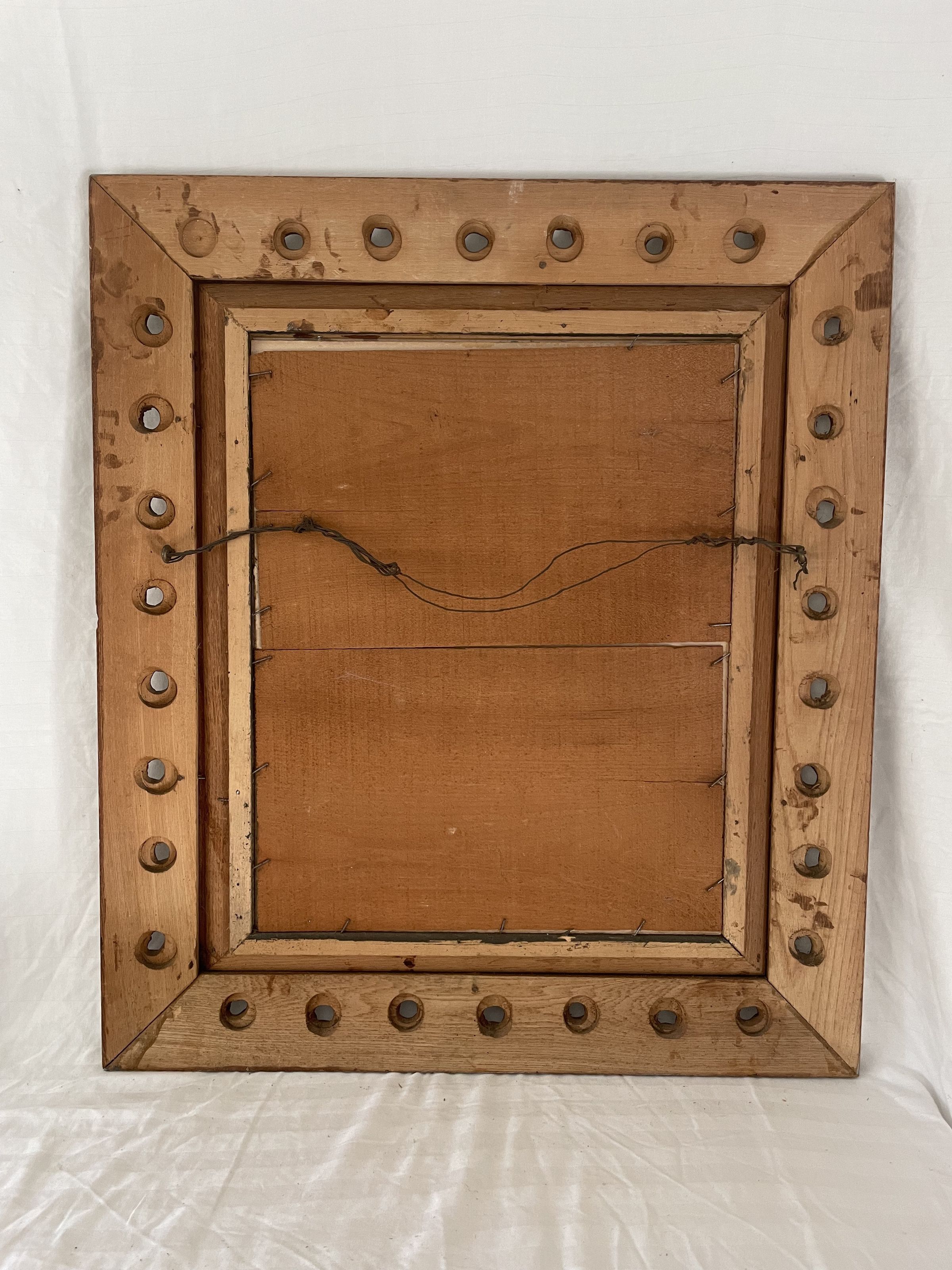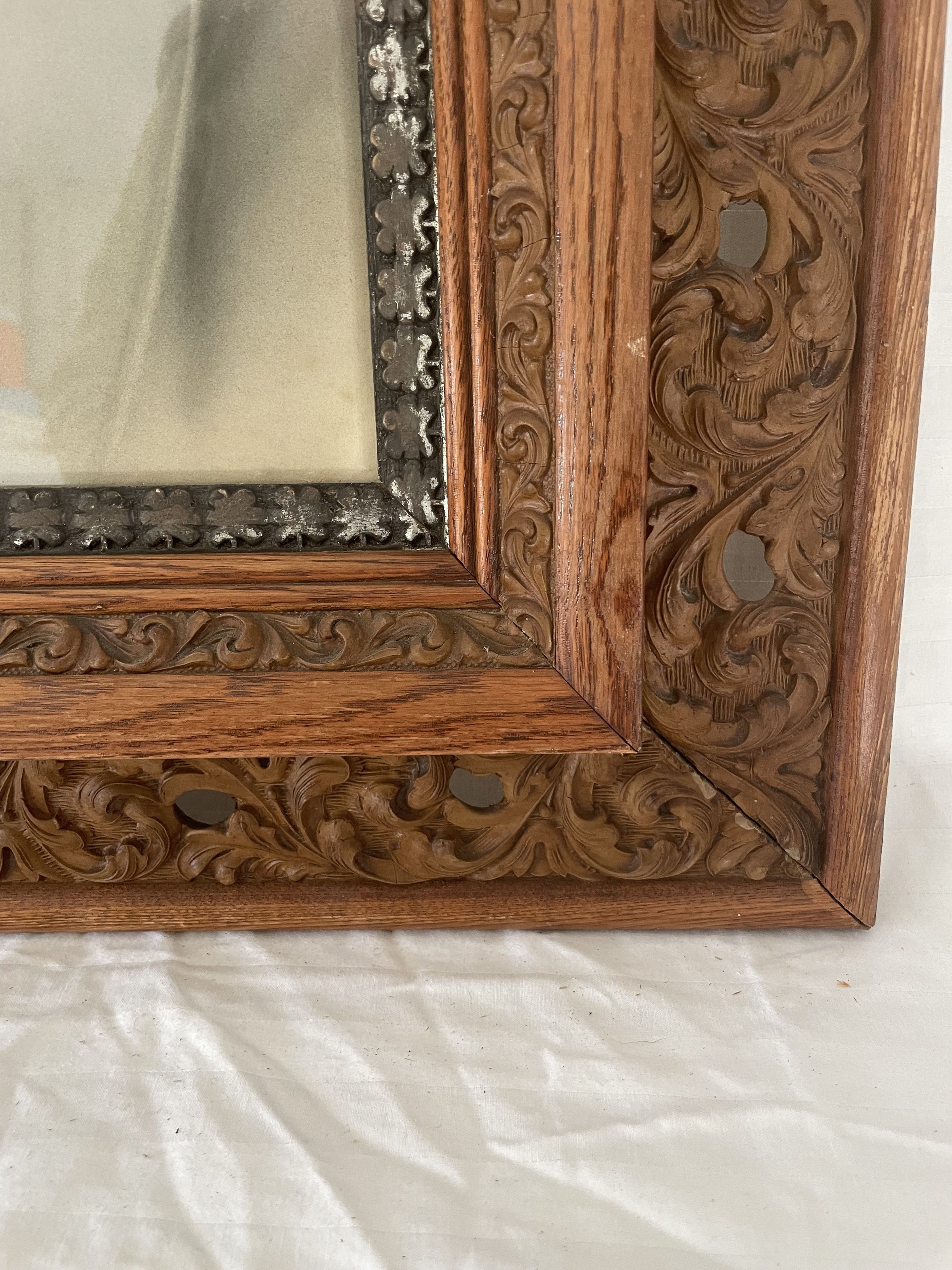 The image is framed in a large, elaborate wooden frame. The frame contains carvings of leaves with holes in between each design. The inner rim of the frame is a darker wood with carvings of clovers or oak leaves.