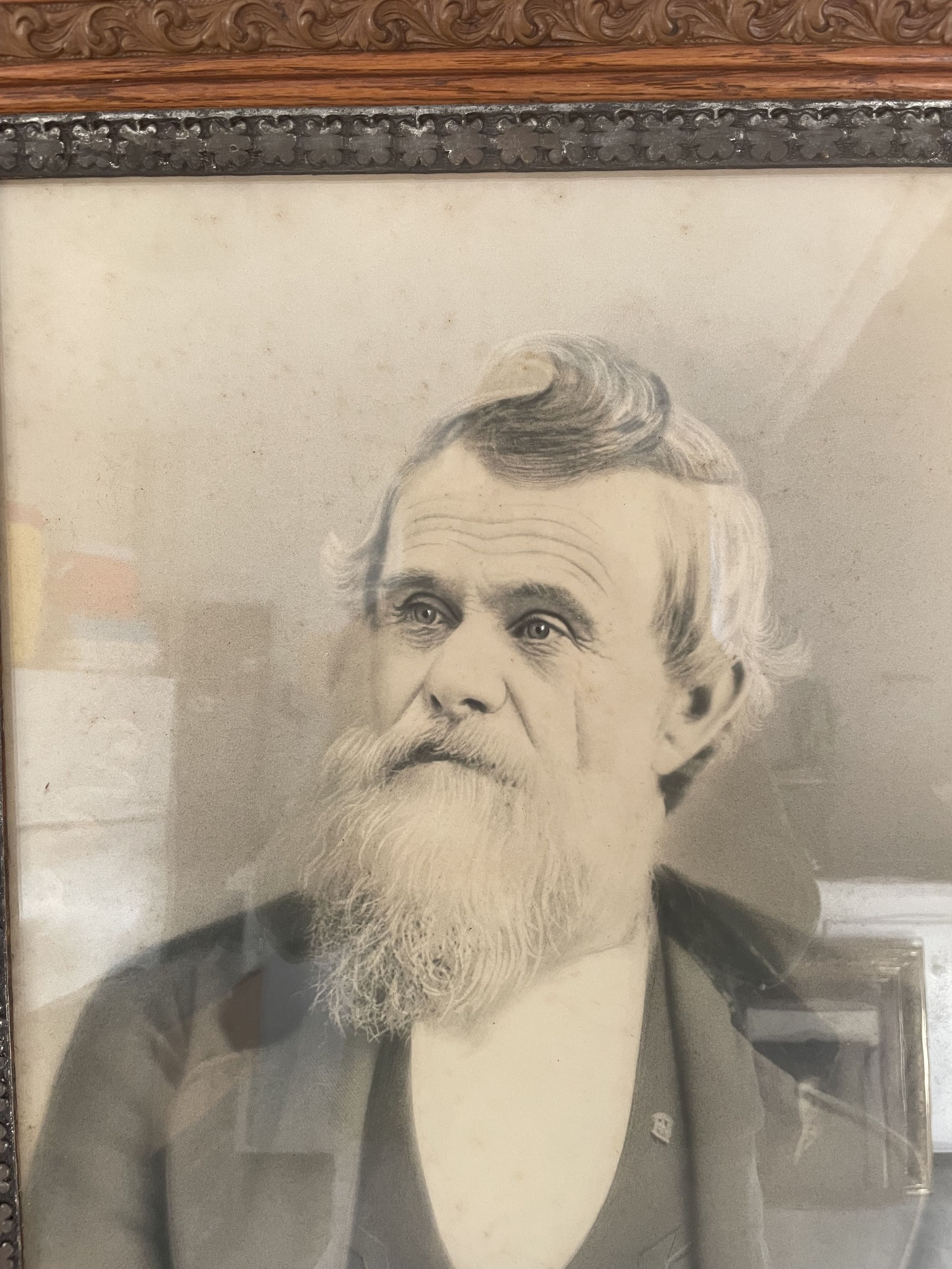 Black and white portrait of a man, identified as either Emory Williams or Thomas Williams. The subject is wearing a suit with a suit vest and white shirt. On the vest is a pin that is unidentifiable. The man has a full white beard and forehead wrinkles. The back ground is blurred grey. The man is gazing over his right shoulder, looking past the camera.