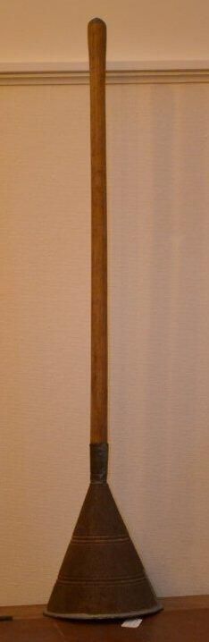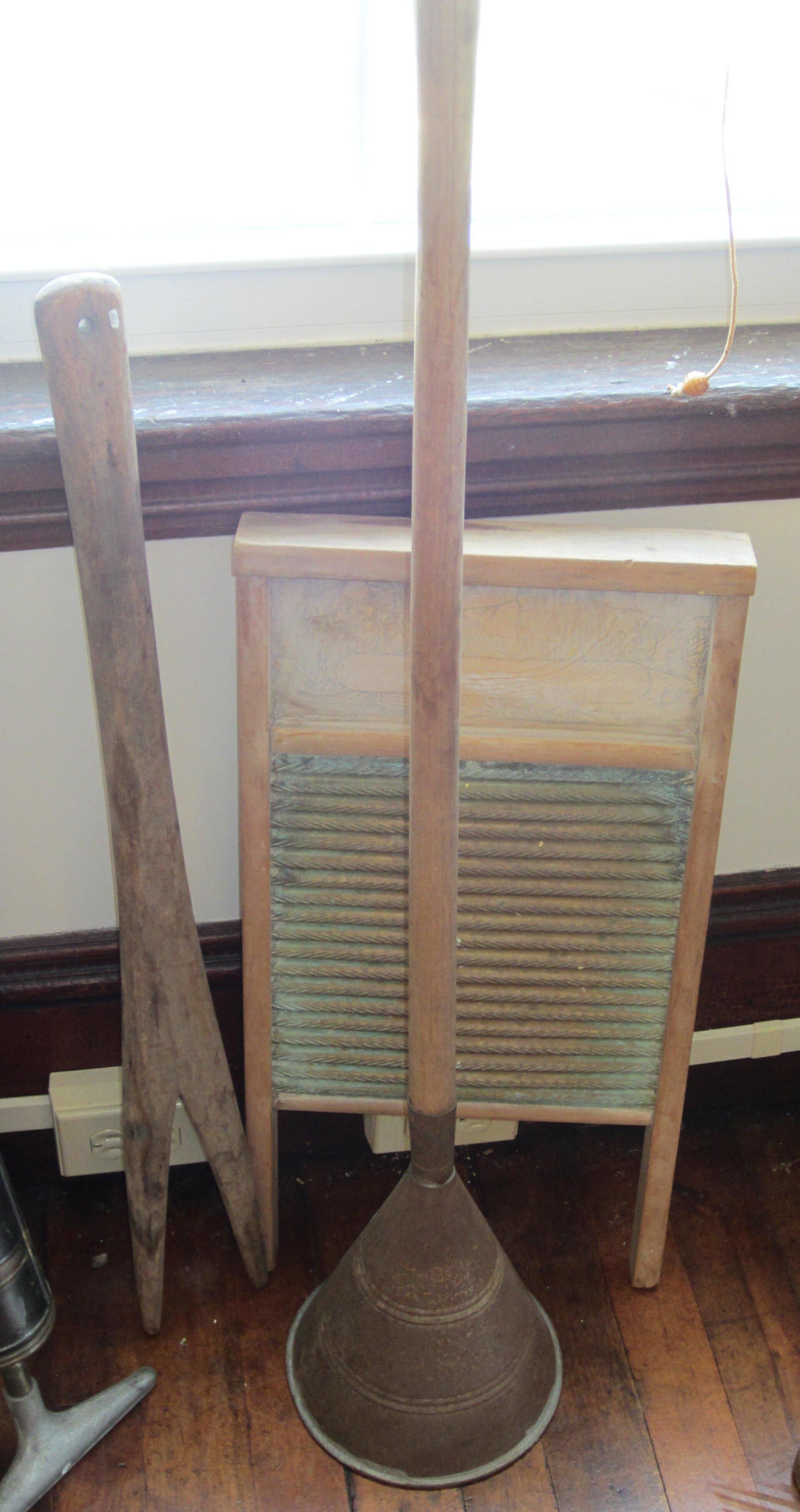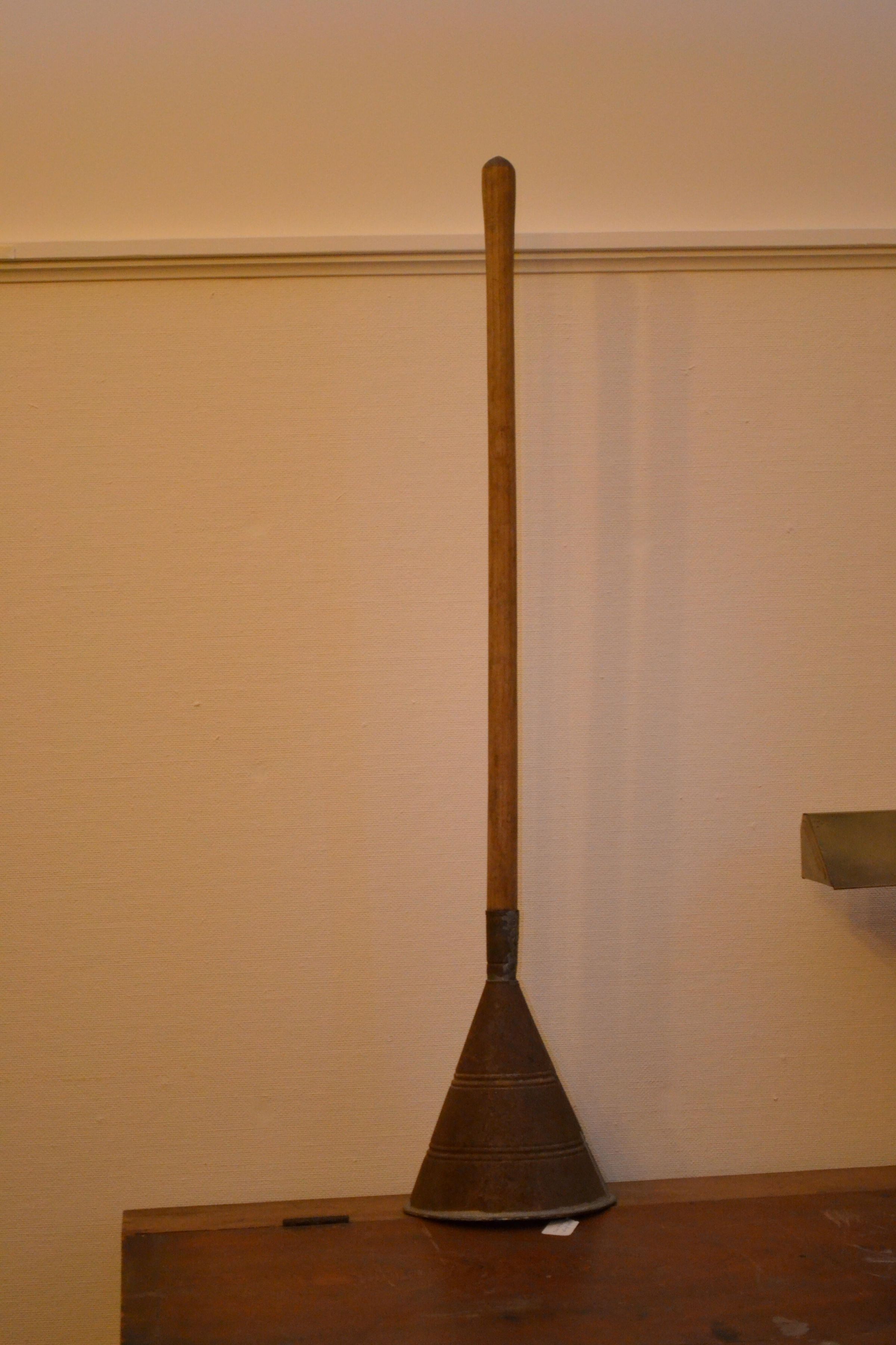 Wash-pounder/mangle/plunger: wooden handle with conical metal fitting c. 8" diam. at base to churn wash in a wash bucket, c 40" long.
