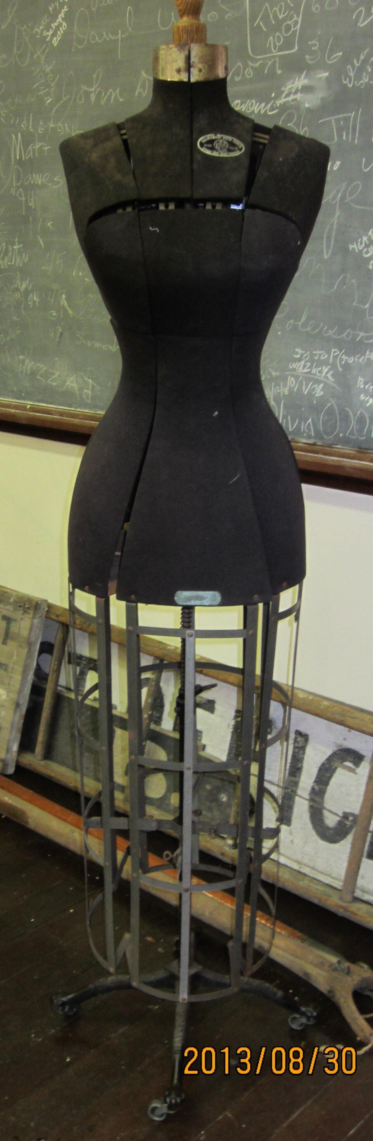 Adjustable dress form on rolling stand. From Anne Owsley with her mother's c 1910 wedding gown (2013.008.0001). "Wasp-waist" and tall neck for fashions of the Gibson Girl era. Made by the Hall-Borghert Company of Chicago-New York-Toronto, size 2. Pieces for the upper torso down through the hips are molded and covered with fabric(felted) , adjustable by interior screws on metal slides, the lower body constructed of metal strips also adjustable, and the whole mounted on a central stem adjustable for height.