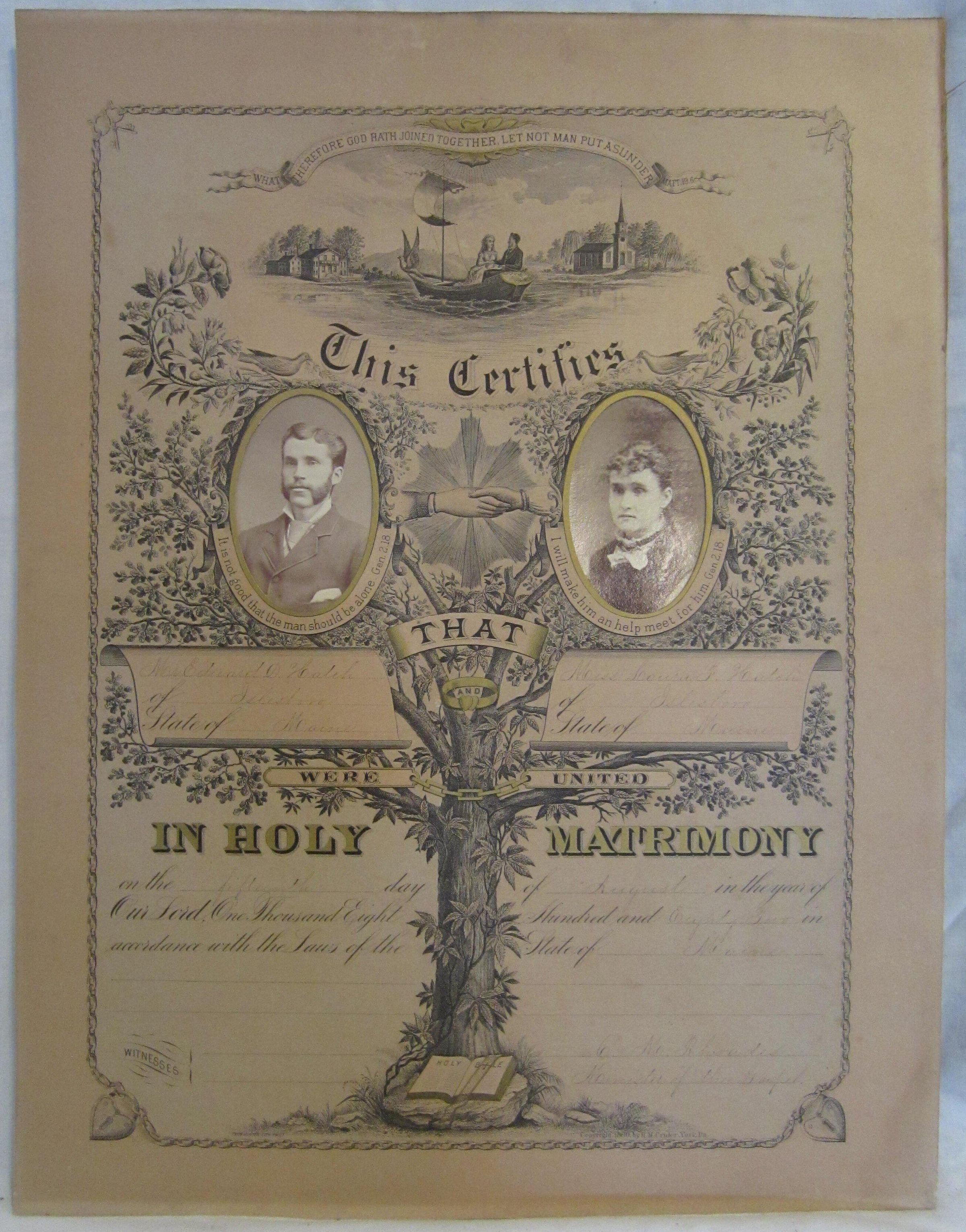 Ornate marriage certificate for Edward D. Hatch and Laura F Hatch, August 15, 1882, by C. M. Rhoades, Minister of the Gospel (sic). 14" x 18", printed on paper with oval cutouts for pictures of bride and groom. Illustration at top is a couple in a boat sailing between church and village, a tree is in center of certificate, with the wedding pictures amid branches with joined hands between. Edward was the son of Daniel and Maria Farrow Hatch (Farrow p. 222) grandson of Deacon James Hatch (Farrow p. 220); Laura was daughter of Calvin Hatch and Melissa Fairfield and granddaughter of Deacon James Hatch. Laura died young, but Edward and his 2nd wife had a son William Henry Hatch (Henry Hatch) whose daughter Susan is still on island (2013).