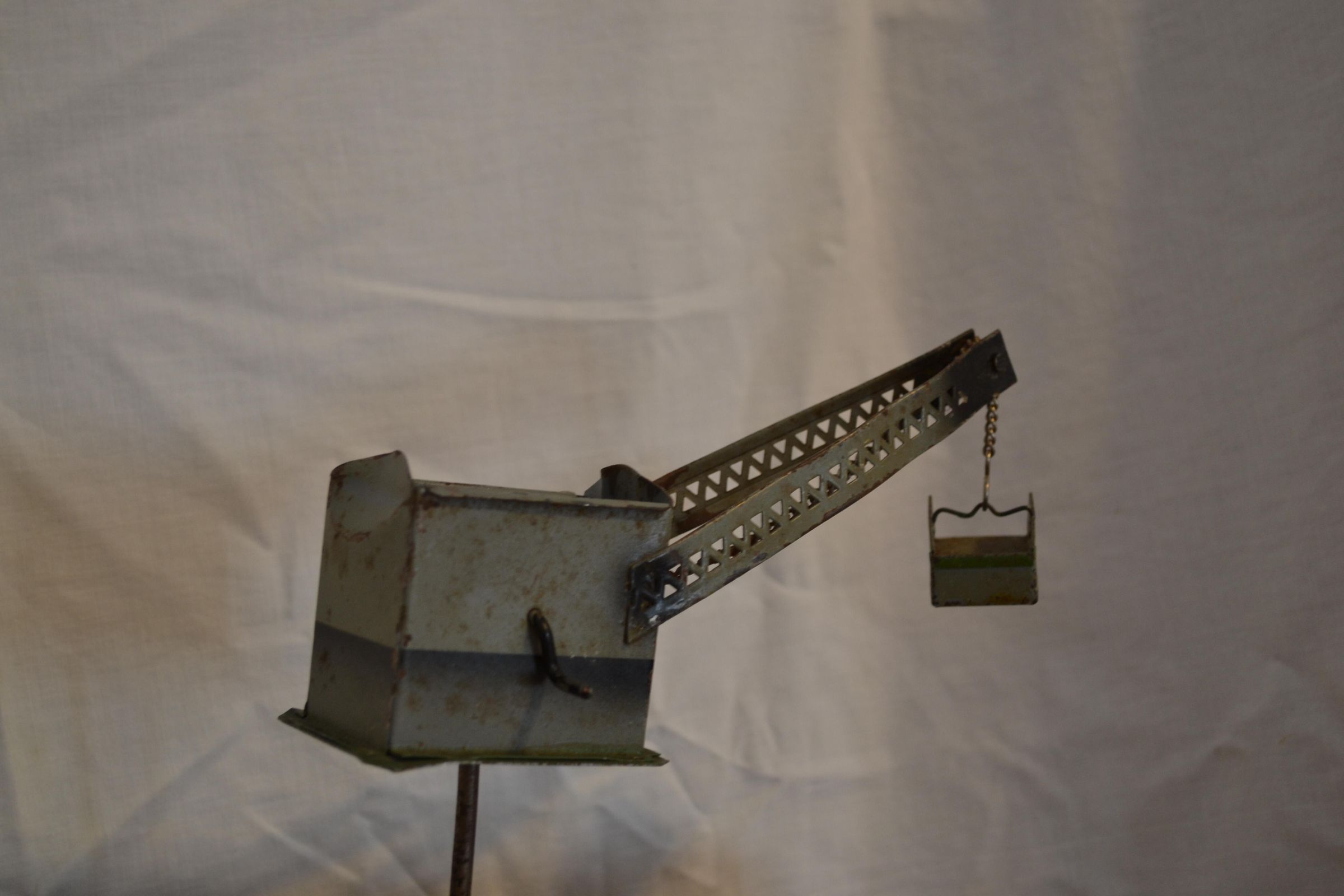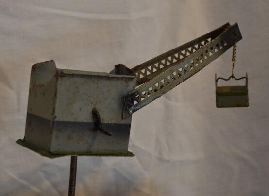 Toy bucket loader attachment for toy train. Tin bucket on chain can be raised and lowered with crank on side, the chain riding through a perforated tin arm extending from operator's cab. Whole arrangement mounted on a metal stem to attach to flat car (?).