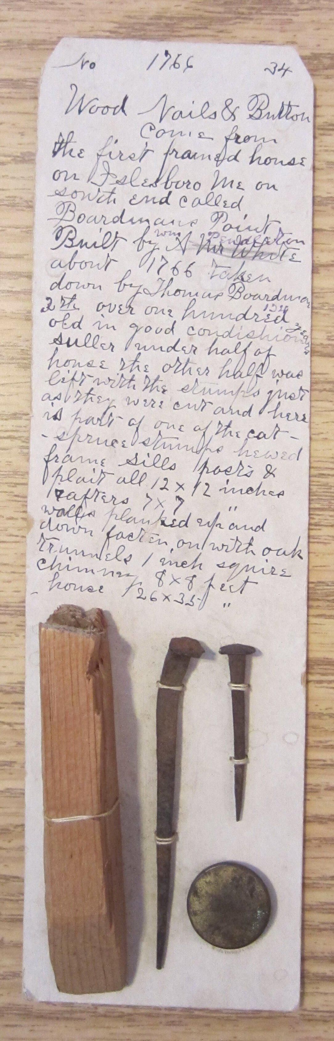 "1766. Wood Nails & Button come from the first framed house on Islesboro, ME on south end called Boardman Point. Built by Wm. Pendleton about 1766 taken down by Thomas Boardman 3rd over one hundred years old in good condishion suller [ed:cellar] under half of house the other half was left with the stumps just as they were cut and here is part of one of the cat-spruce stumps hewed frame sills posts & plait all 12 x 12 inches, rafters 7 x 7 inches walls planked up and down fasten on with oak trunnels 1 inch squire chimney 8 x 8 feet house 26 x 35 feet"