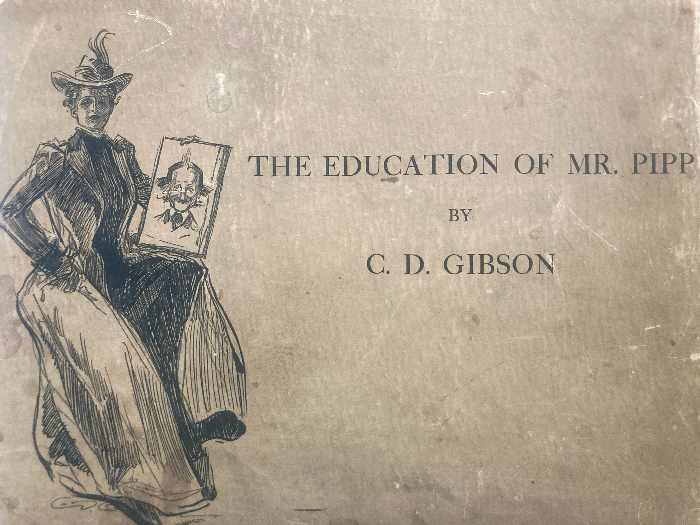Book of drawings by Charles Dana Gibson, "The Education of Mr. Pipp," published by R. H. Russell 1899, copy 1. Inscribed on opening page: "Irina Winslow(?) de Hart, Xmas 1899, from J. C. Jr."