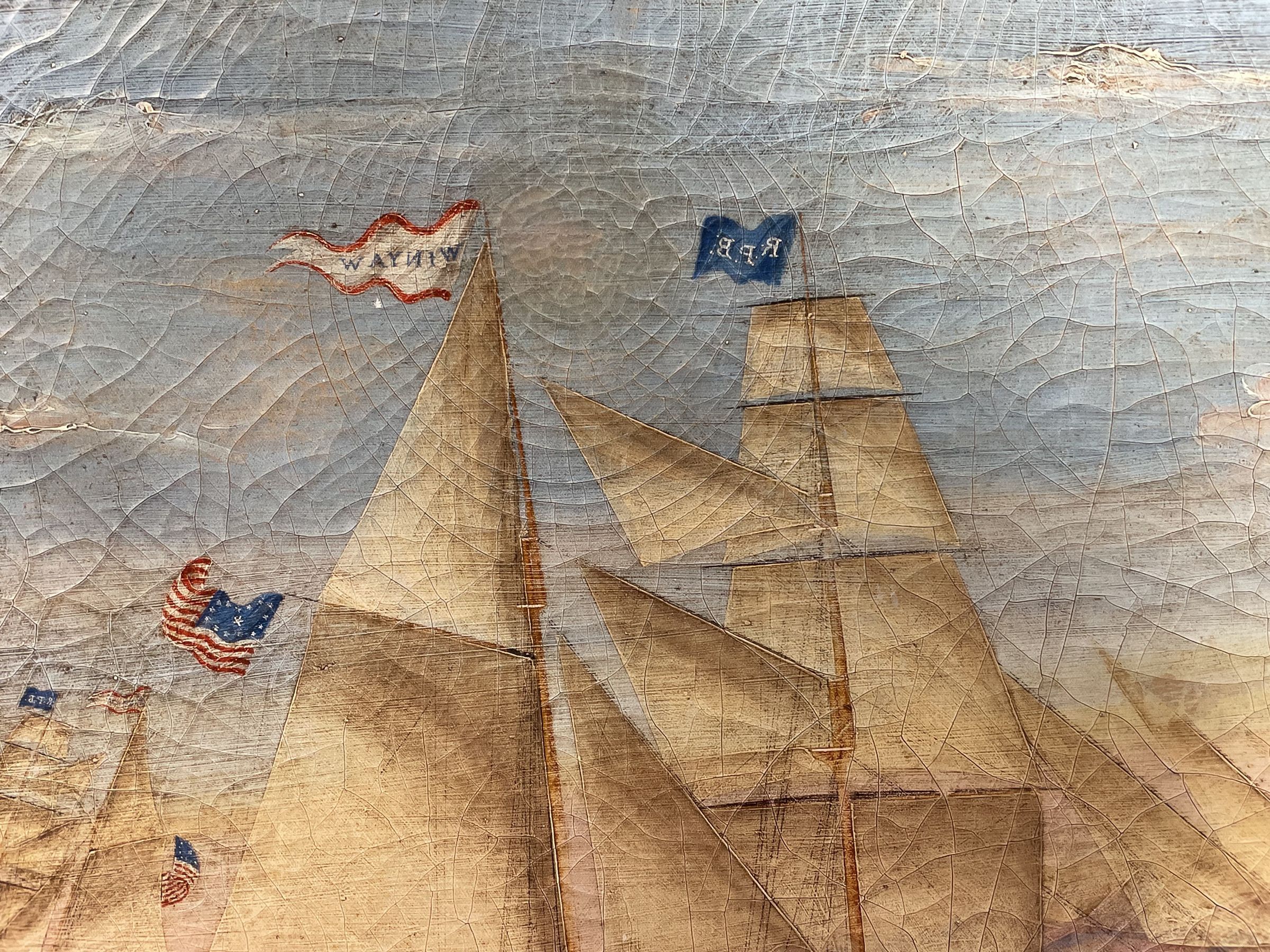 This is a reproduced image of an oil painting, featuring a two masted schooner coming into port. There is a second ship, which appears to be of a similar fleet, just off the stern of the front schooner. The schooner has all sails set and it waving three flags, one of which reads "R. P. B" and the other reads "Winyaw". Both of which are painted backwards.