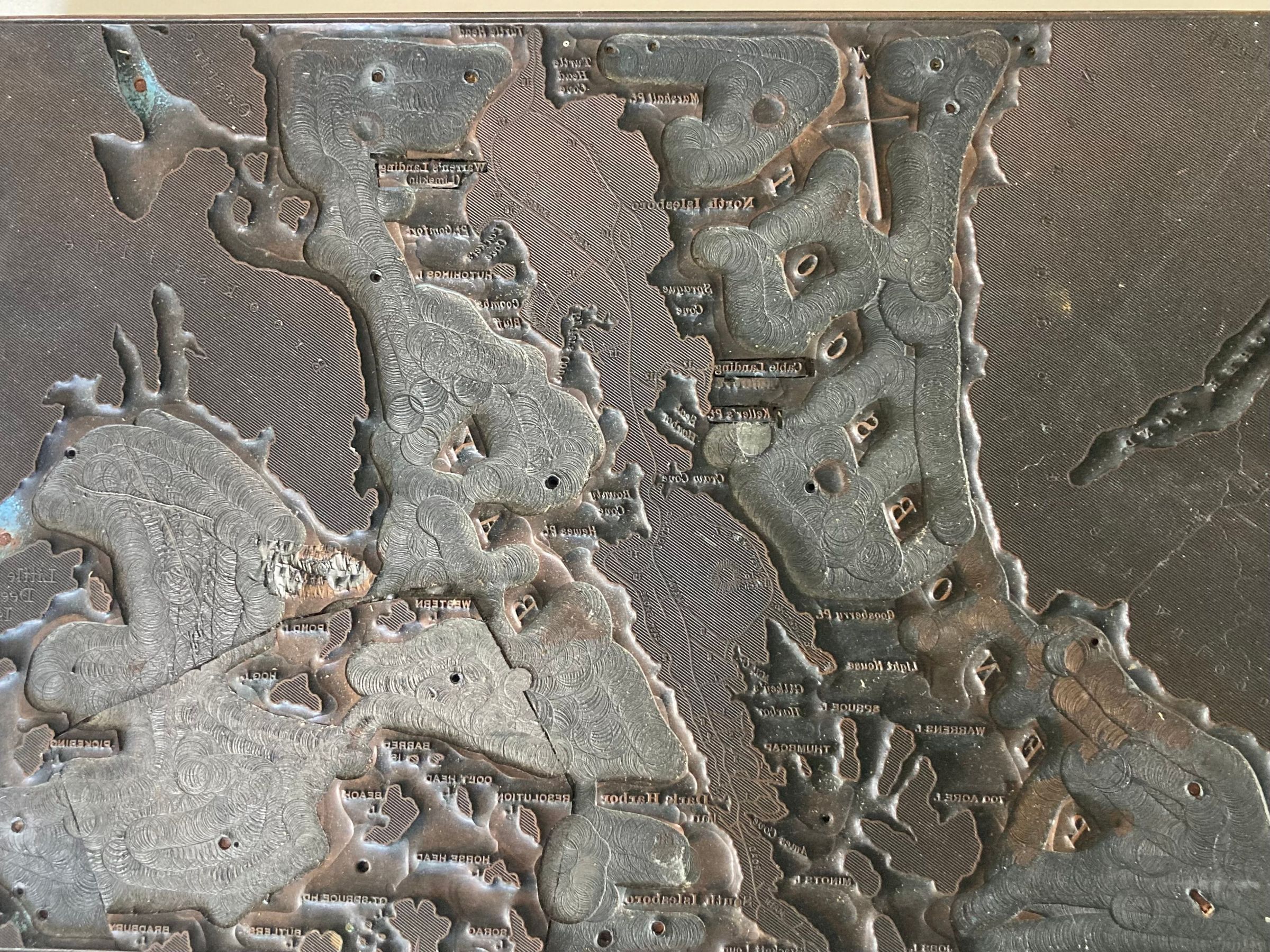 Printing block for a map of Islesboro, metal on wood, 10" x 7", circa 1890? Possible companion to the map reproduced in Farrow's history (2025.020.001). Writing on verso: "Return to:-- Mrs. George Nevens, Oldfields School, Glencoe, Maryland 21152"