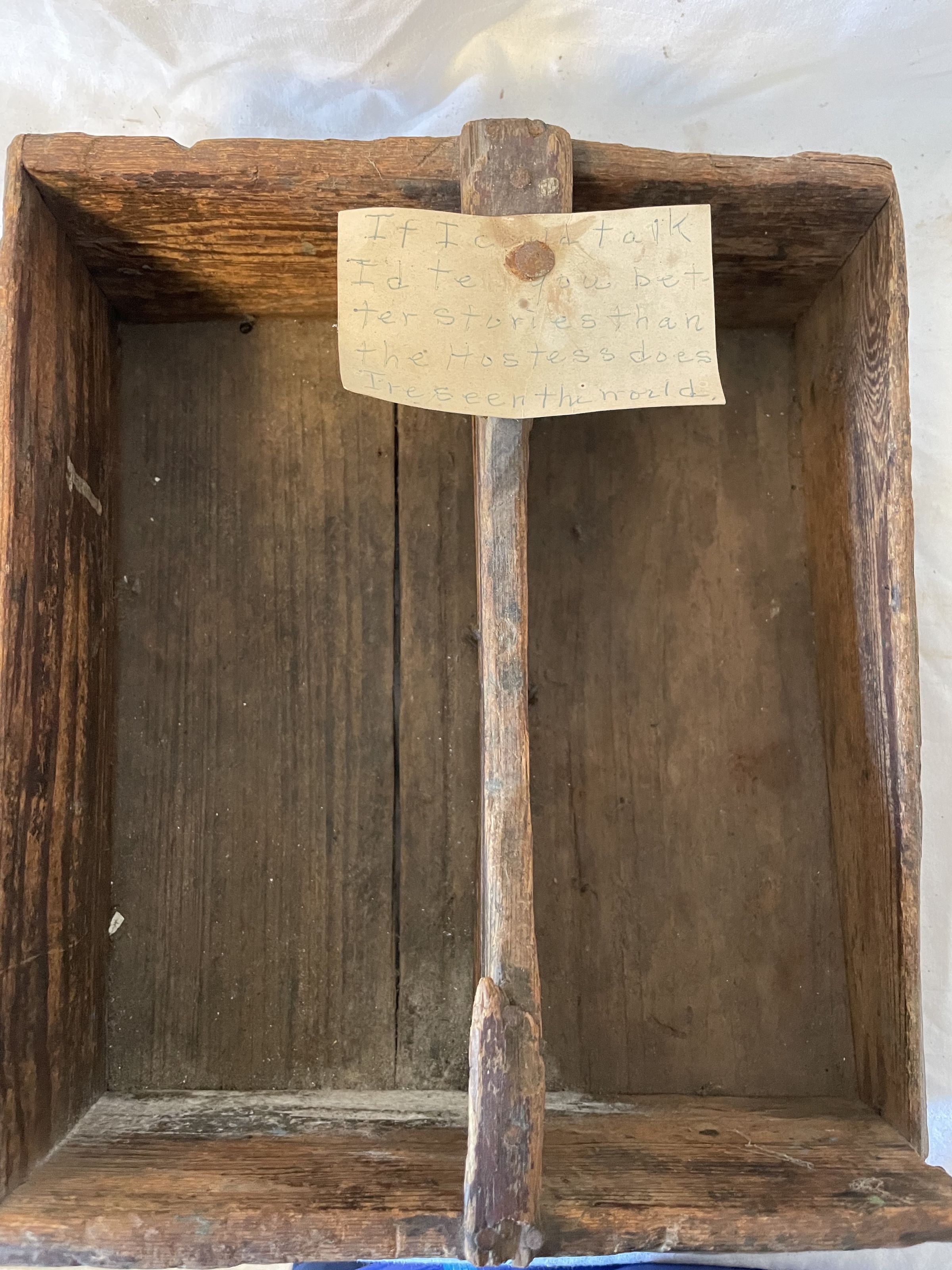 An open wooden box that has a center divider, most likely a broken off handle. The attached tag read: "If I could Talk, i'd tell better stories then the hostess. I've seen the world"