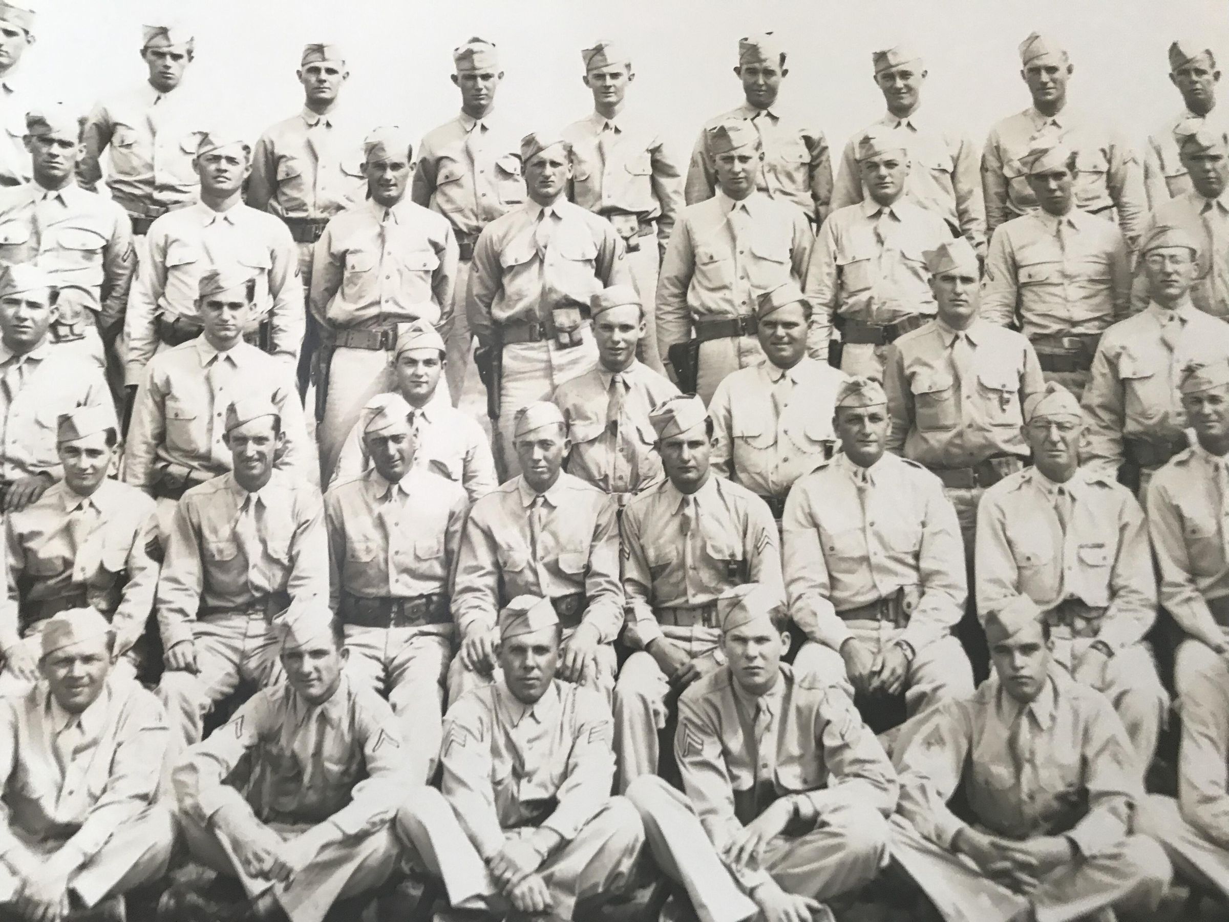 Panoramic group photo of airmen. Mailed by Pvt. Marcellus Williams to Miss Alice Williams. Mailed August 2, 1943.