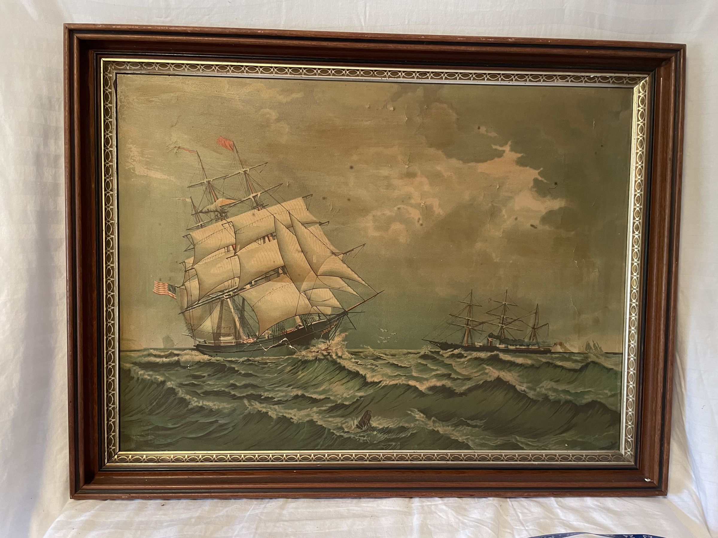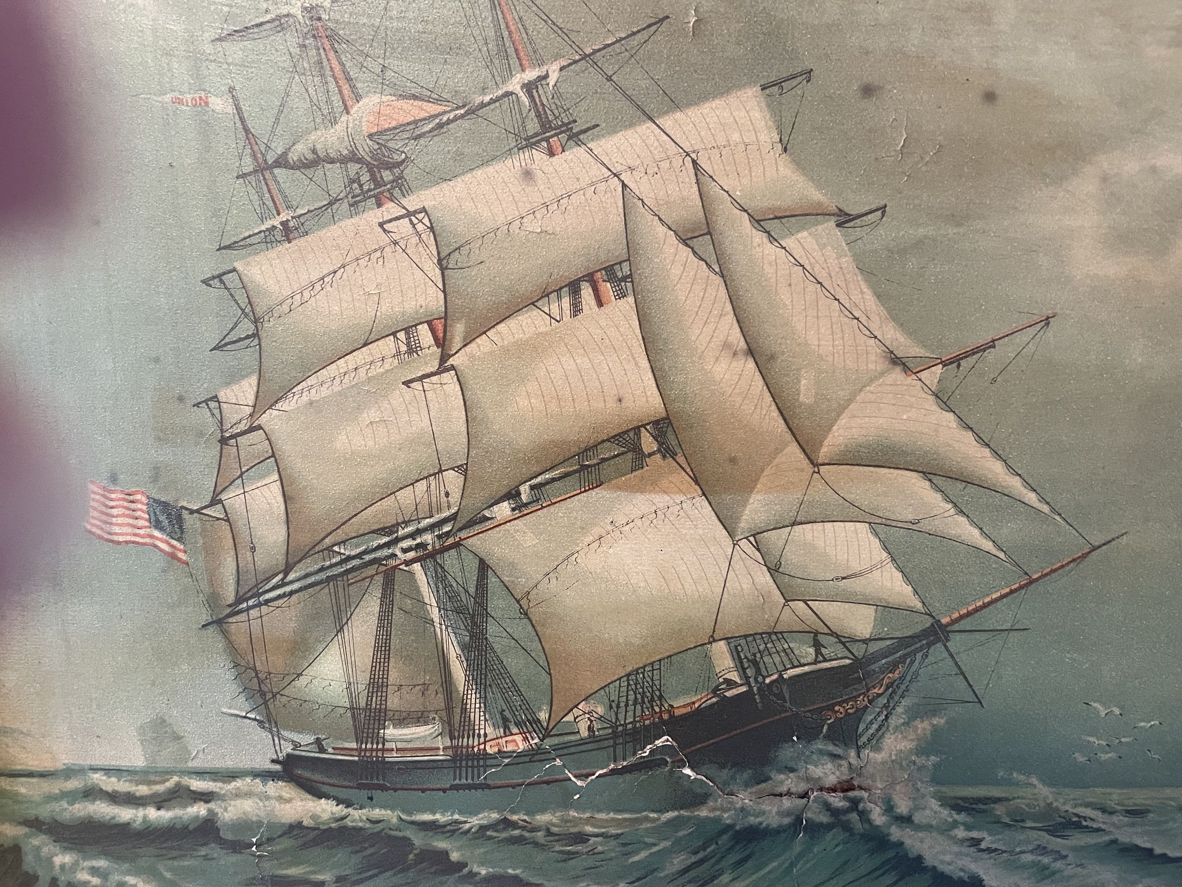 Framed Color Print of a Barkentine and Steamer Under Sail.