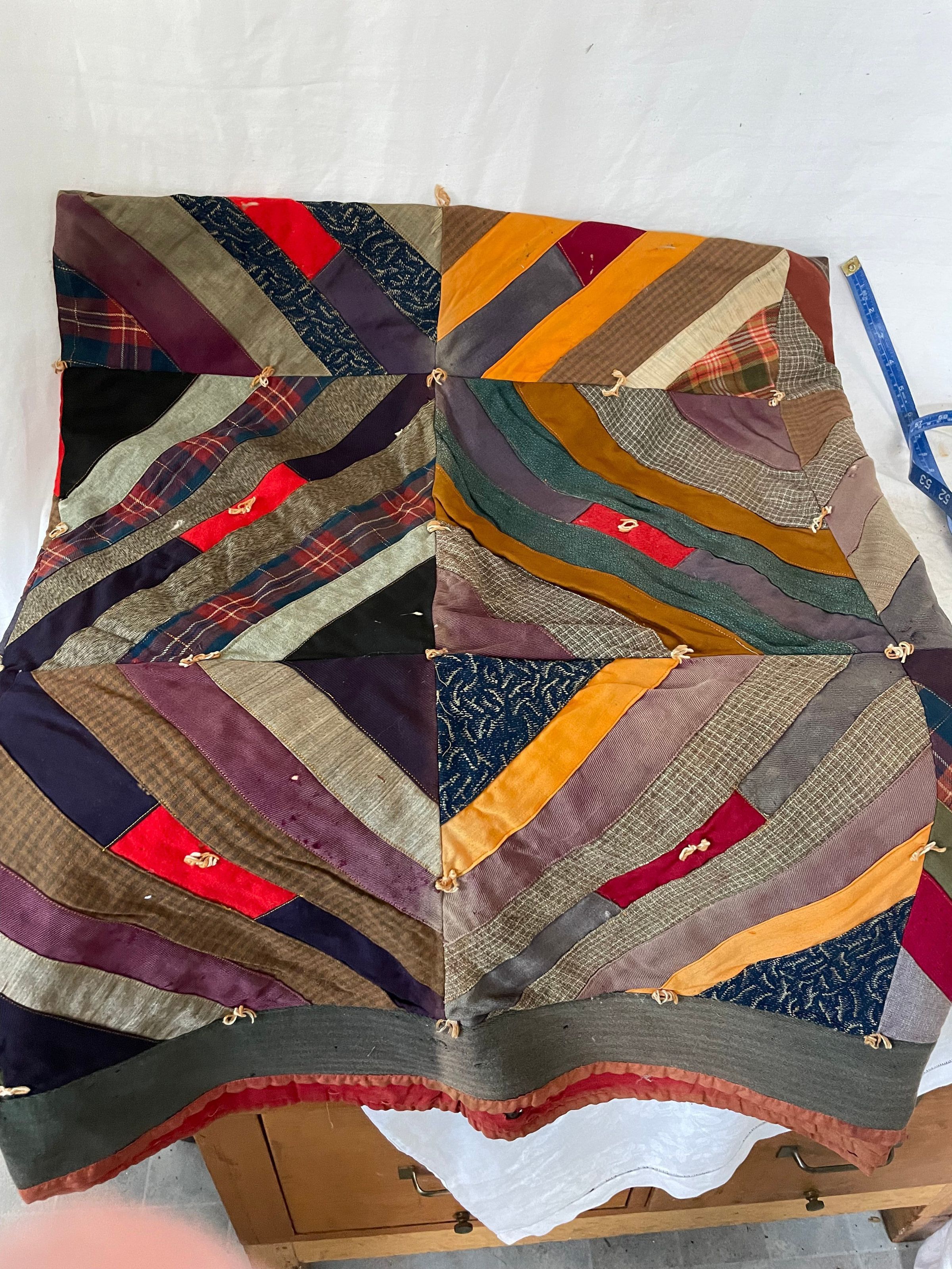 A tied quilt featuring many different fabrics, lots of flannel and various colors. Well worn in patches