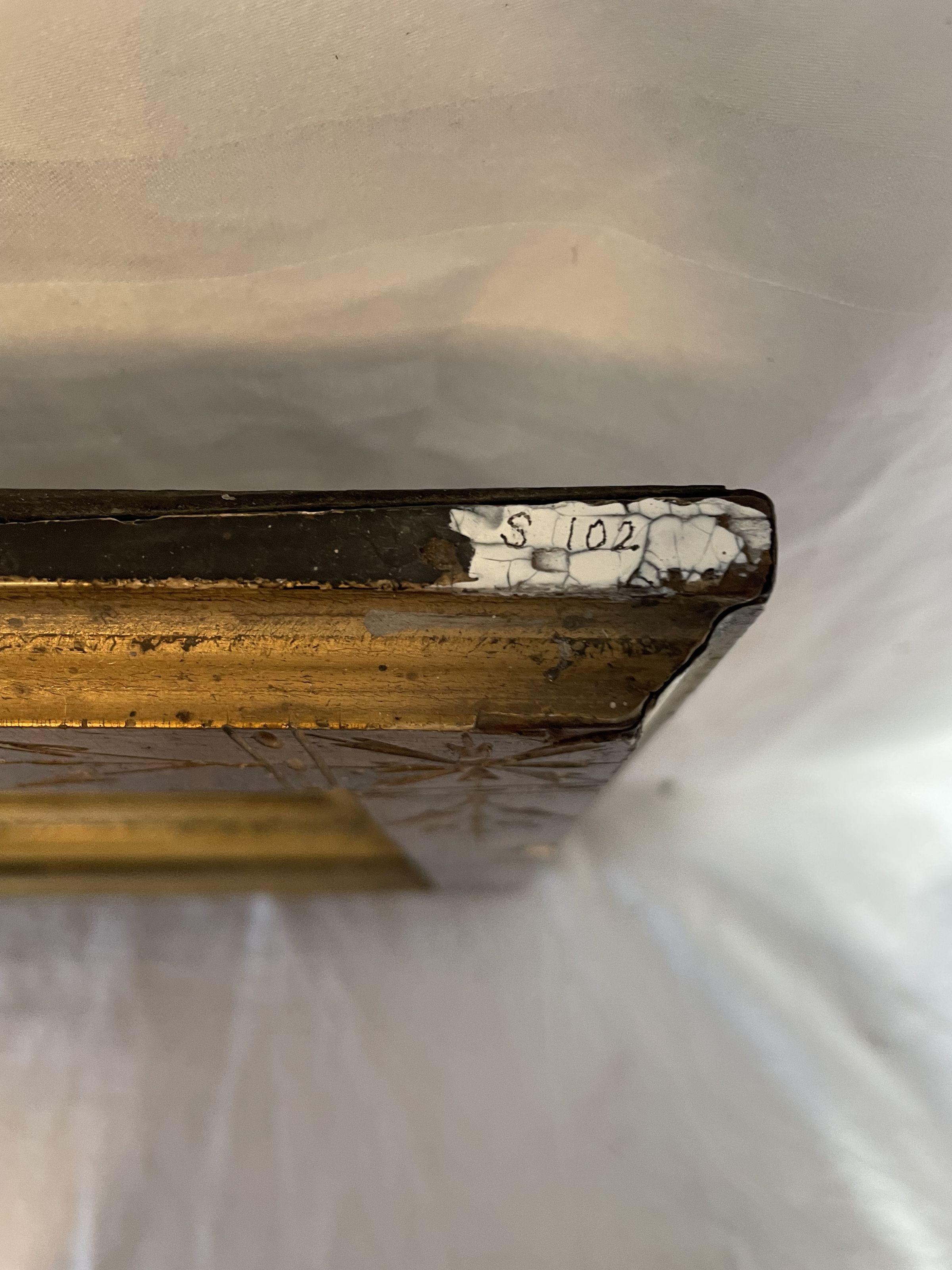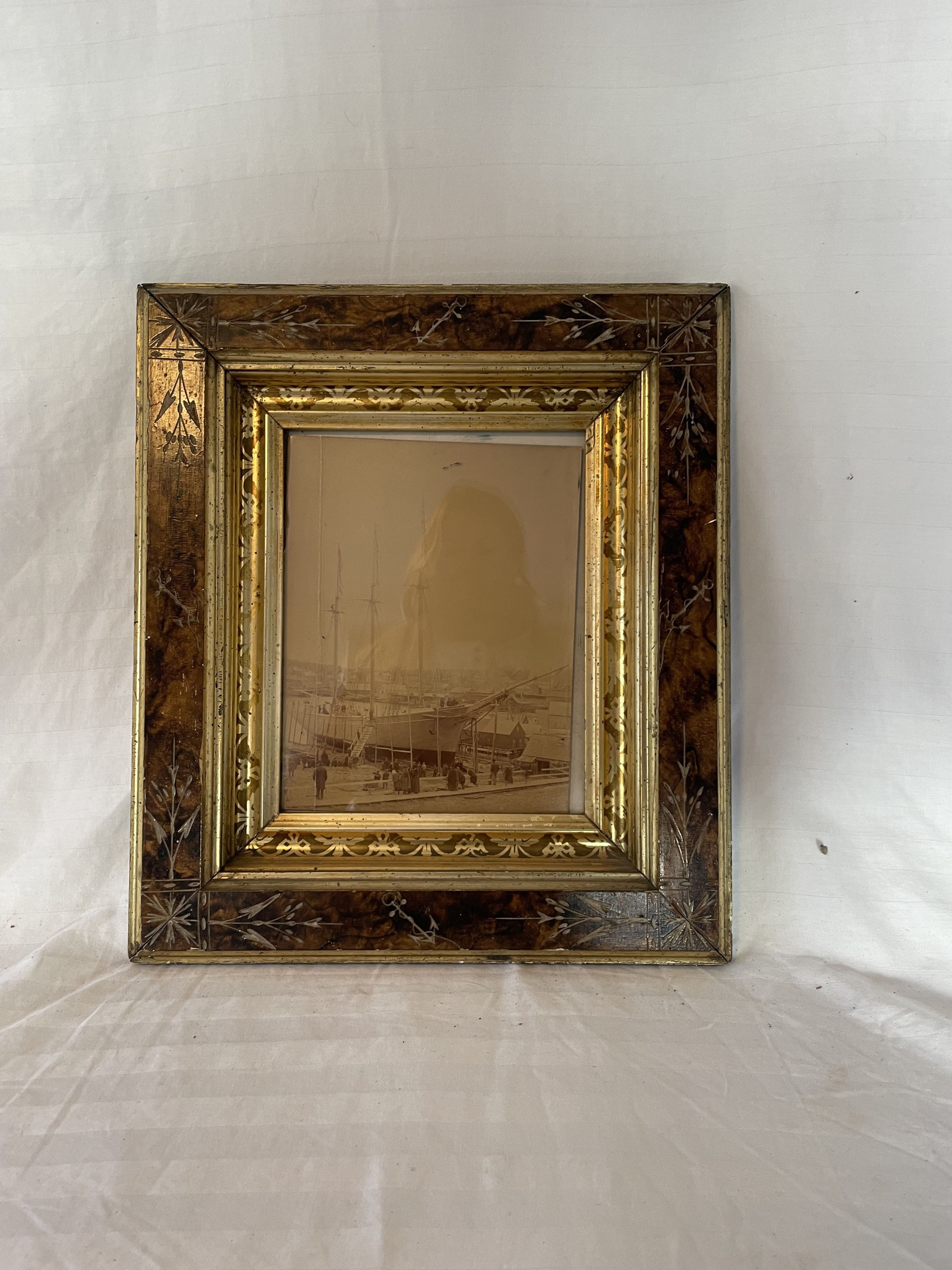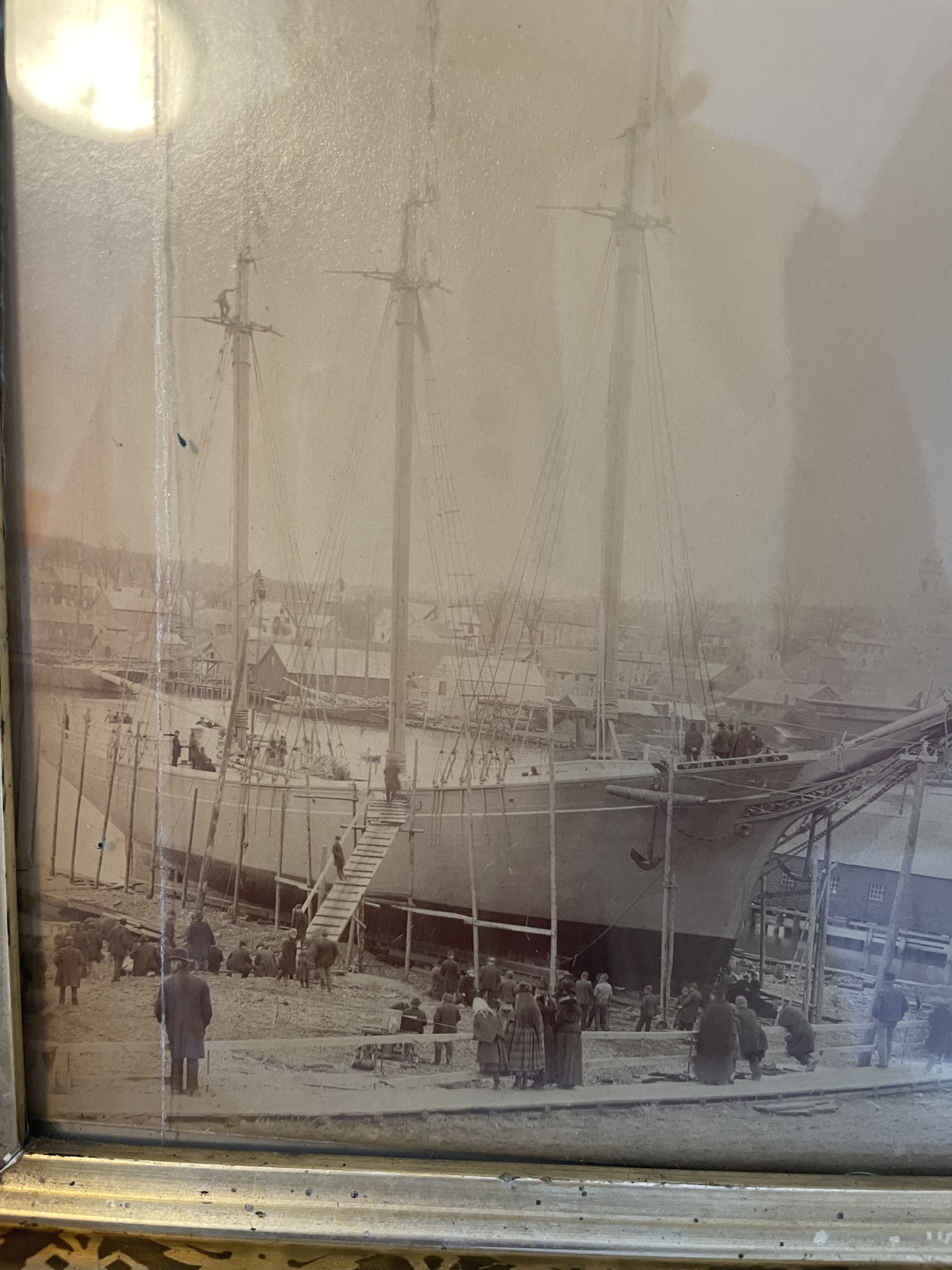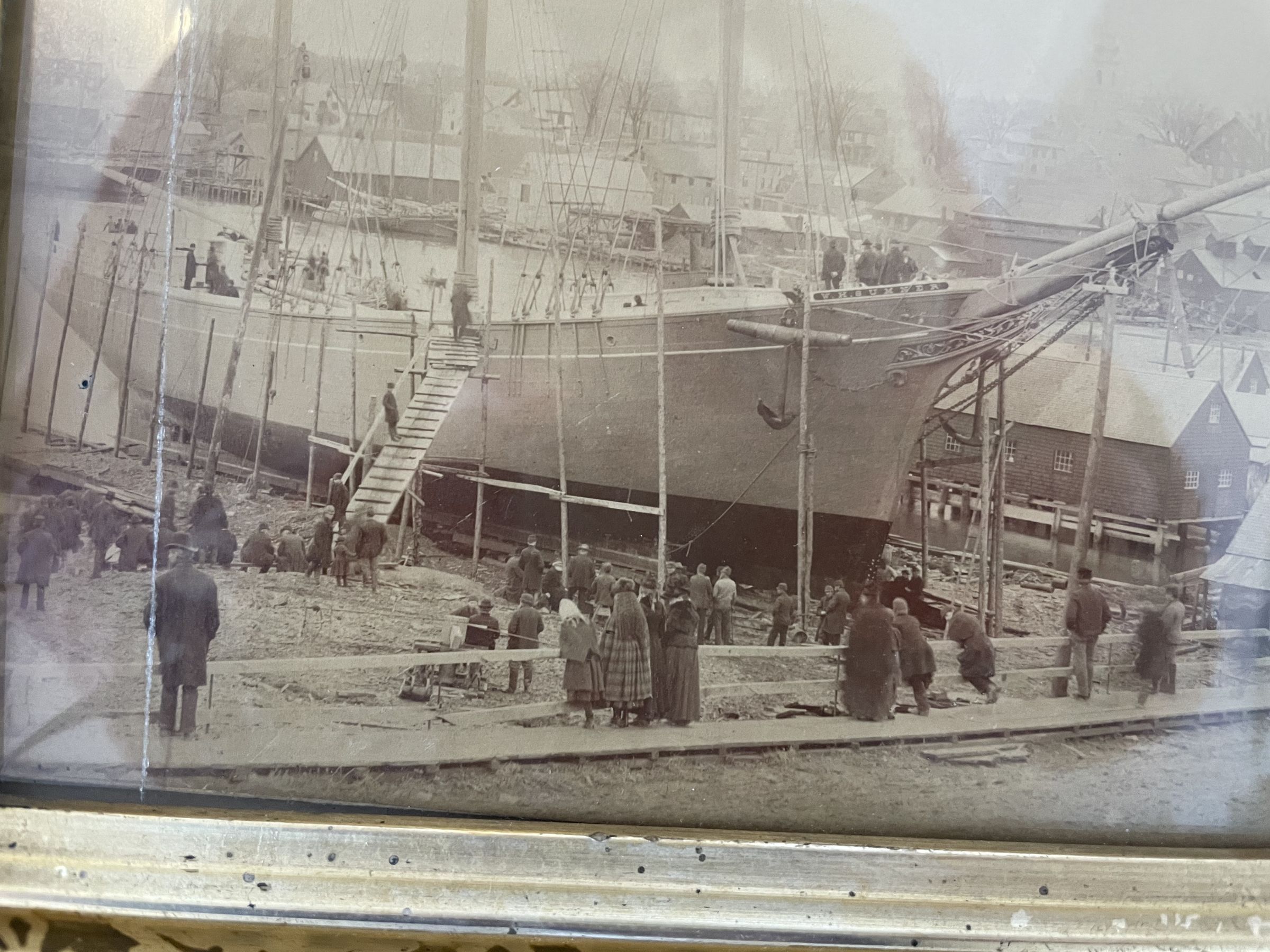 A framed sepia image of a three masted schooner being launched in front of an audience of people. The people are dwarfed by the gigantic haul of the ship, which is sitting above the water line. The vessel and harbor are both unidentified.