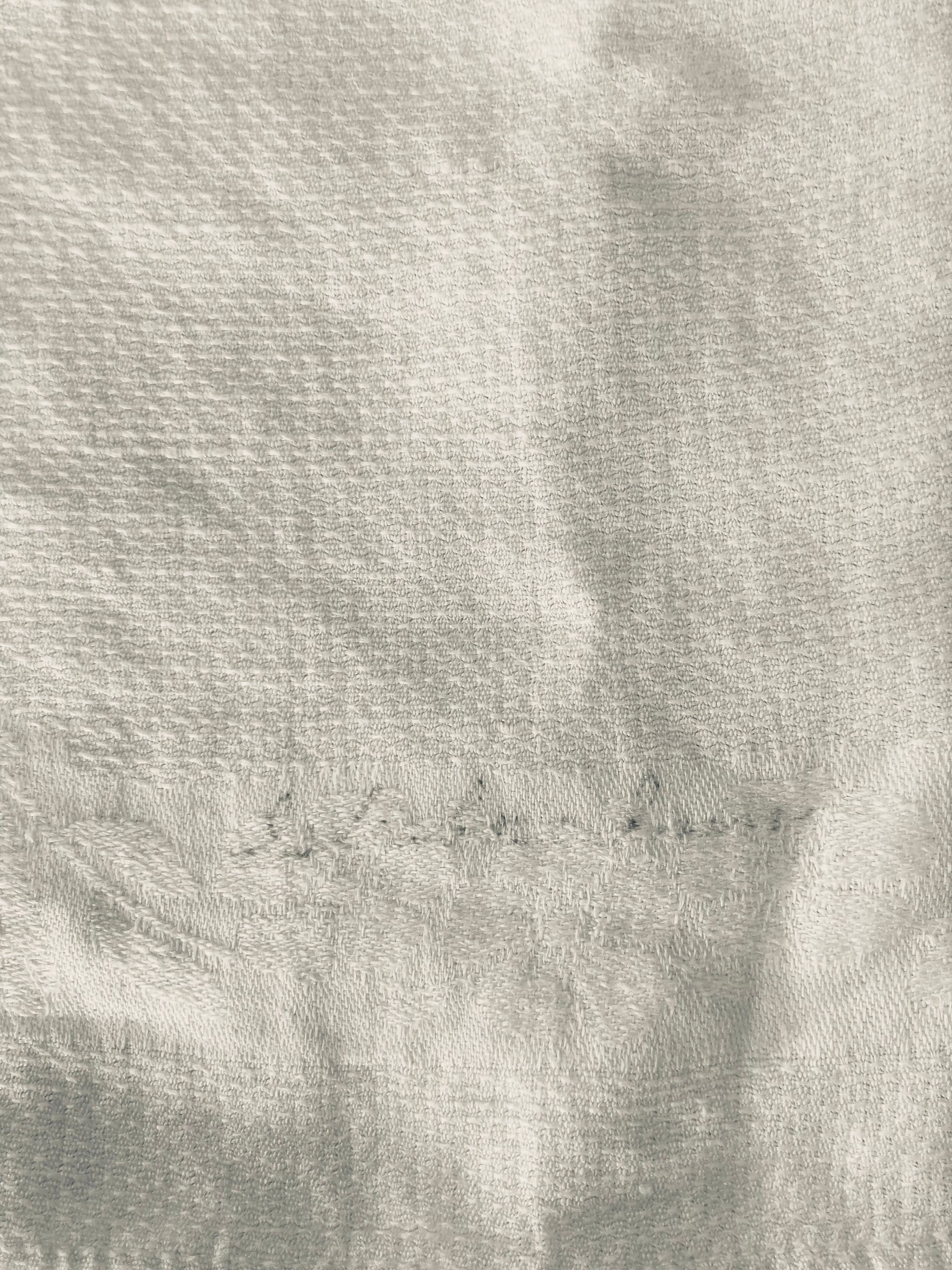White linen tea towel (18" x 36") embroidered "Islesboro Inn." Embroidered name is very faint.