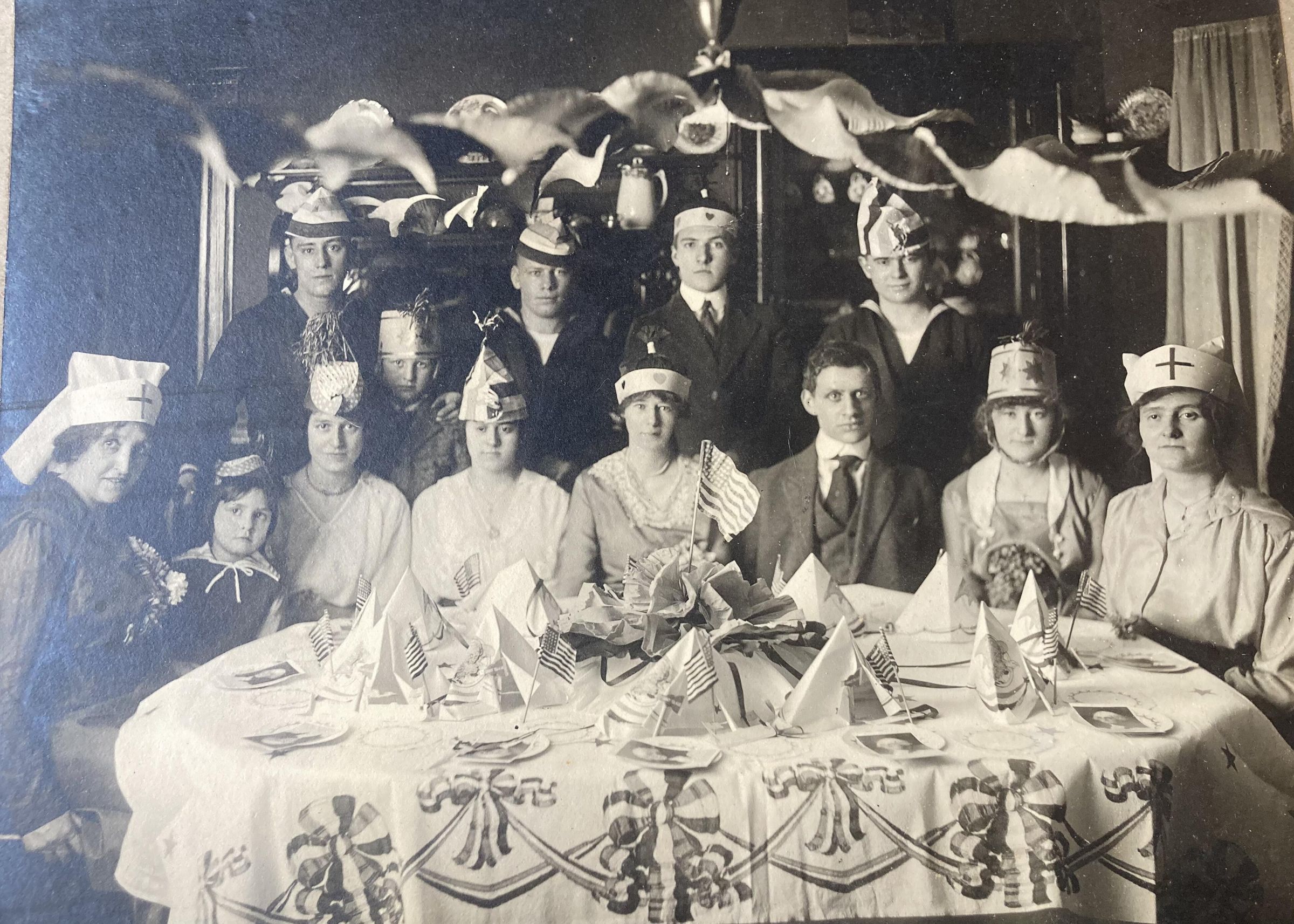 Group portrait of a patriotic celebration, early 20th century. Flags, bunting, place settings on table include photo of George Washington. Five men, three in sailor uniforms, two in suits. Six women, two in nurses uniforms, four in dresses. One small child. Most of the group in party hats. Sitters not identified. Part of the Marcellus Williams bequest.