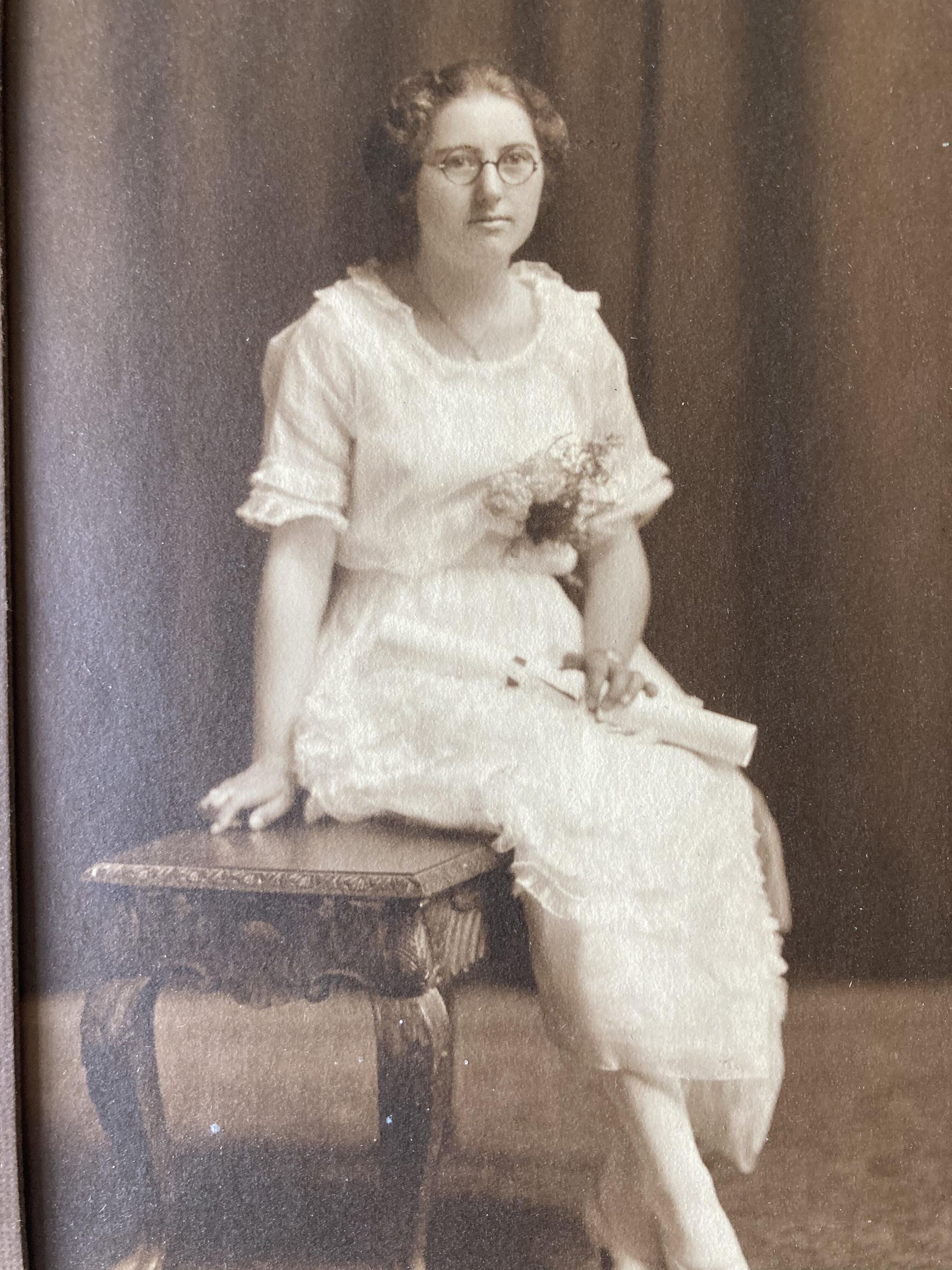 Studio portrait of a young woman in an ankle-length white ruffled dress. She wears wire-rimmed glasses and holds a diploma. Circa 1920s/1930s? Identified on cardboard frame as Beatrice Horton. Connection to Islesboro not clear, but part of Marcellus Williams bequest. Frame somewhat damaged by mold.