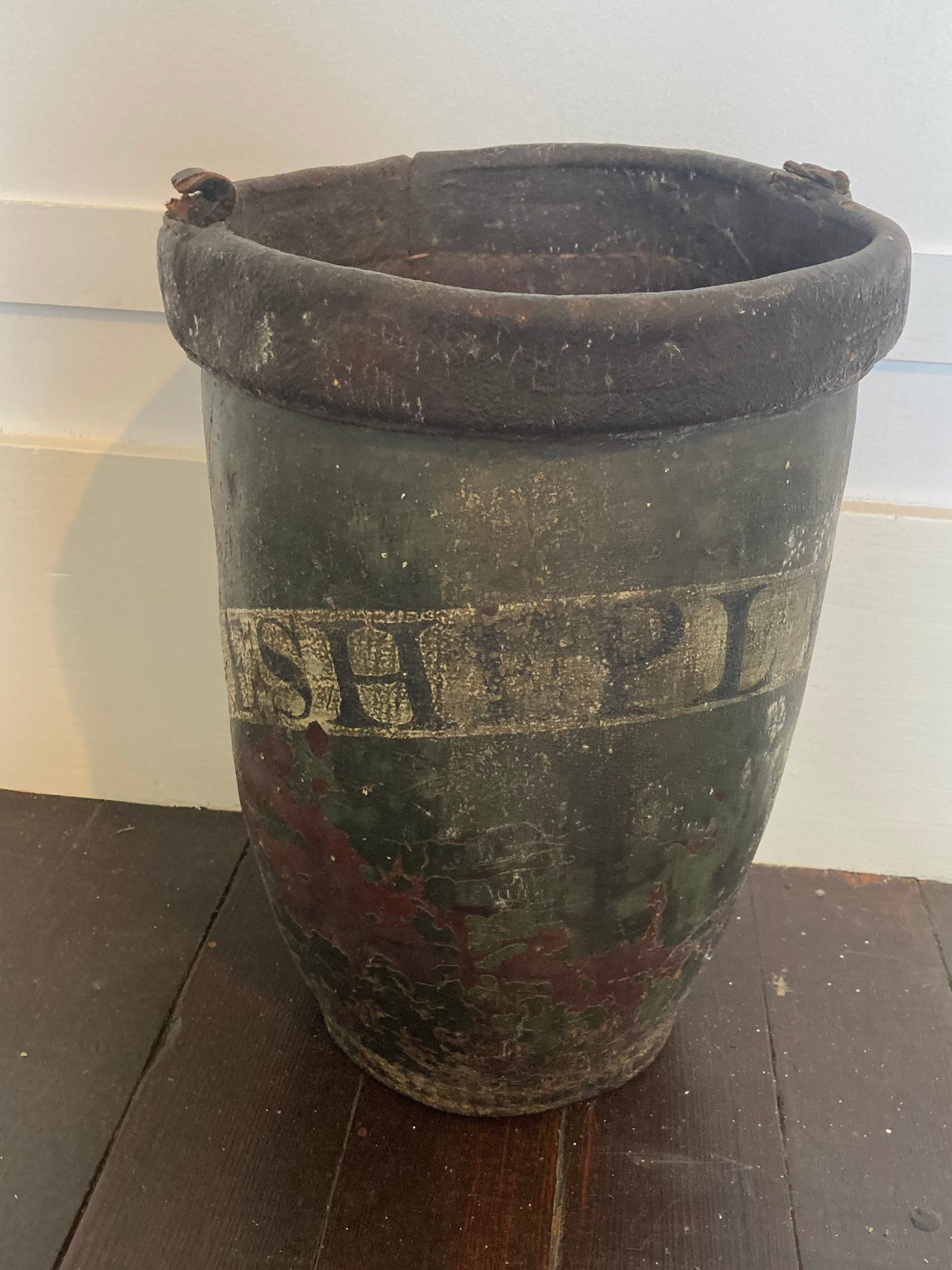 "E. S. Shipley" in black lettering on a pale yellow banner. Green ground, round rim. 13" high, 9" diameter. Very worn. 18th-19th century?
