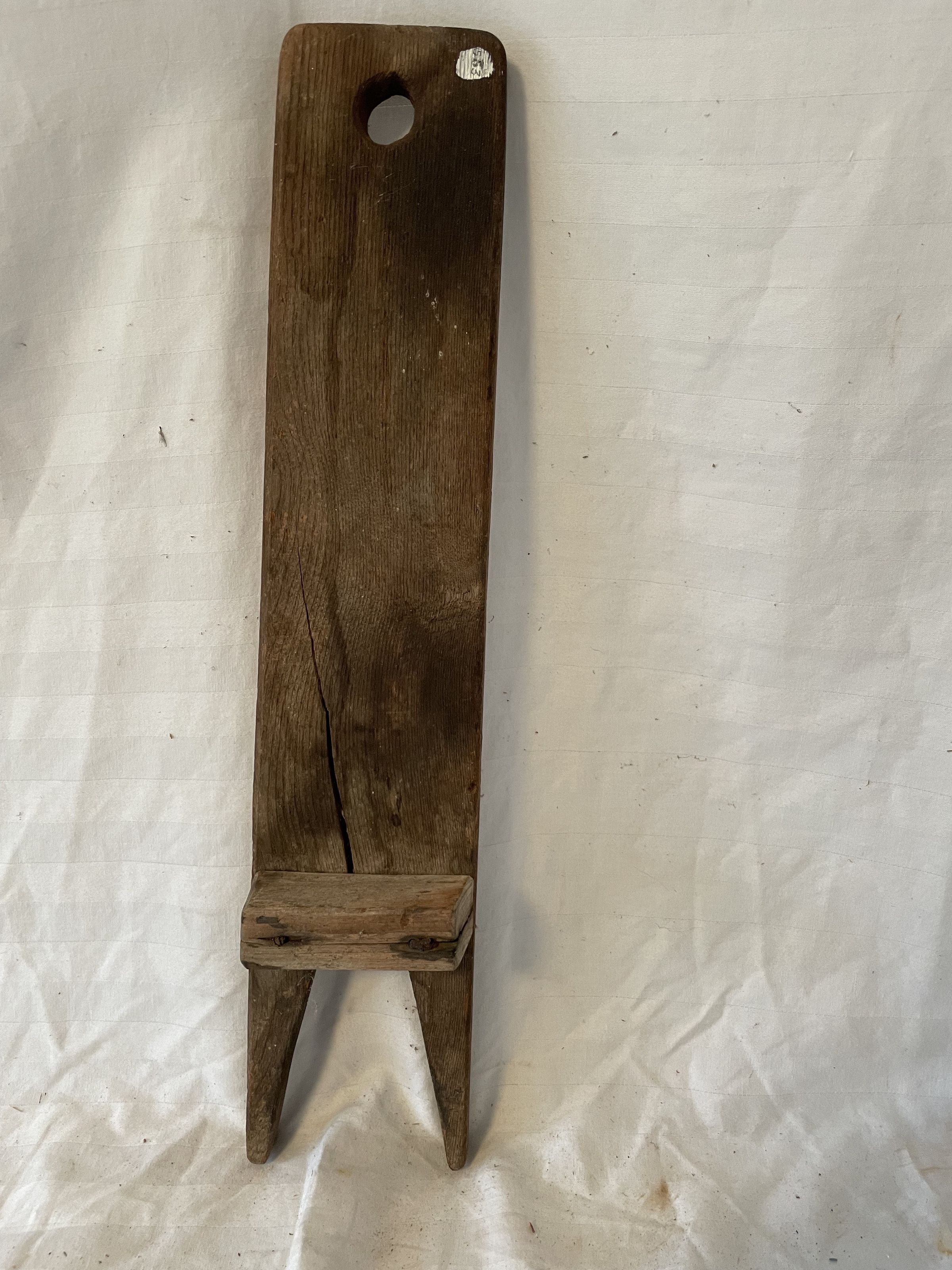 A wooden plank with two prongs carved out of one end and a hole cut out of the top middle