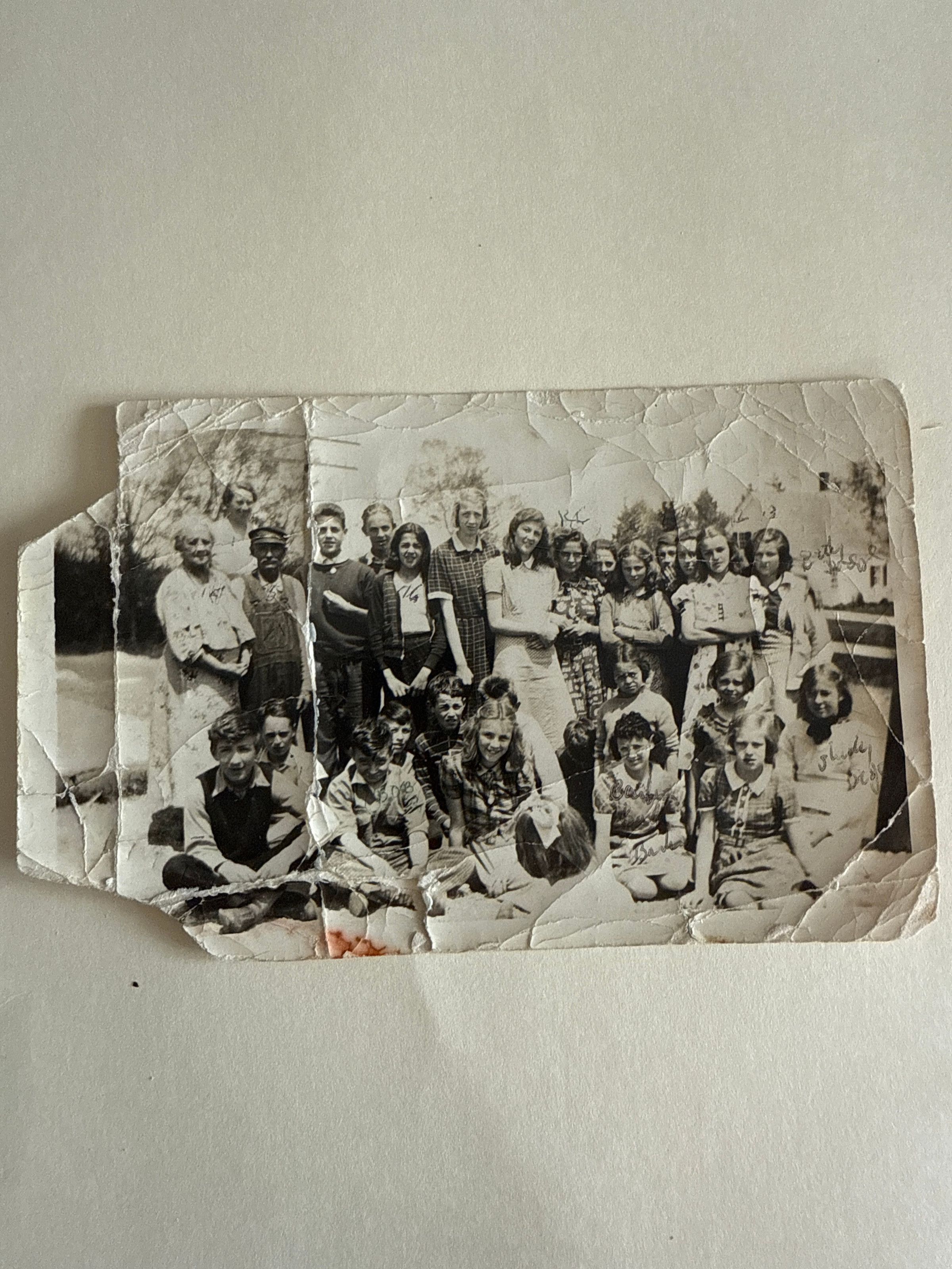 Group of children and adults. On back is a partial list of numbered names, and some numbers or initials are marked on the photo.
