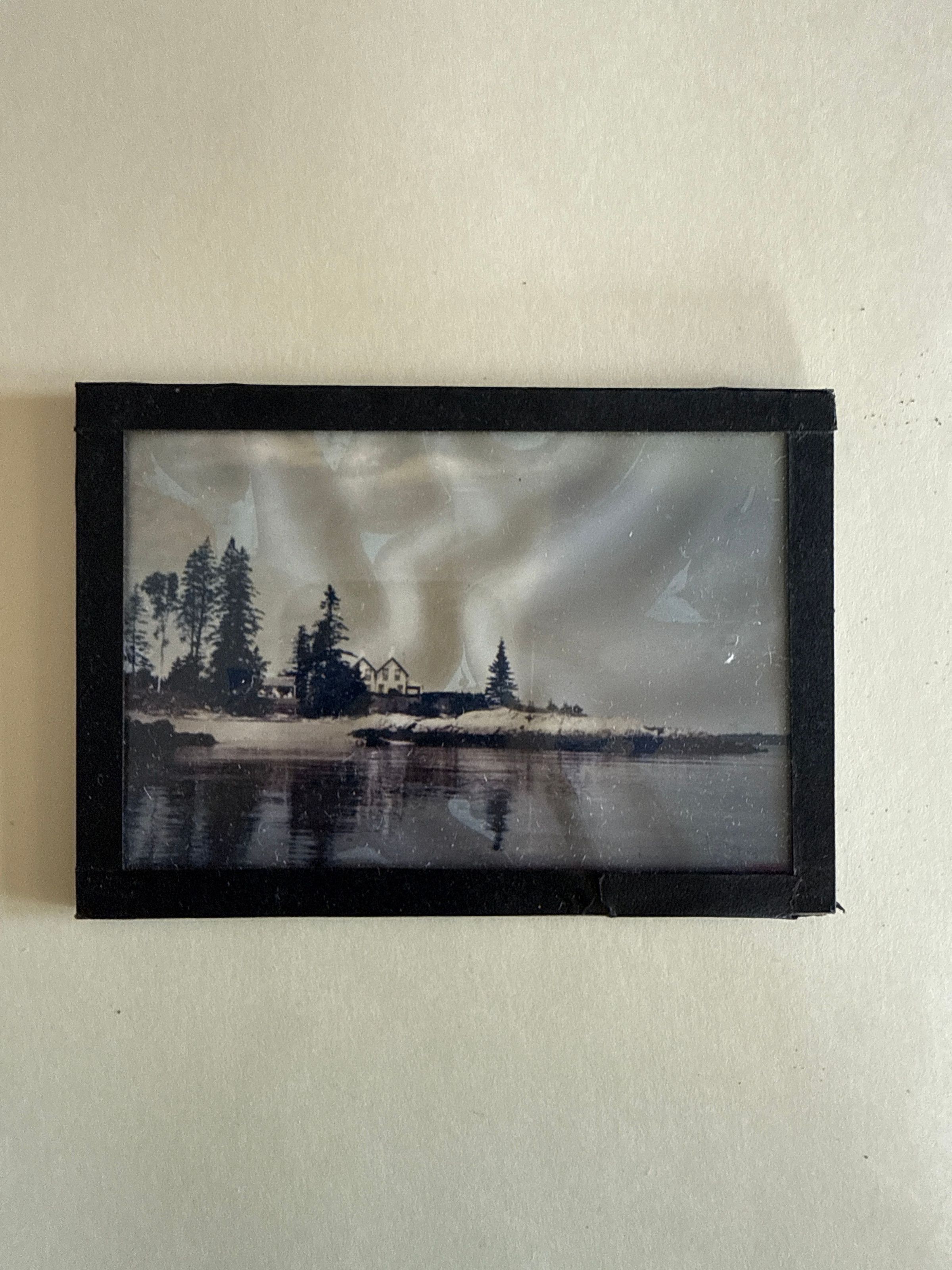This is enclosed between glass and a cardboard backing and sealed with black tape with a picture hook on back.