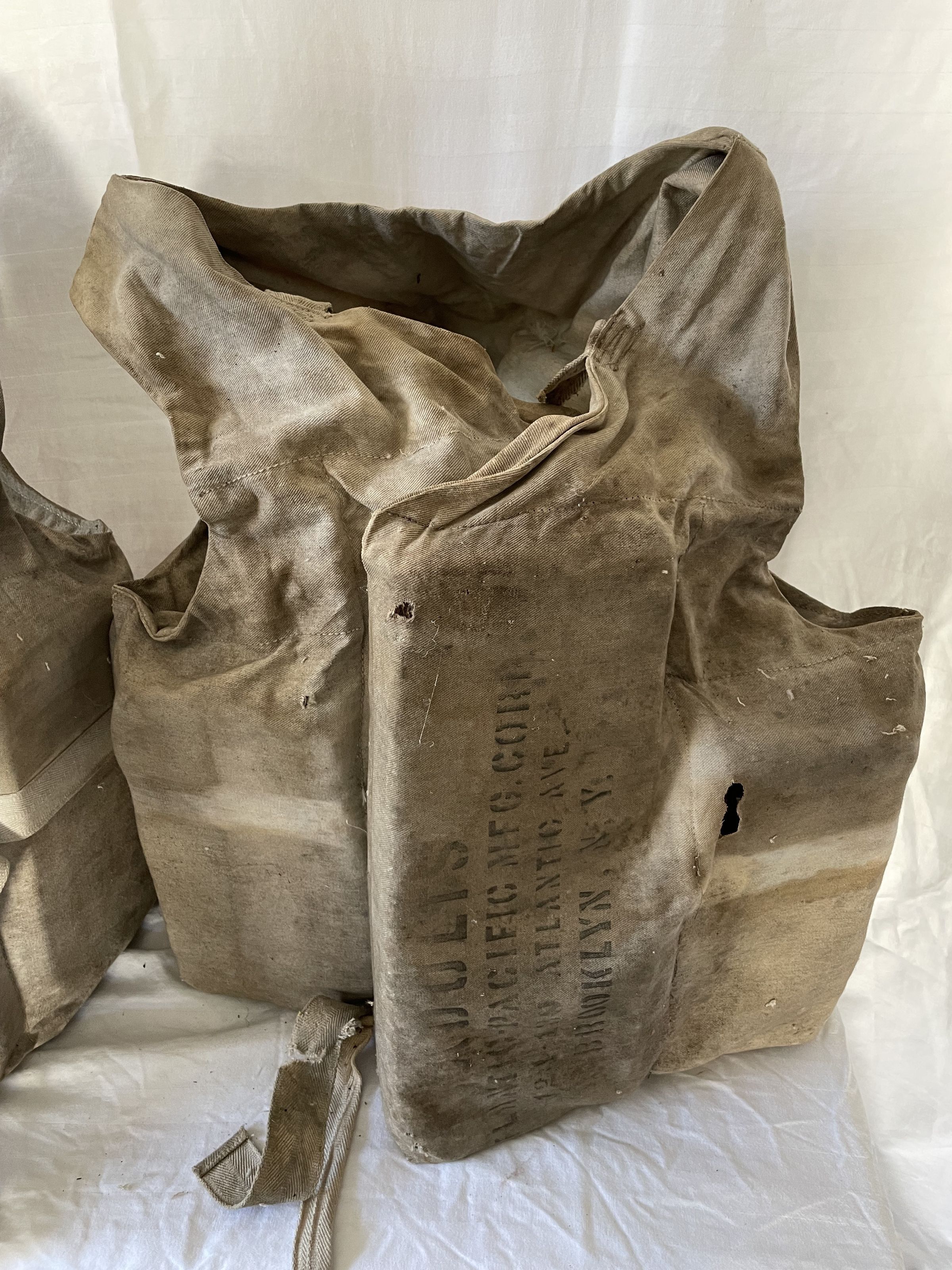 White canvas, although very dirty and aged, with hand ties at the waist. Manufactured by Atlantic Pacific Manufacturing Corp in Brooklyn NY.