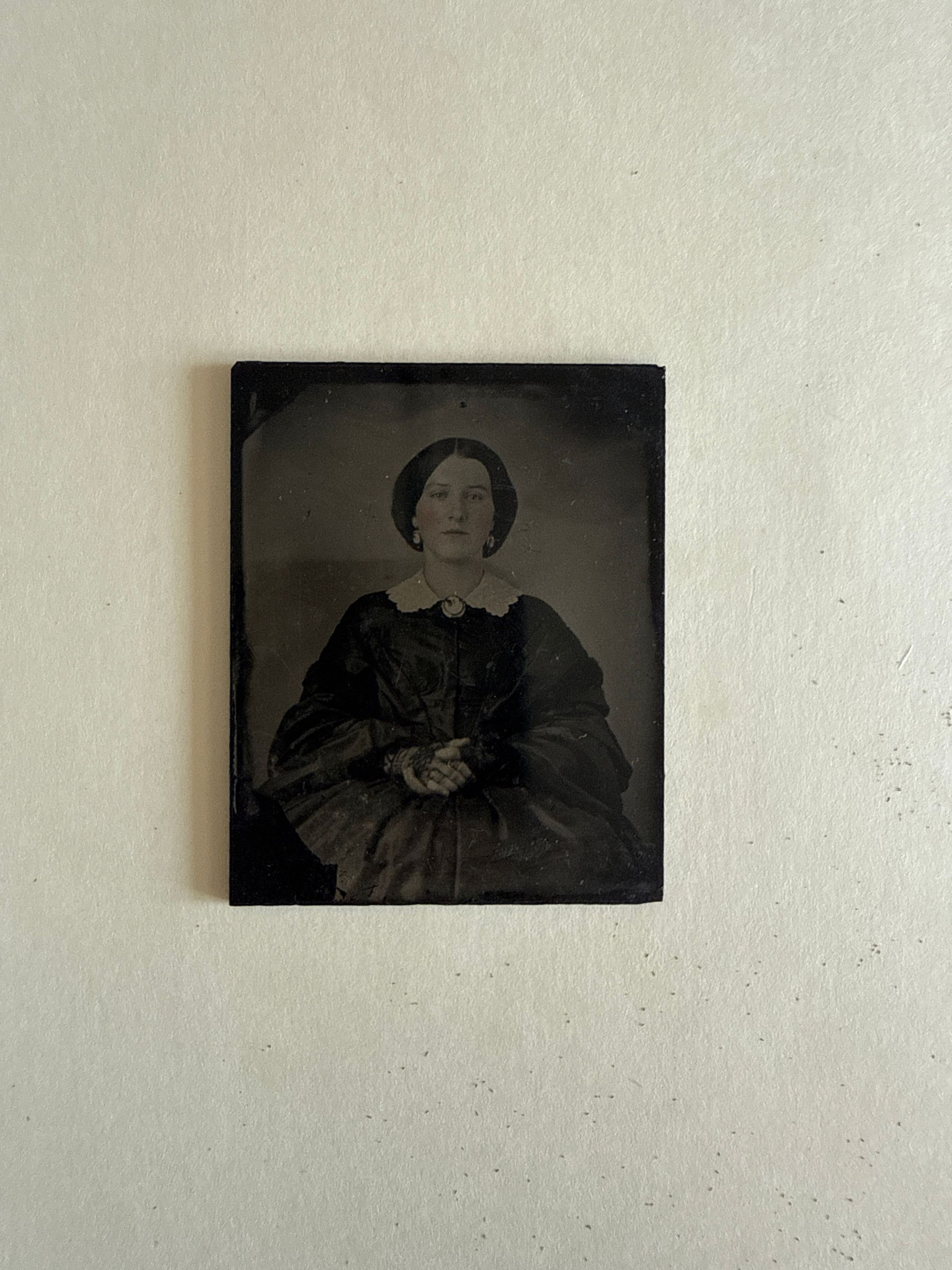 Formal portrait of a woman, hands clasped at her waist. Tinted cheeks. Wearing earrings, black dress with huge sleeves, white collar, cameo brooch.