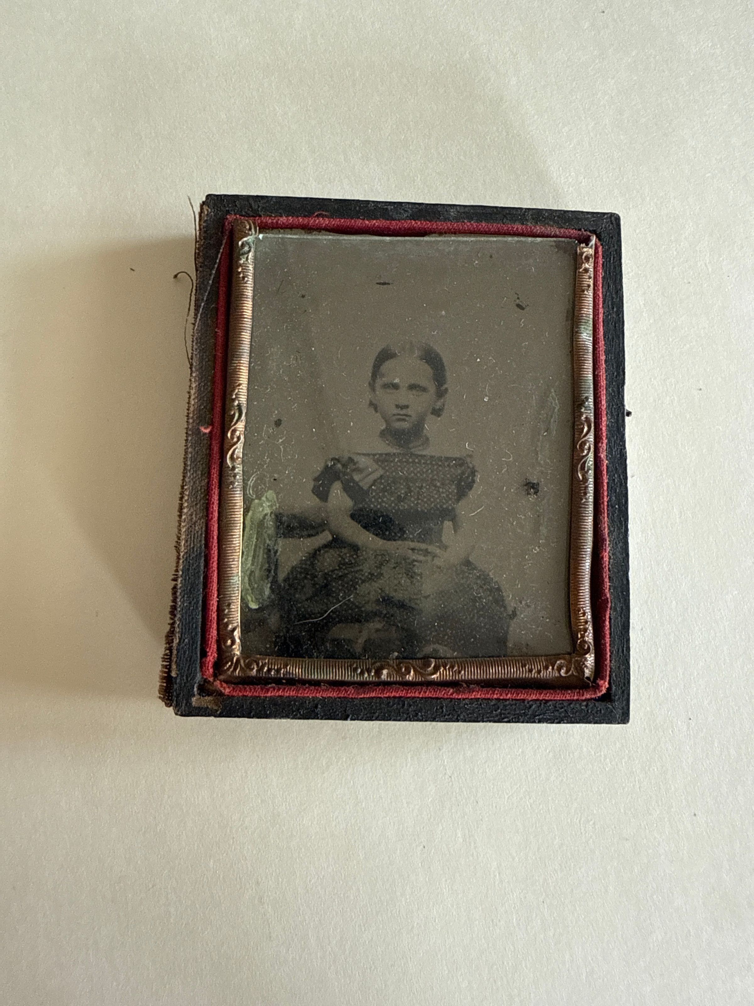 Formal portrait of a girl, seated. Wearing an off-the-shoulder party dress. No identification