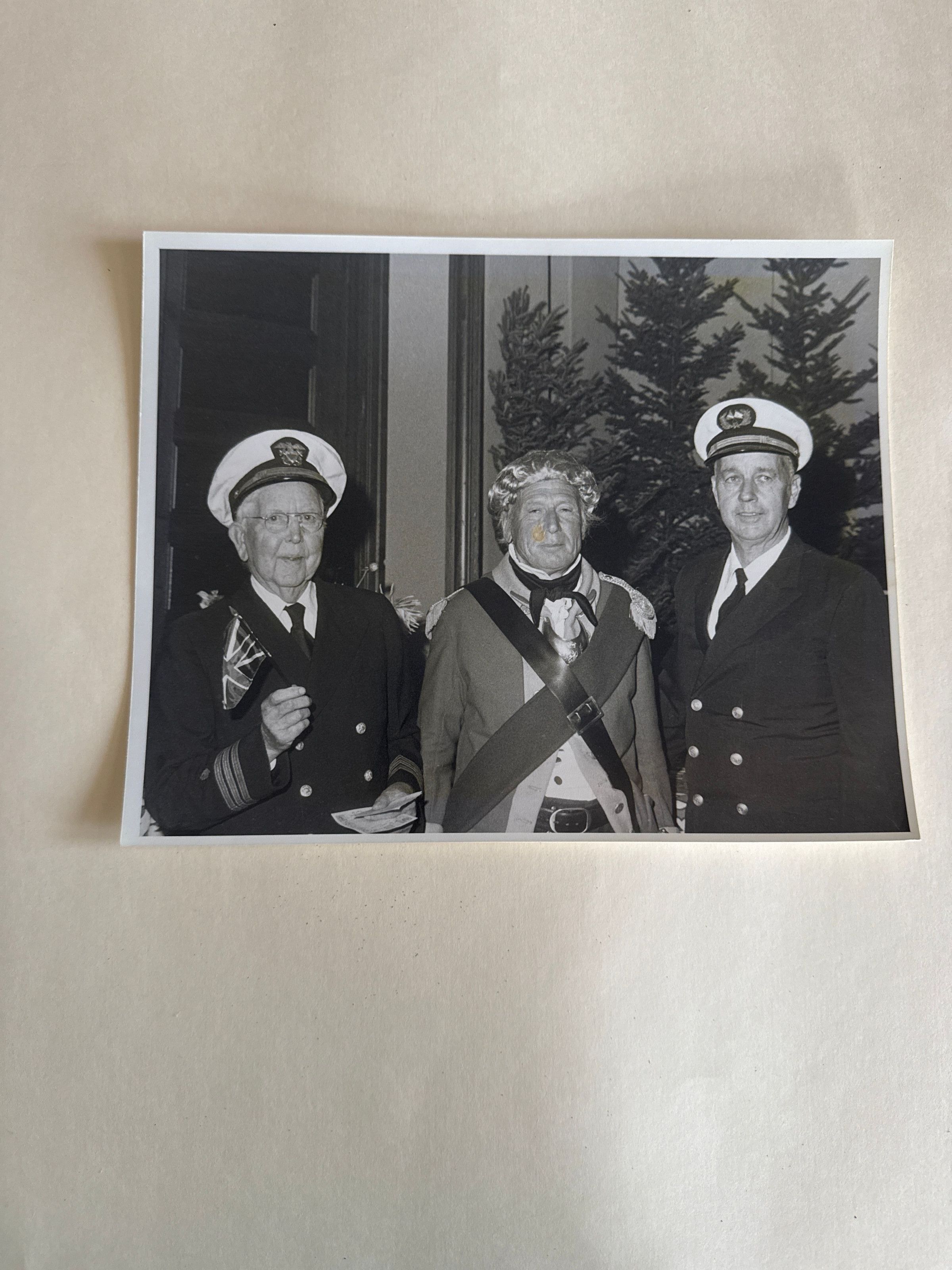 Black and white photograph showing Comm. R.K. Pendleton in U.S. Navy uniform, Col. Eugene Johnston of Stockton Springs in uniform of the 74th Argyle Highlanders, and Jesse Rolerson in U.S. Coast Guard uniform. Picture taken at time of eclipse observation reenactment, 1980.