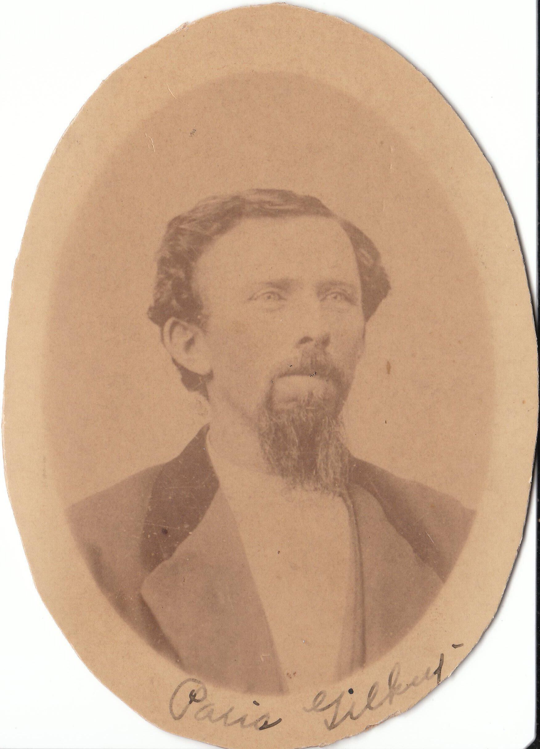 Oval, possibly cut from a cabinet photo, but the photo itself is only 2 1/2" x 3 1/4" Identified as Paris Gilkey by ink inscription at bottom. Part of Series 2002.002.7001