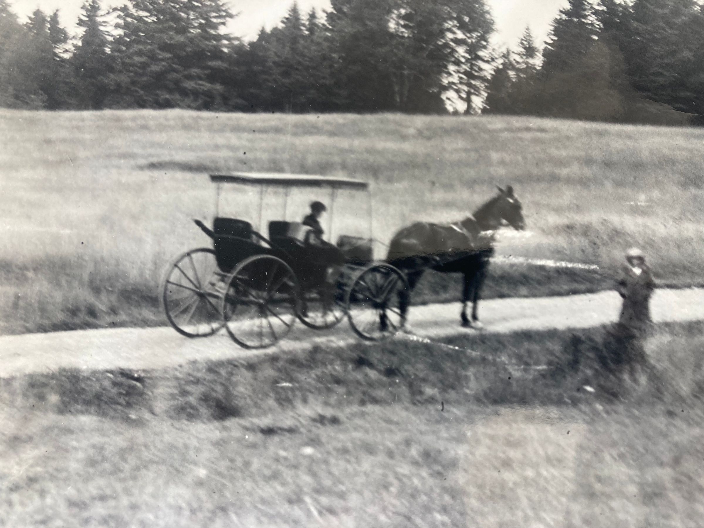 Photograph of a four-wheeled carriage with 2 seats and a flat top, drawn by one horse.There is a driver and beside the road is a person who seems to be turned toward the camera. The photo is unclear, apparently enlarged too much.