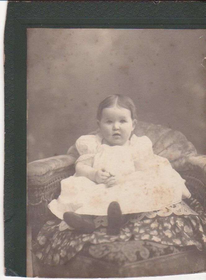 Child (about a year old) in white dress seated in a large chair. Note in pencil on back may be pertinent, or not: in Pensacola, bound for Cuba, in Pendleton fleet's Sch Two Sisters, 1901. Nothing to identify the child.
