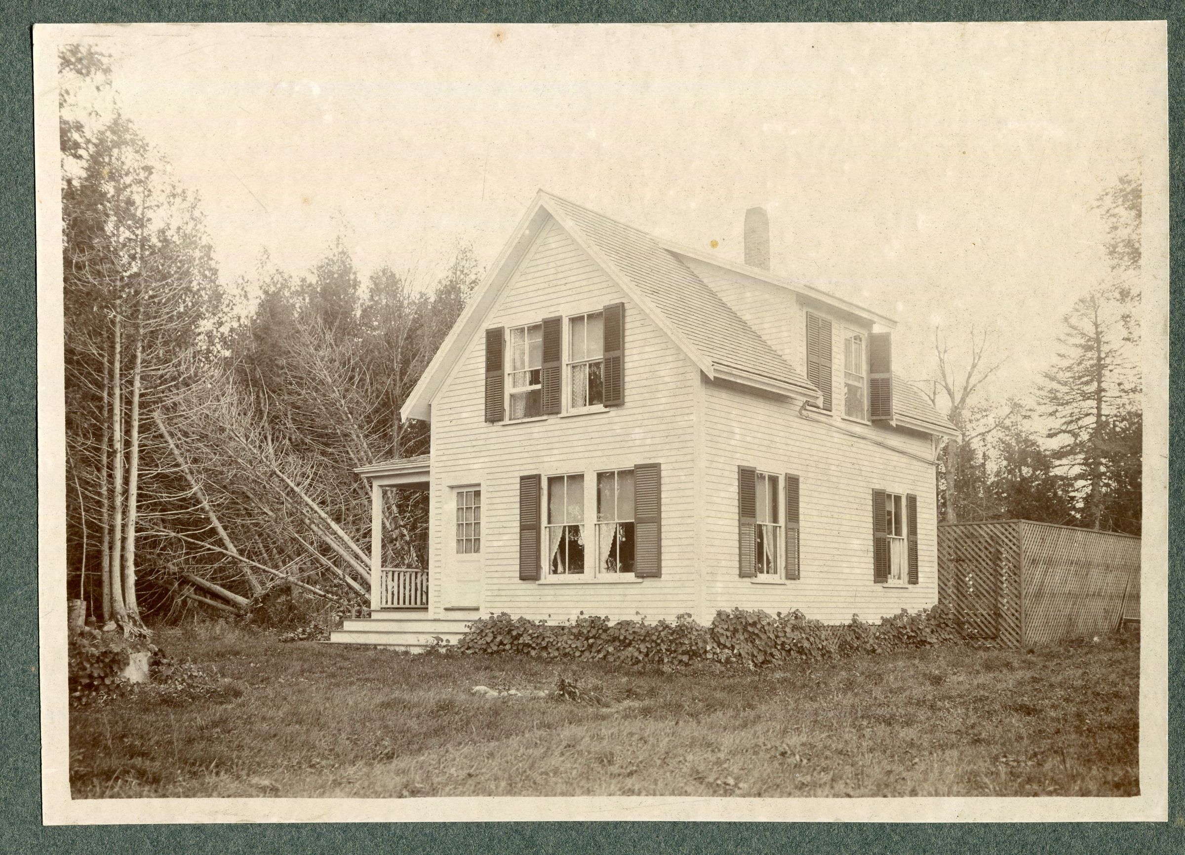 Frederick Pendleton written on back. One and one-half story house with dormer window on one side and porch on the other. 113 Derby Road. Fred Pendleton's house in 1980s.