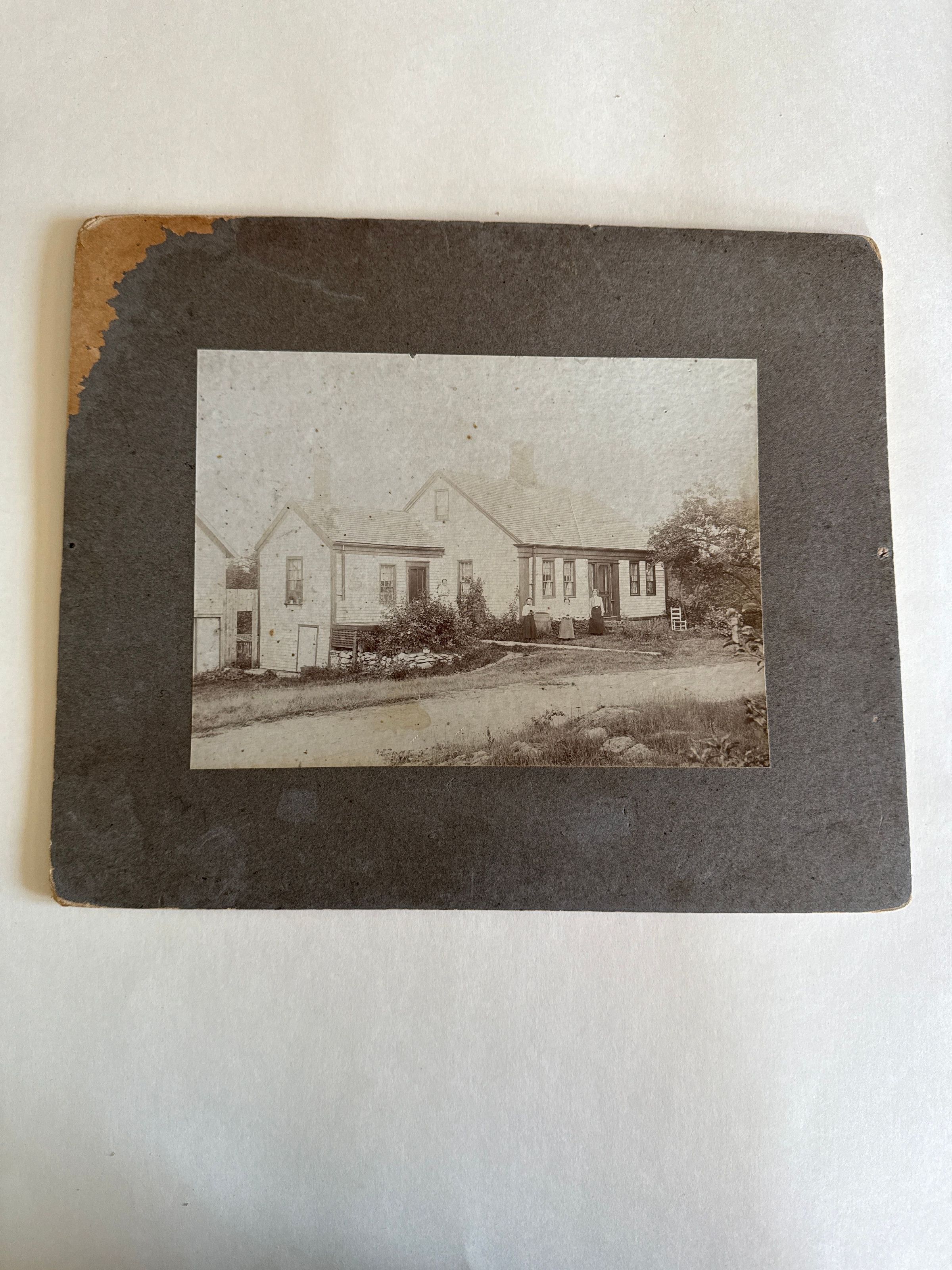 There are a lot of bushes in front of the addition. A walk appears to lead to the front door of the addition. A woman stands near the door, and three women stand in front of the main building. A dirt road runs across the foreground. On back is written "Maria Durgin, Laura Pendleton, Stella Durgan, Mary Ella Carver. Sprague house now"