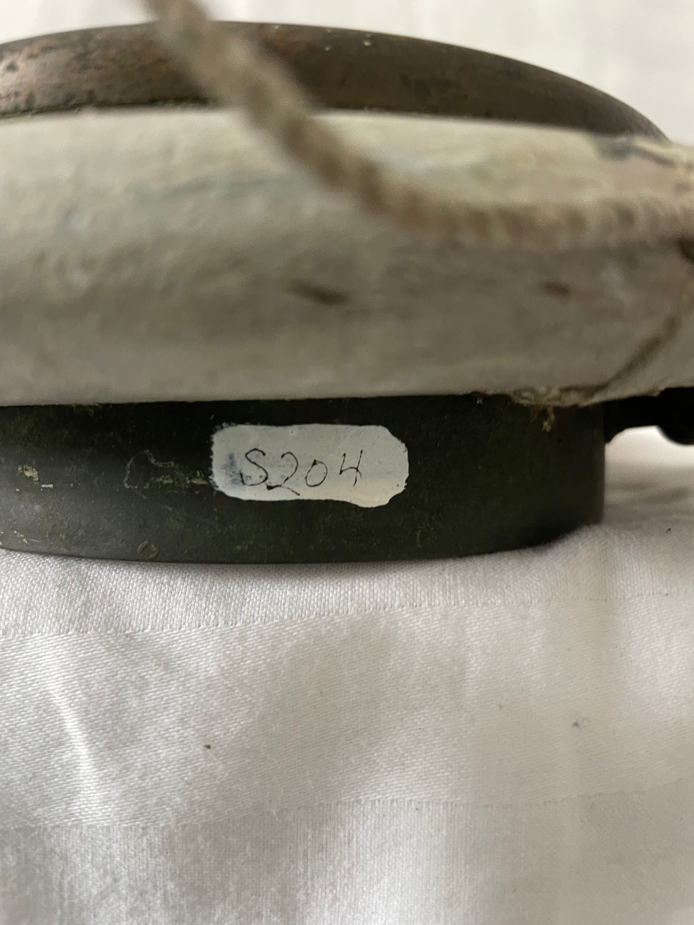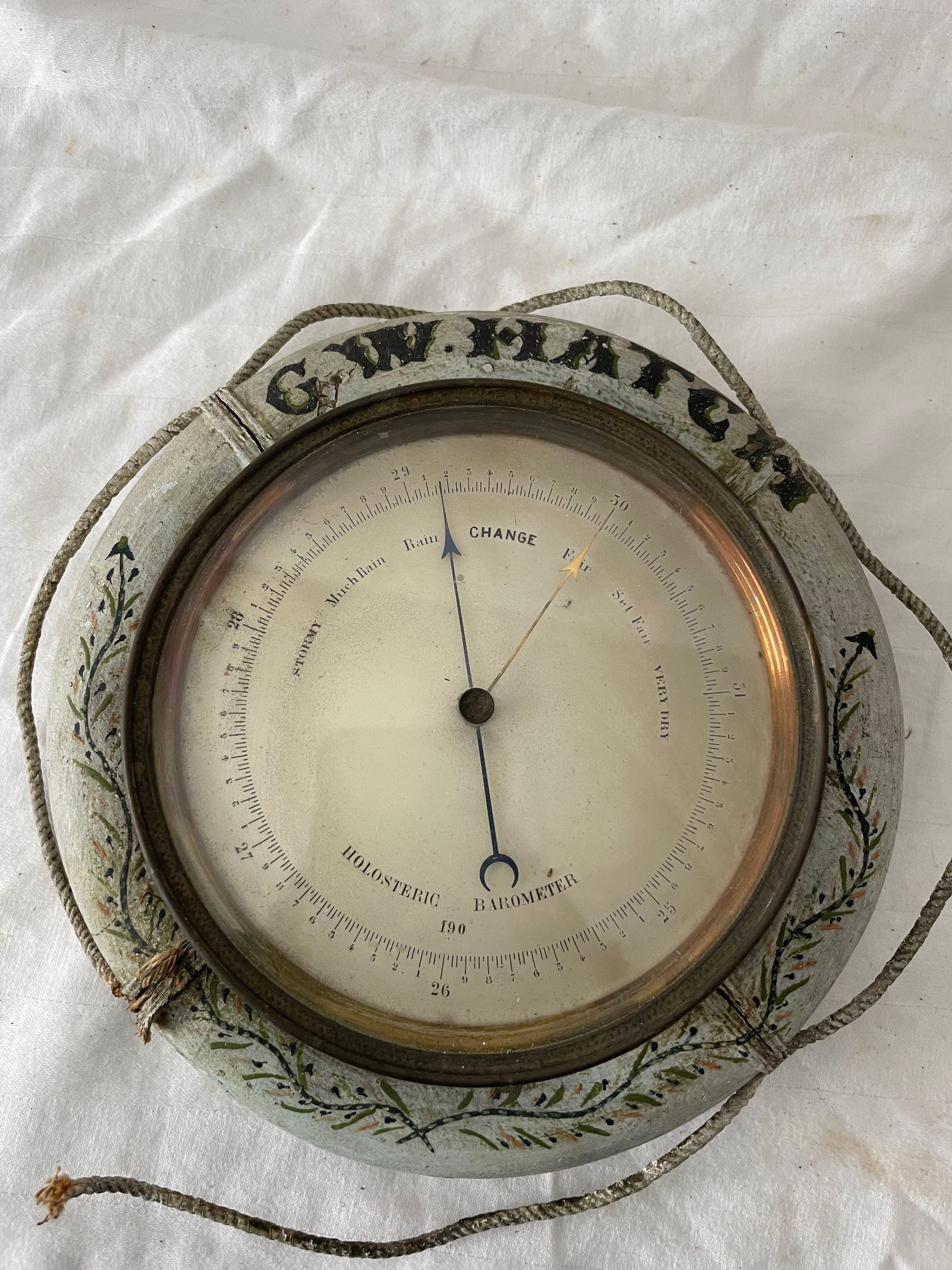 A wooden cased barometer with delicate painting of a vine and a beautiful gold needle in the center. It measures how stormy the day was.