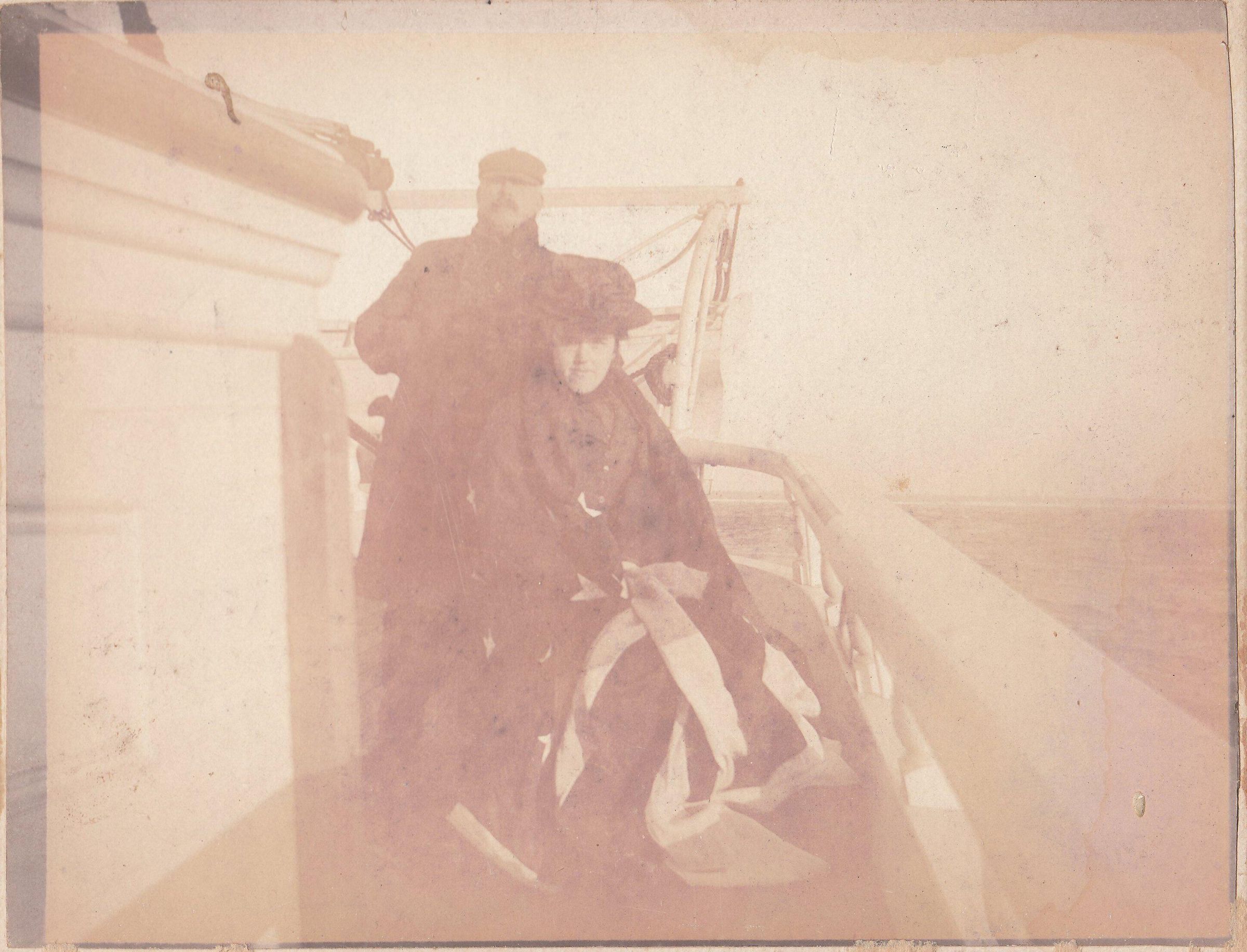 Faded photo evidently taken on board a vessel, showing a woman in coat and hat, partly wrapped in a flag. She is seated. Behind her stands a man with his coat collar turned up and wearing a cap.
