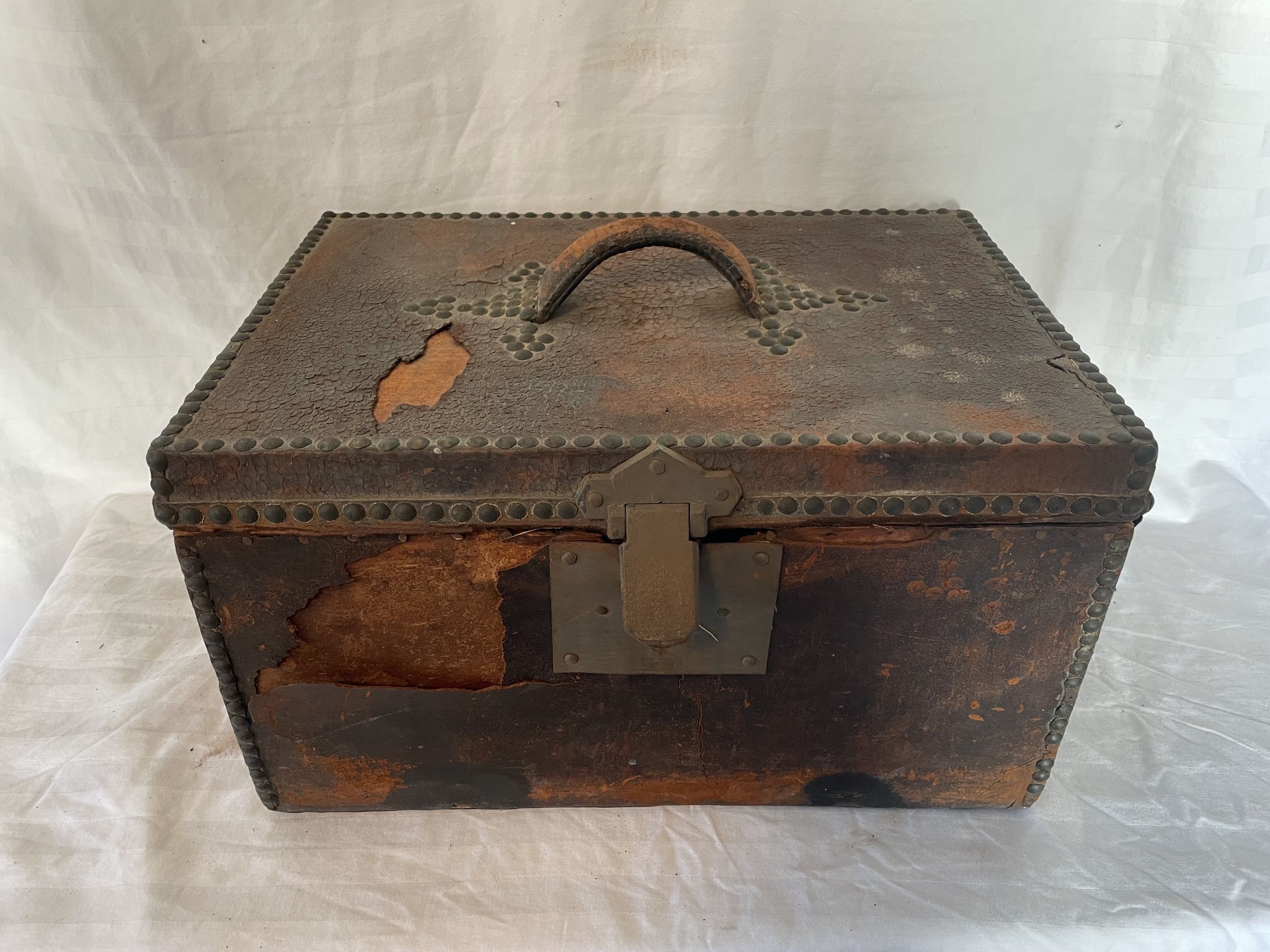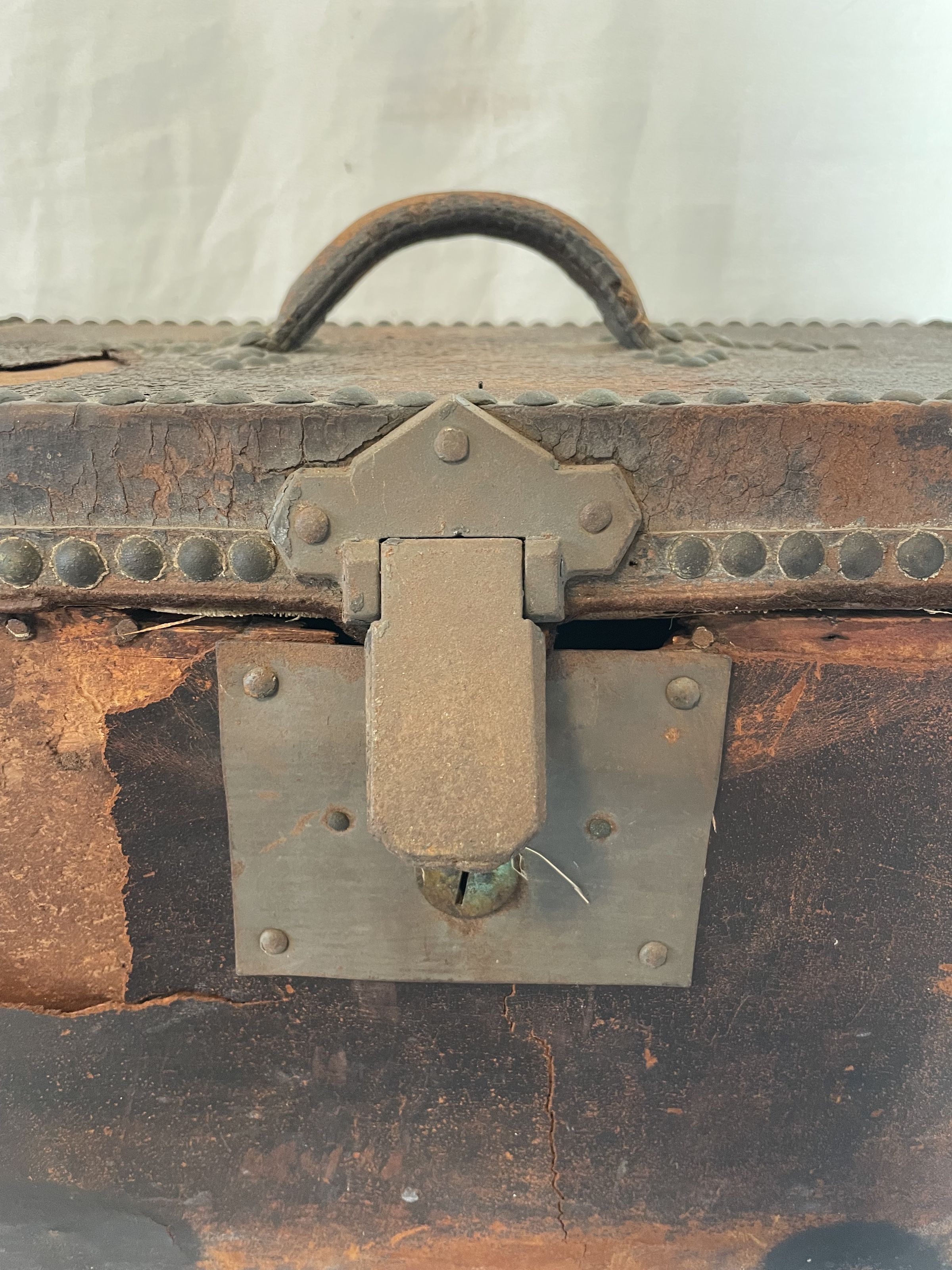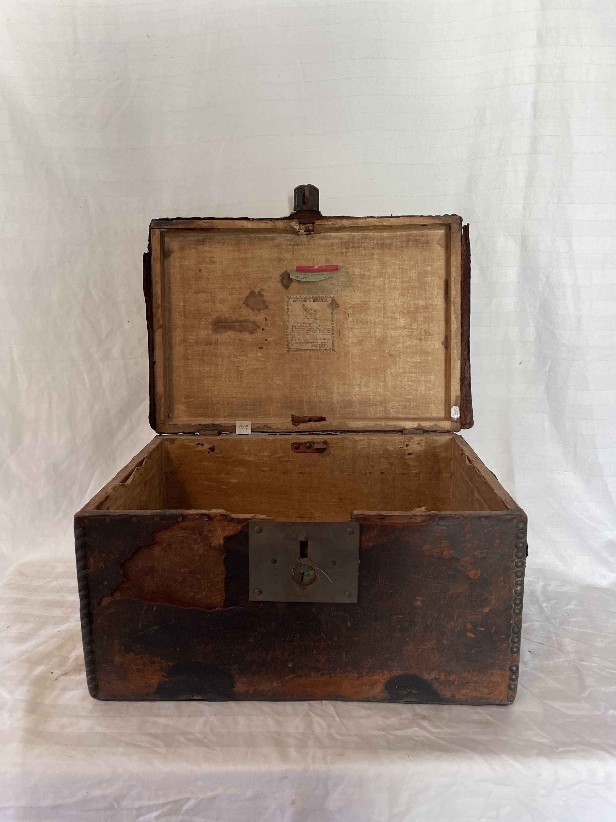 A Boston wooden box with leather handle and details, and lined with metal studs. the top also features a design of metal studs. The inside has a label that reads; Shelton and Cheever. The inside made of wood and empty.