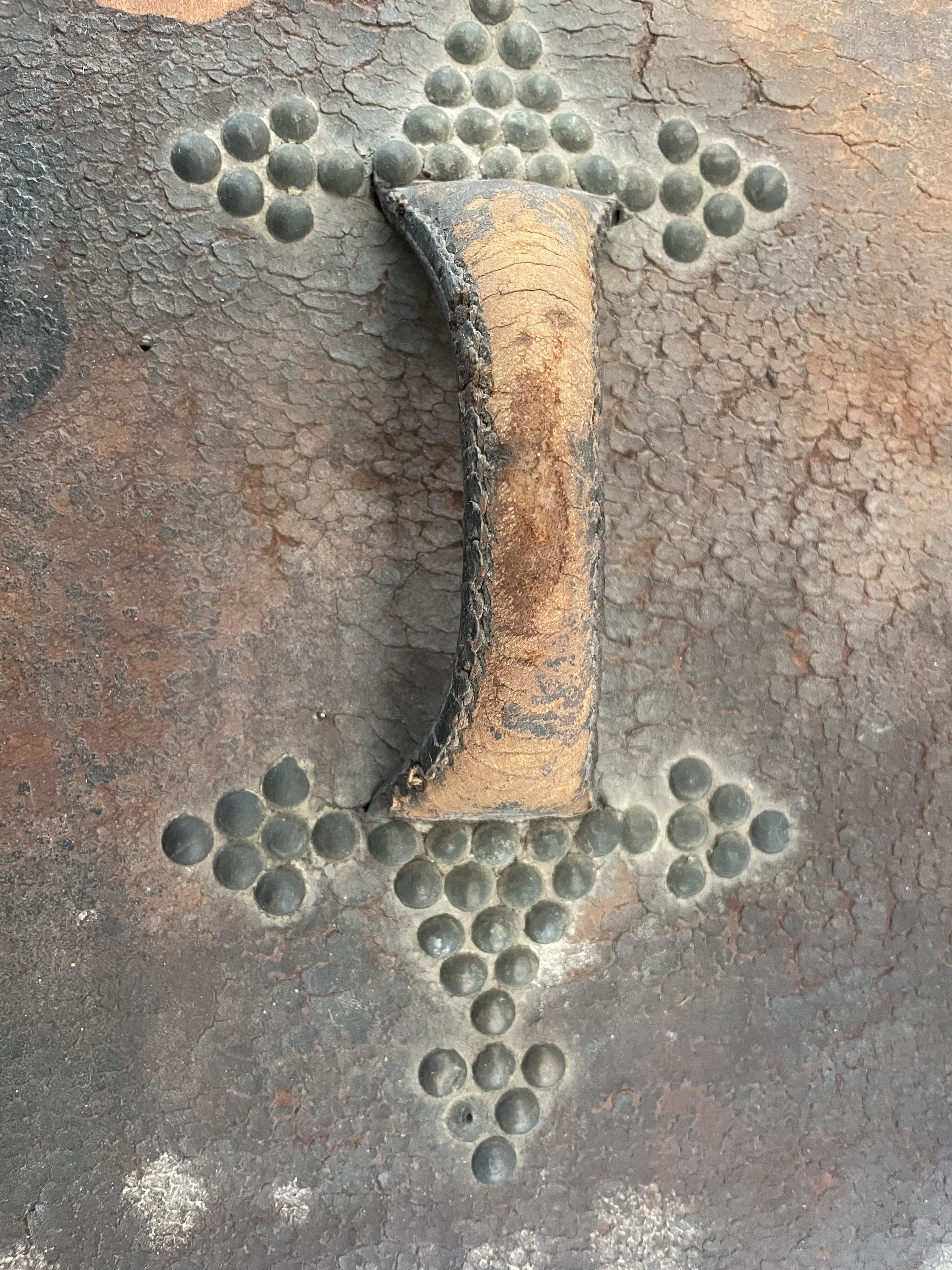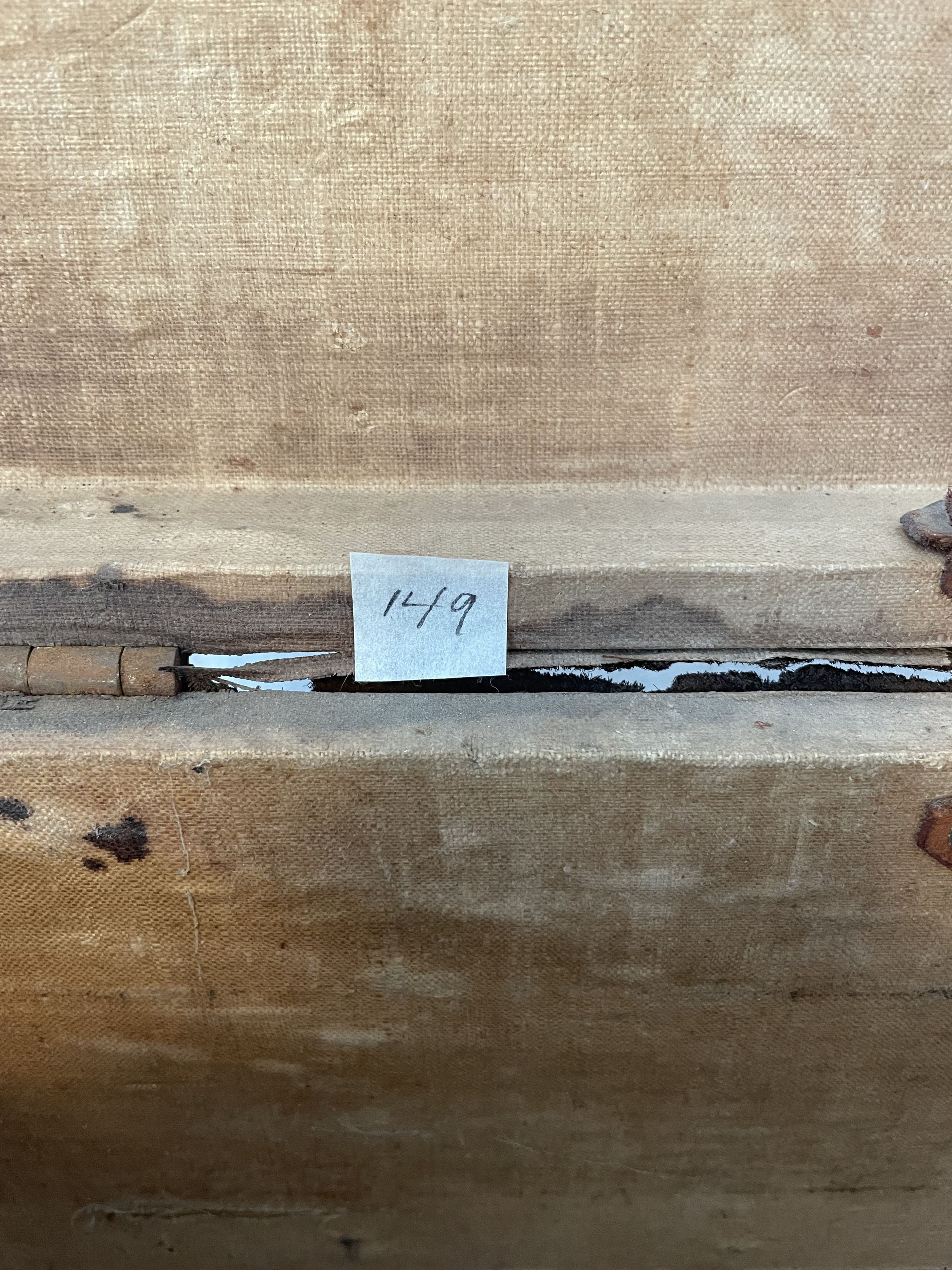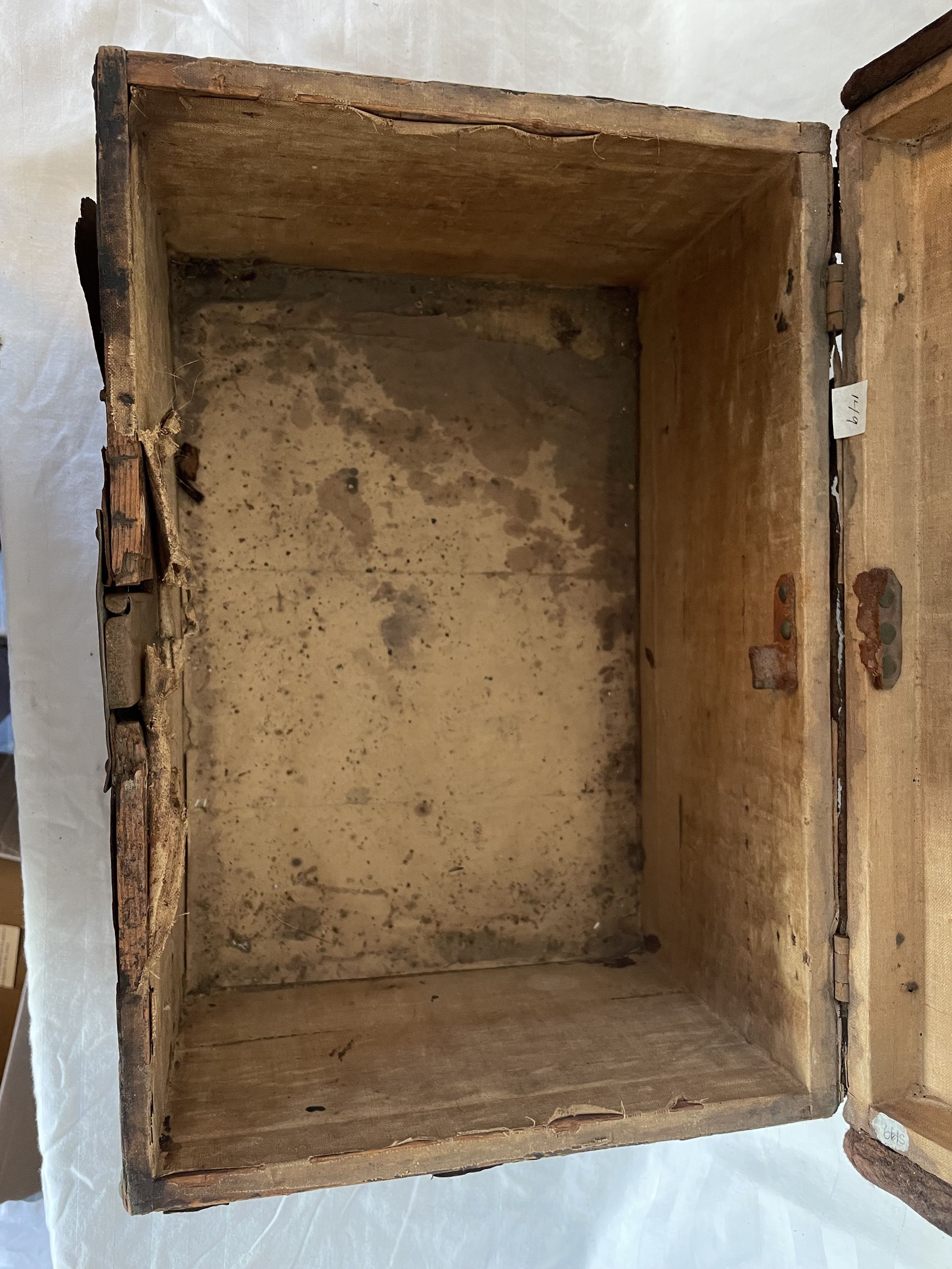 A Boston wooden box with leather handle and details, and lined with metal studs. the top also features a design of metal studs. The inside has a label that reads; Shelton and Cheever. The inside made of wood and empty.